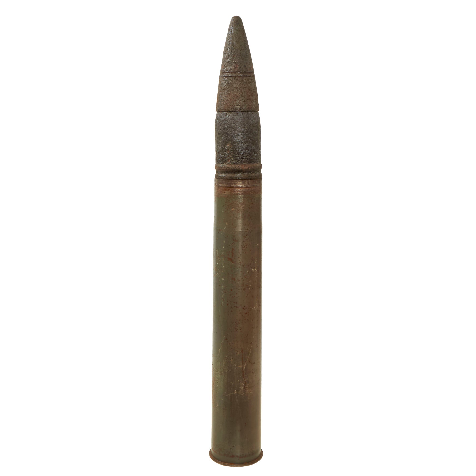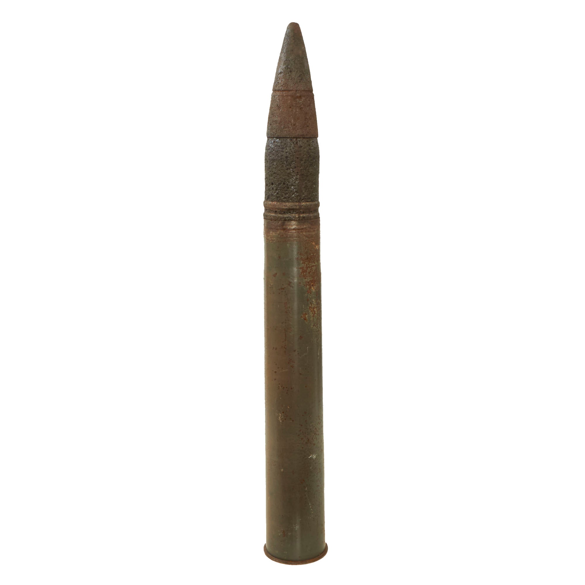 This indicates manufacture by Metall u. Eisen GmbH, Nuernberg. The casing measures 22½” tall on its own, and with the projectile inserted, it measures roughly 34½” tall. The projectile appears to have been added to the casing at one point, which has caused some oxidation to the casing itself. The projectile retains a piece on the bottom which still unscrews to show the interior of the projectile.