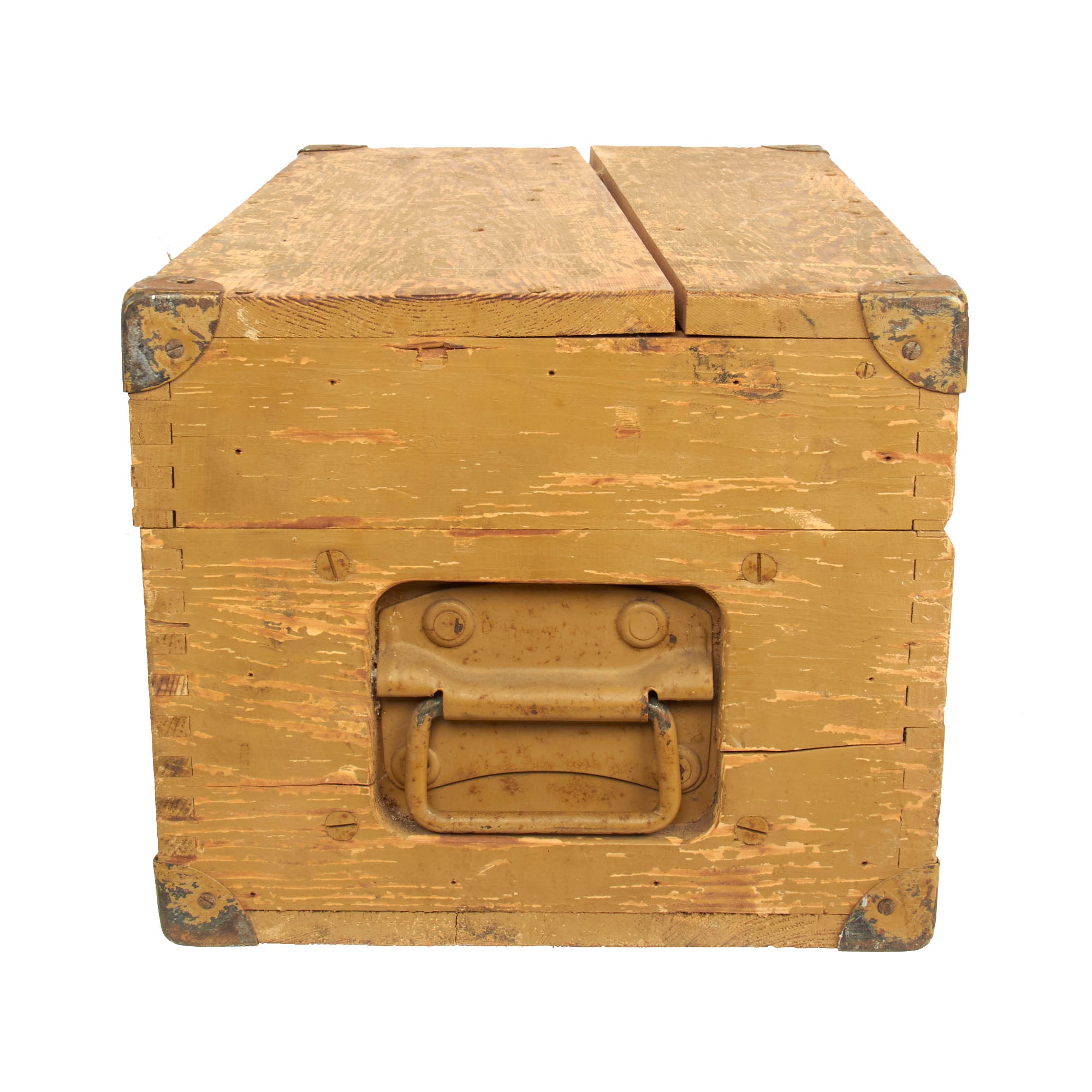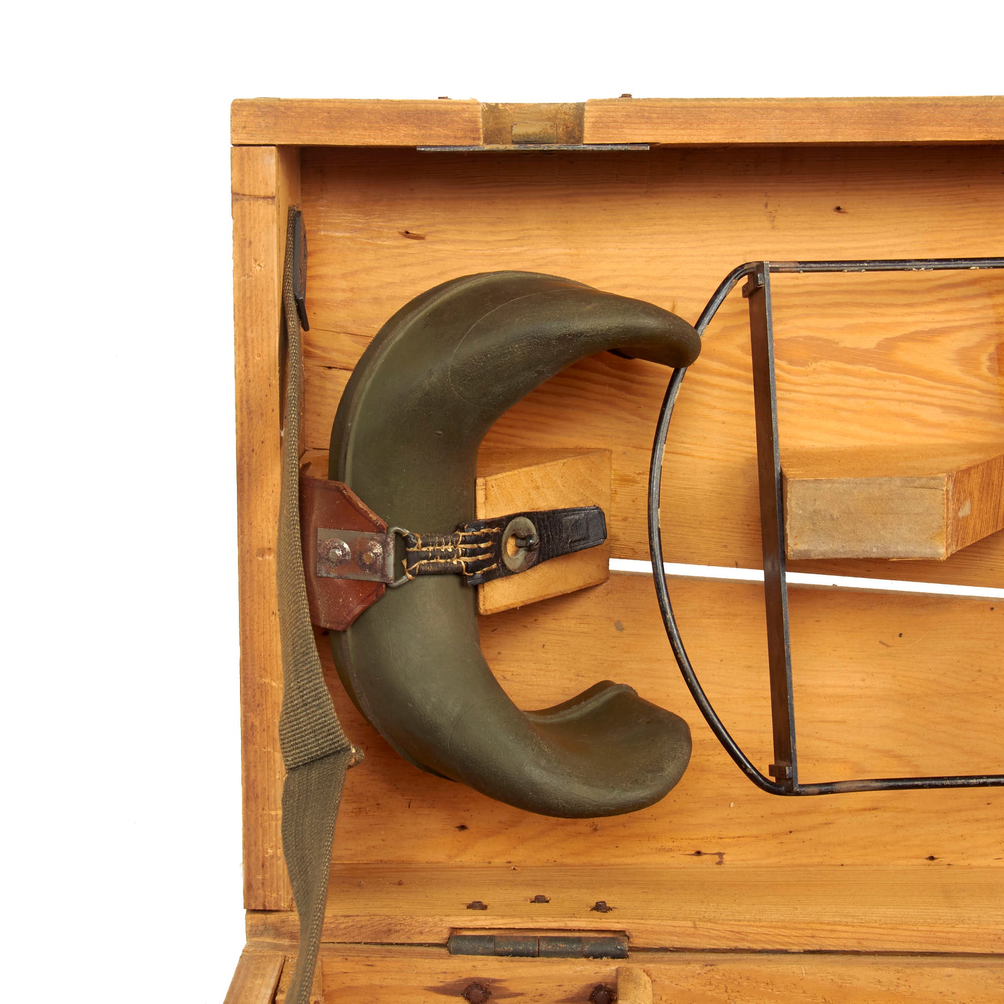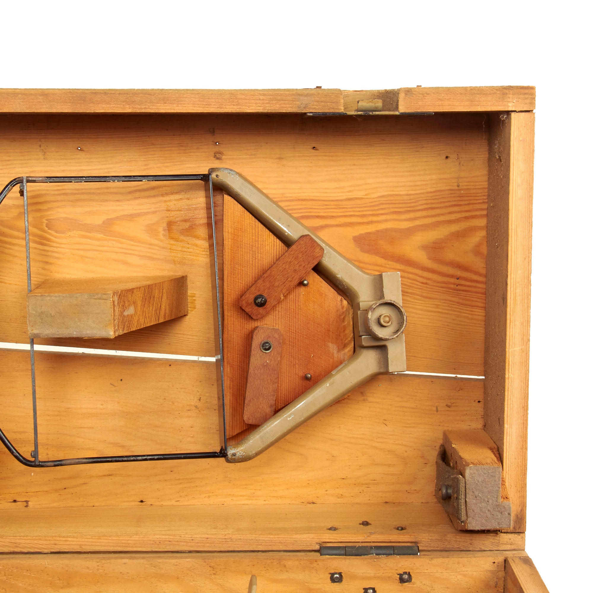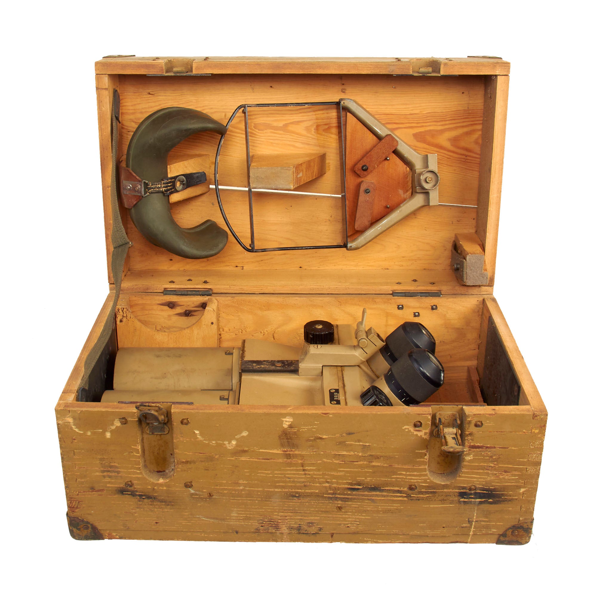 This set is fully operational, with clear optics, and fully functional focus and width adjustments. The original wood transit case is in wonderful condition with working latches and handles. Much of the original paint is still present and there is minimal cracking present. The interior still retains the brow pad and handle secured in place and is missing the other components. The box measures approximately 19” x 10” x 11 ¼” and total weight is 37.7 Pounds.