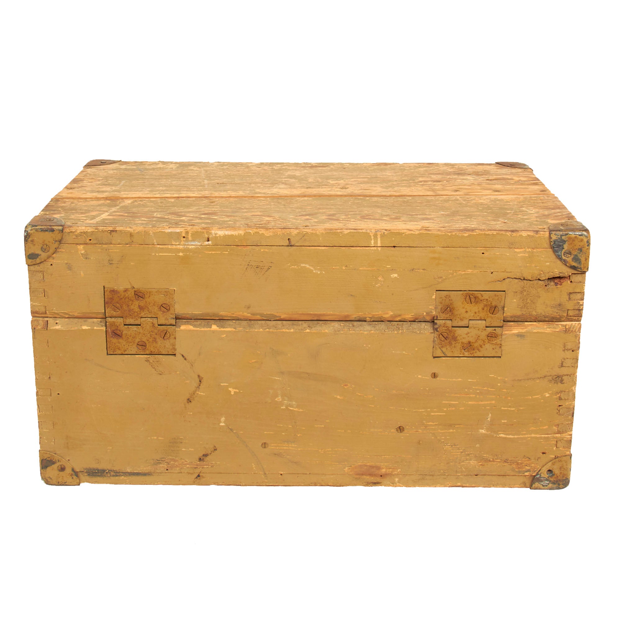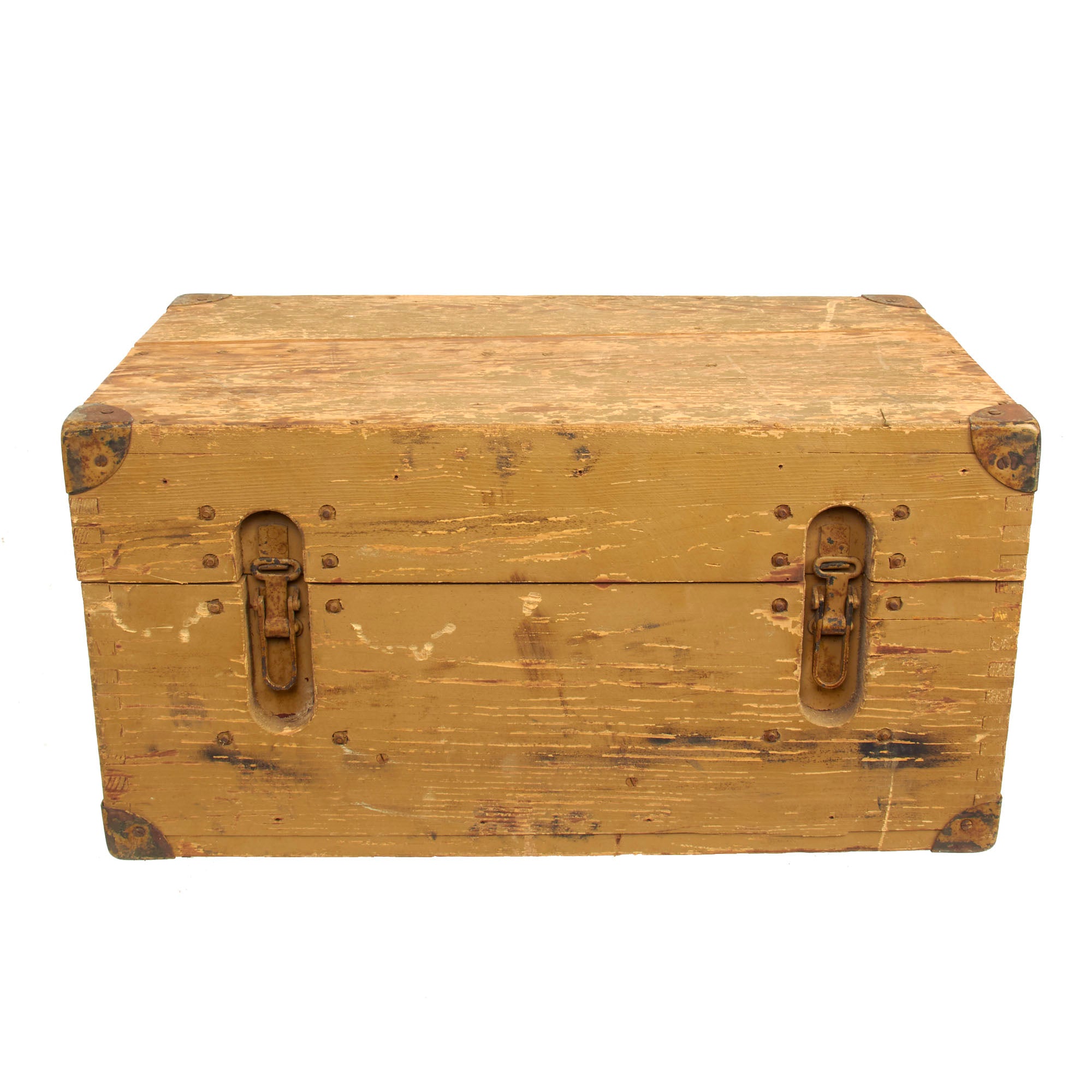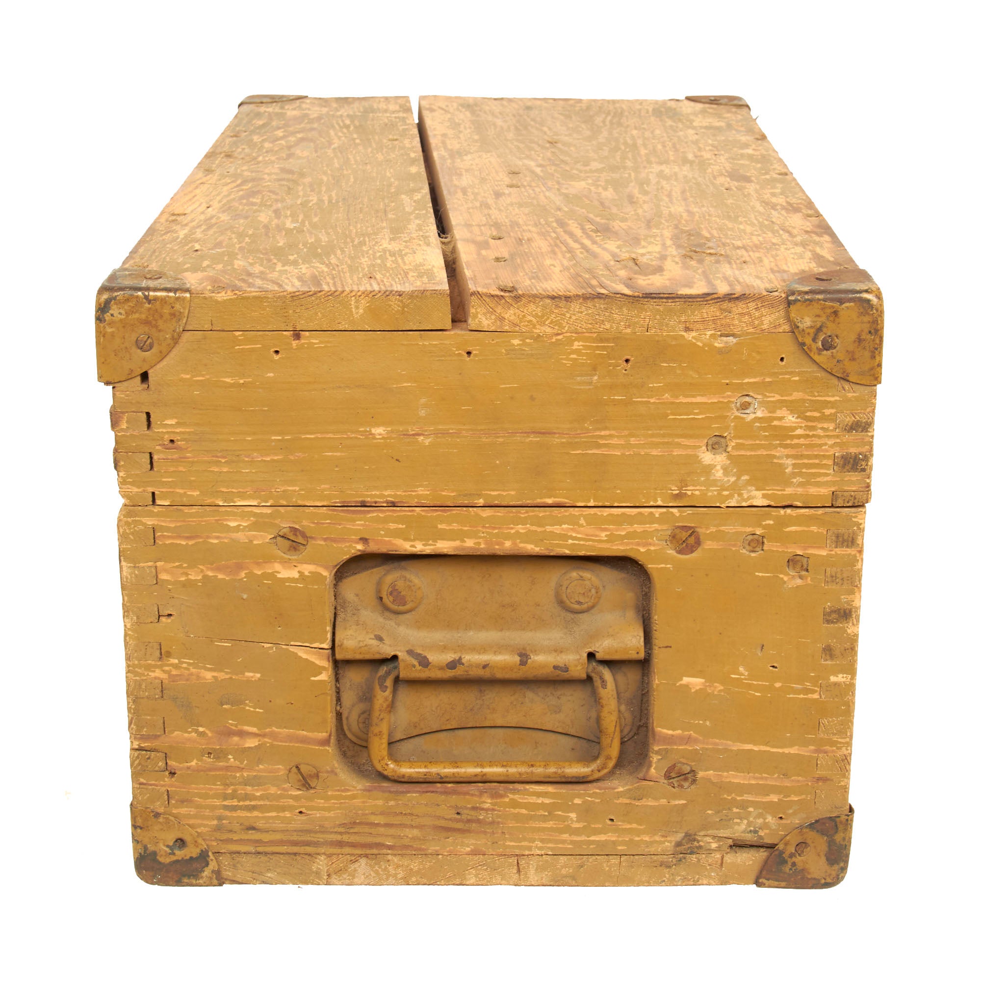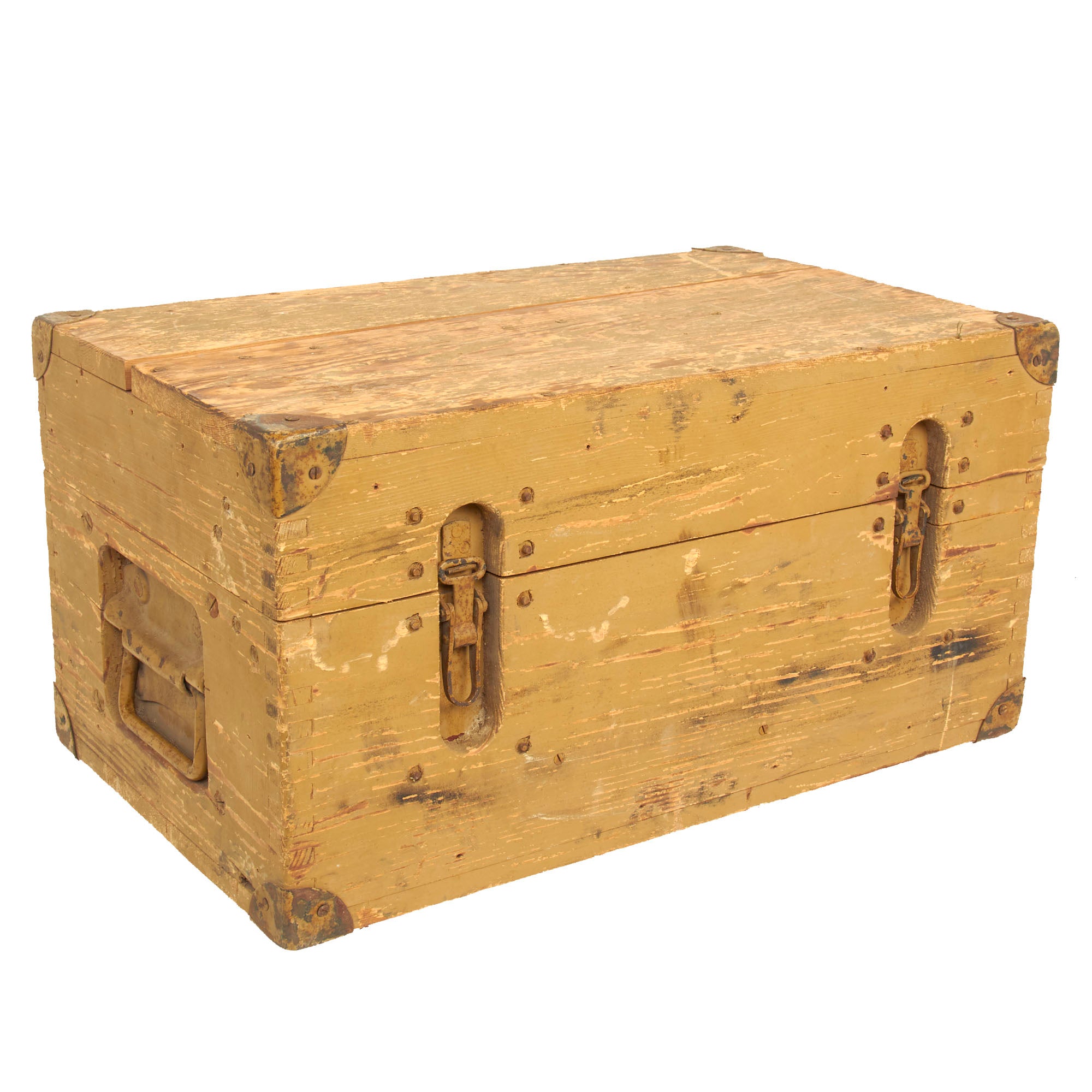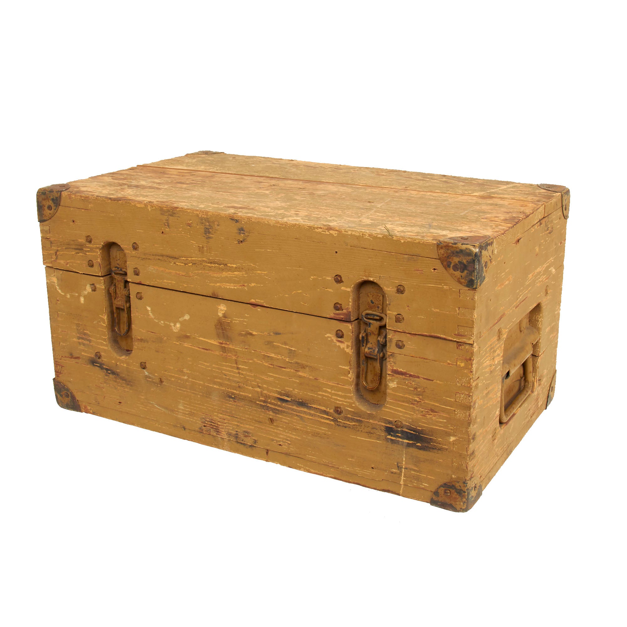 This set is fully operational, with clear optics, and fully functional focus and width adjustments. The original wood transit case is in wonderful condition with working latches and handles. Much of the original paint is still present and there is minimal cracking present. The interior still retains the brow pad and handle secured in place and is missing the other components. The box measures approximately 19” x 10” x 11 ¼” and total weight is 37.7 Pounds.
