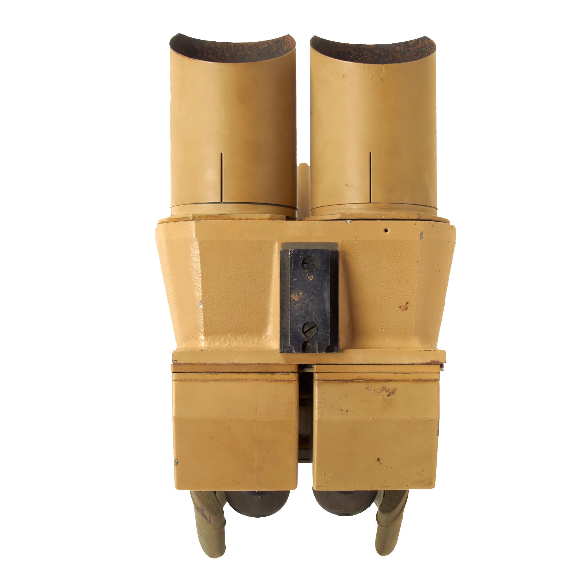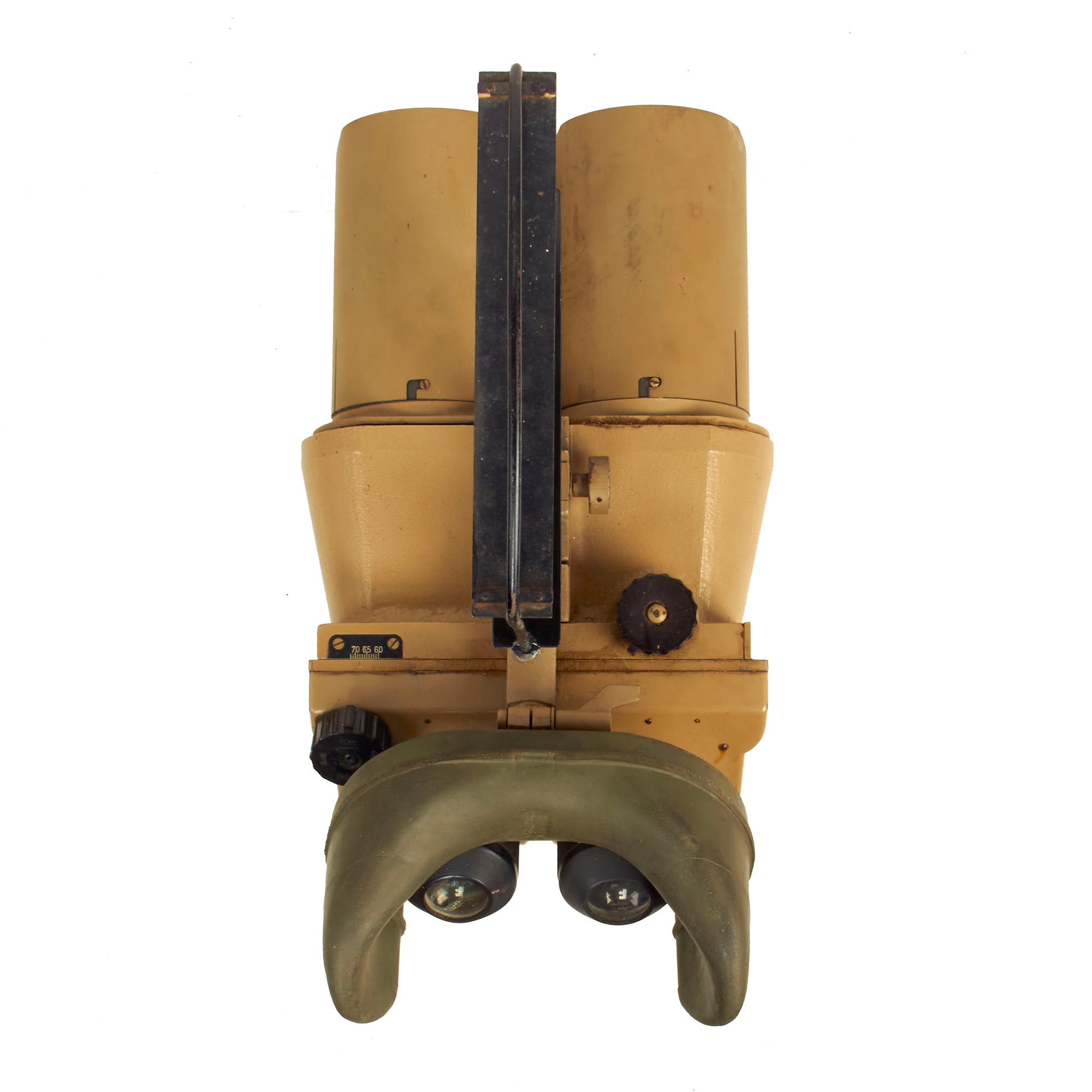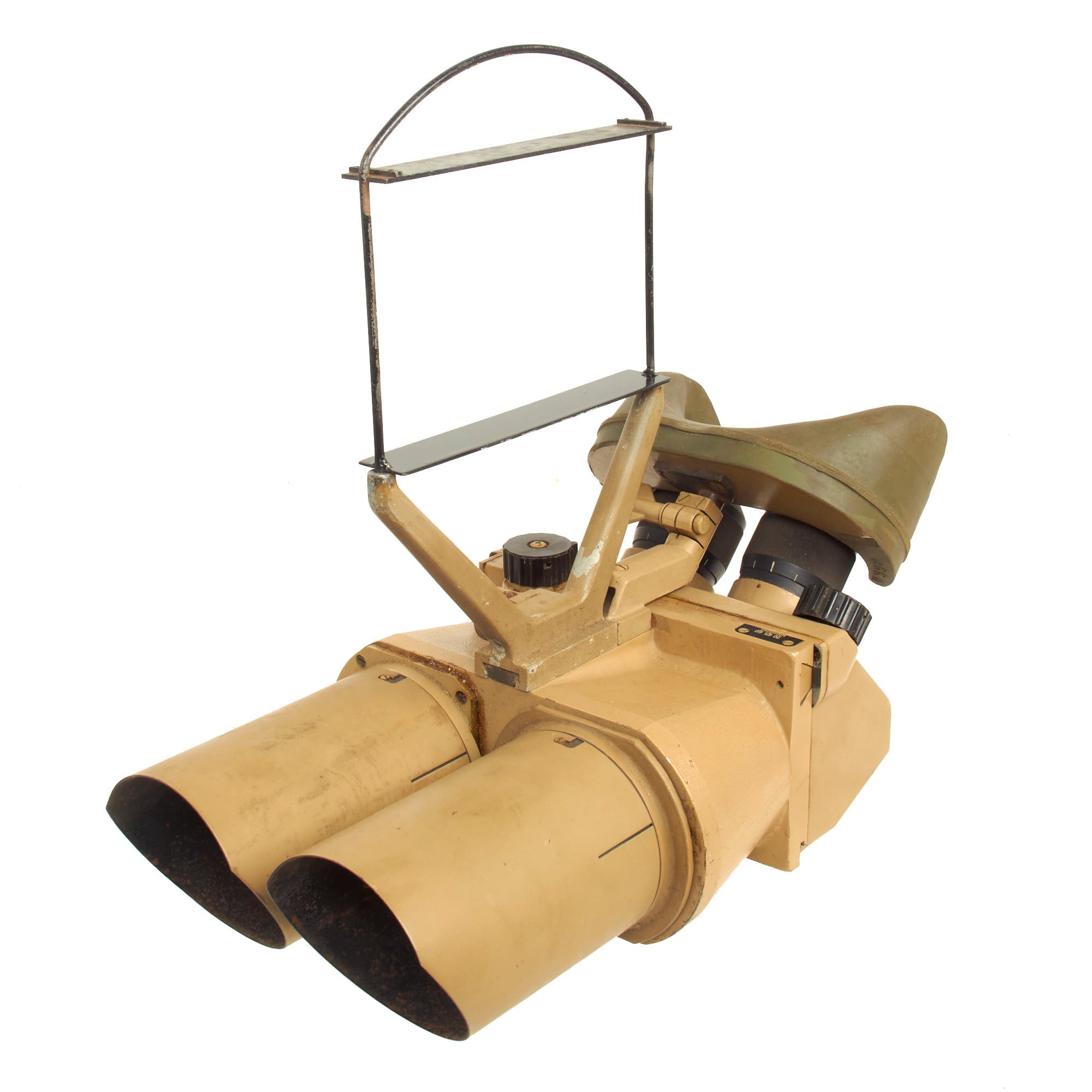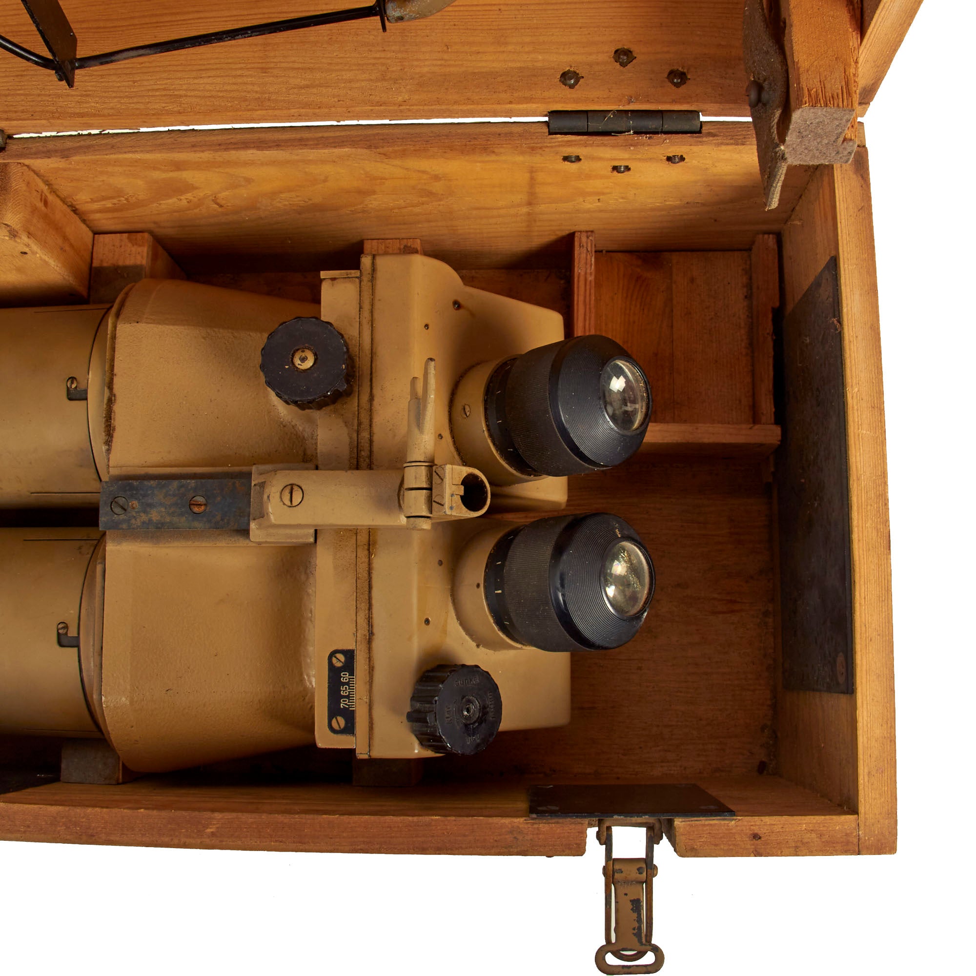 Most commonly seen being used by the KRIEGSMARINE (German Navy) on Ship Bridges and on Conning Towers of U-Boats, these are the giant 10 x 80 Binoculars so much favored in WW2. There are adjustments for eye relief, width and a selection of various tinted filters, which rotate into place using the control on the left side. The dial is labeled klar (clear), hell (light), mittel (medium), and dunkel (dark). In a typical example of German WW2 era (over)engineering, the control actually controls a mechanism that swings each individual filter in place on both sides simultaneously. A more modest implementation with filters that were fitted over the eye pieces would have probably been more economical, and less likely to break. The light filters still move correctly.