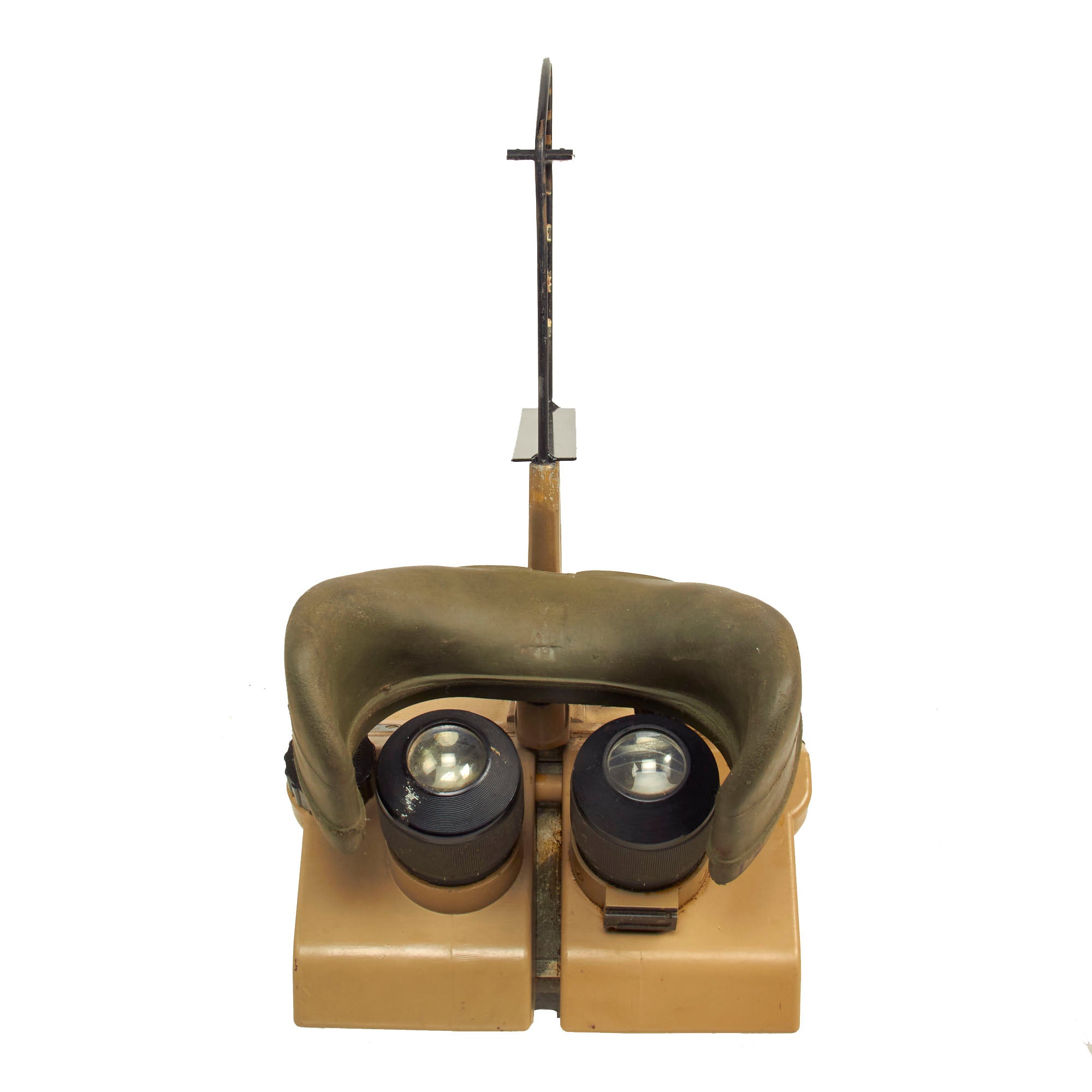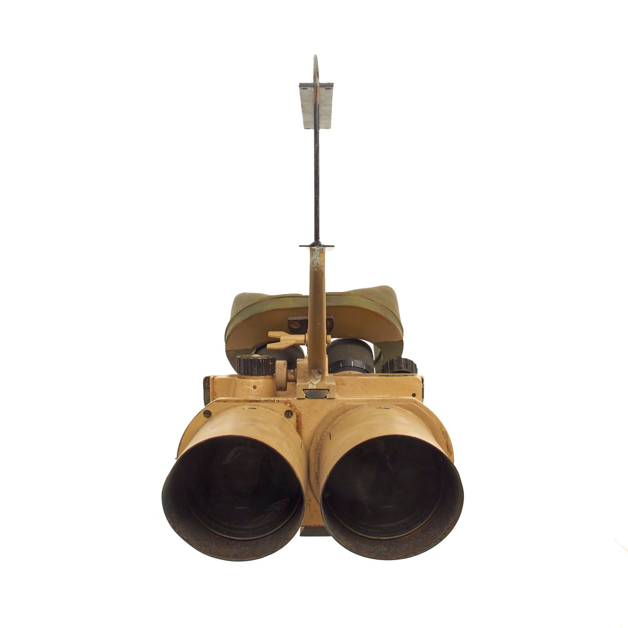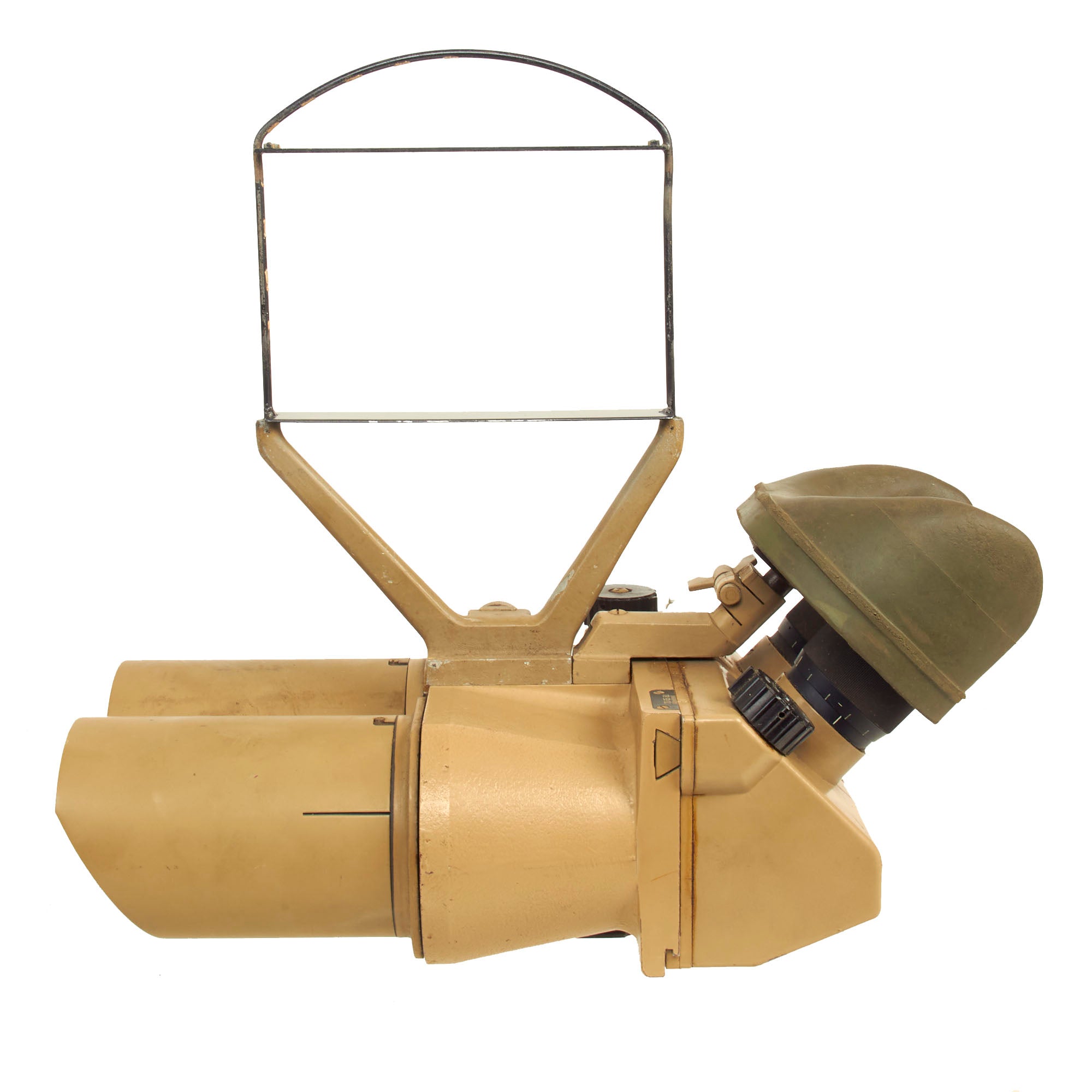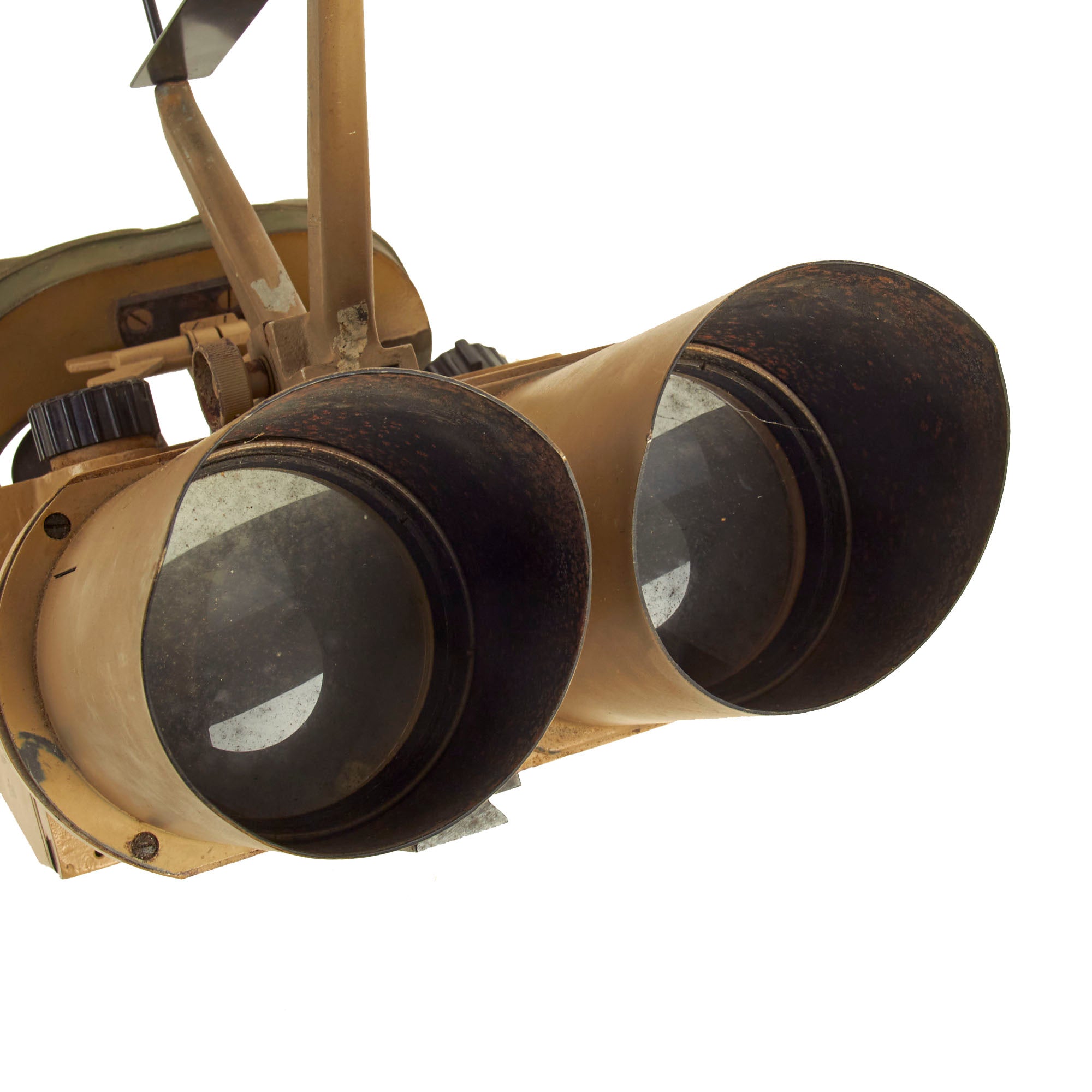 Most commonly seen being used by the KRIEGSMARINE (German Navy) on Ship Bridges and on Conning Towers of U-Boats, these are the giant 10 x 80 Binoculars so much favored in WW2. There are adjustments for eye relief, width and a selection of various tinted filters, which rotate into place using the control on the left side. The dial is labeled klar (clear), hell (light), mittel (medium), and dunkel (dark). In a typical example of German WW2 era (over)engineering, the control actually controls a mechanism that swings each individual filter in place on both sides simultaneously. A more modest implementation with filters that were fitted over the eye pieces would have probably been more economical, and less likely to break. The light filters still move correctly.
