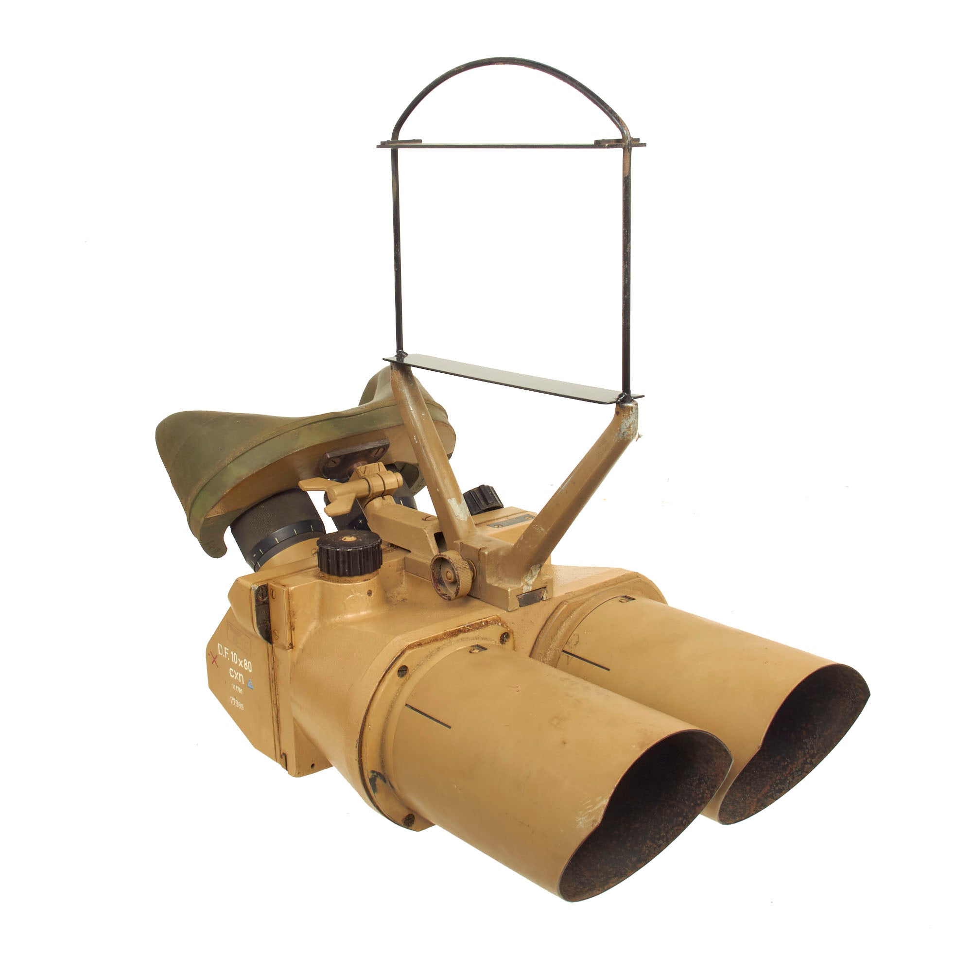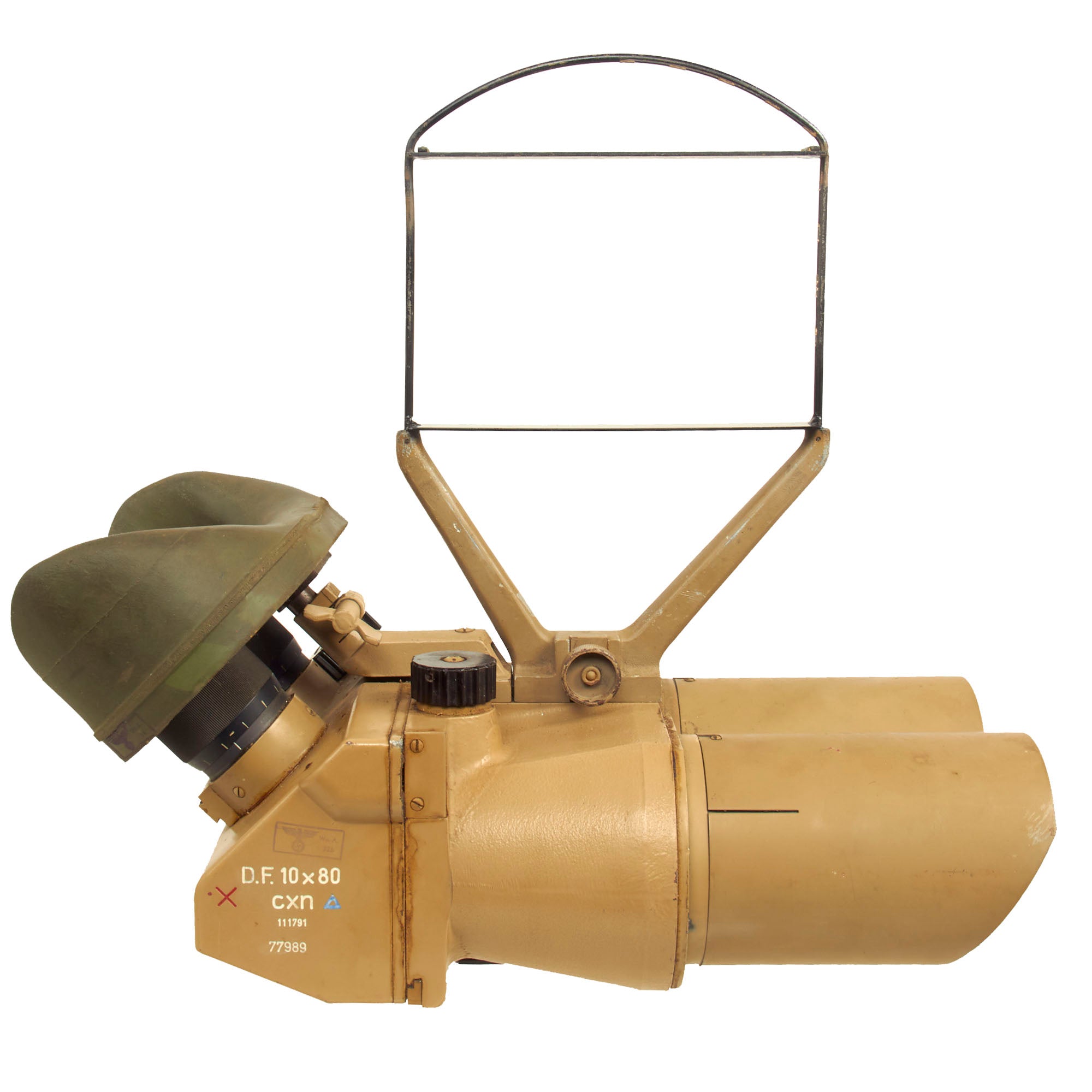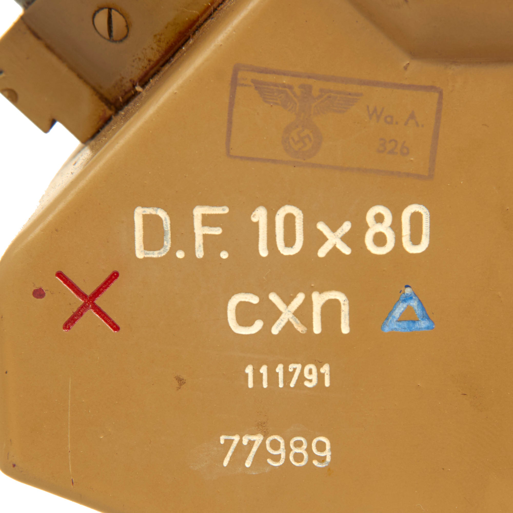 D.F. Is the abbreviation for Doppelfernrohr (double telescope), with 10 x 80 indicating the magnification power of the optics. The German wartime three letter code "cxn" stands for Emil Busch AG of Rathenow, a maker of lenses and optical sights, and under that the set's serial number is given. The colored symbols indicate the type of lubricants used on the set.