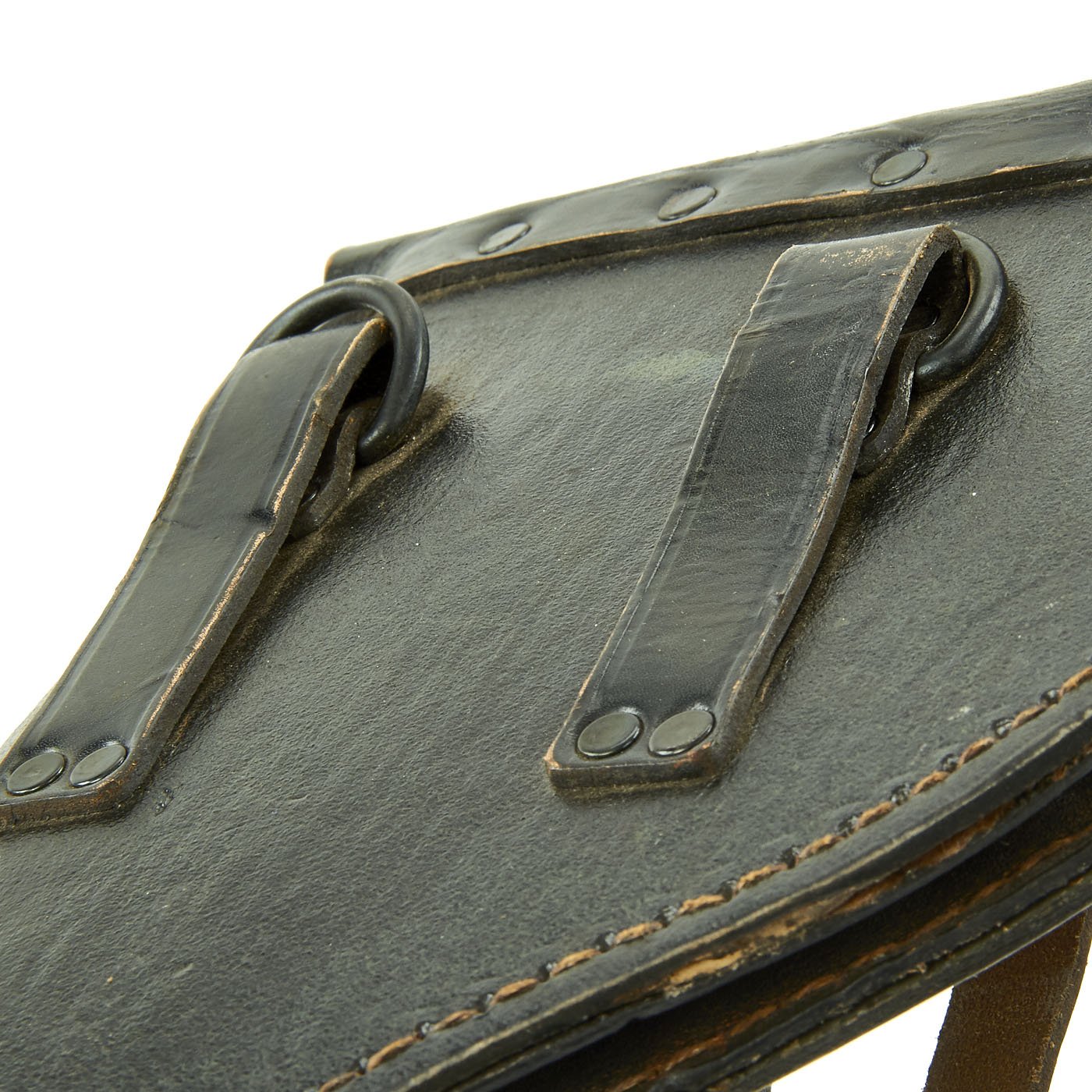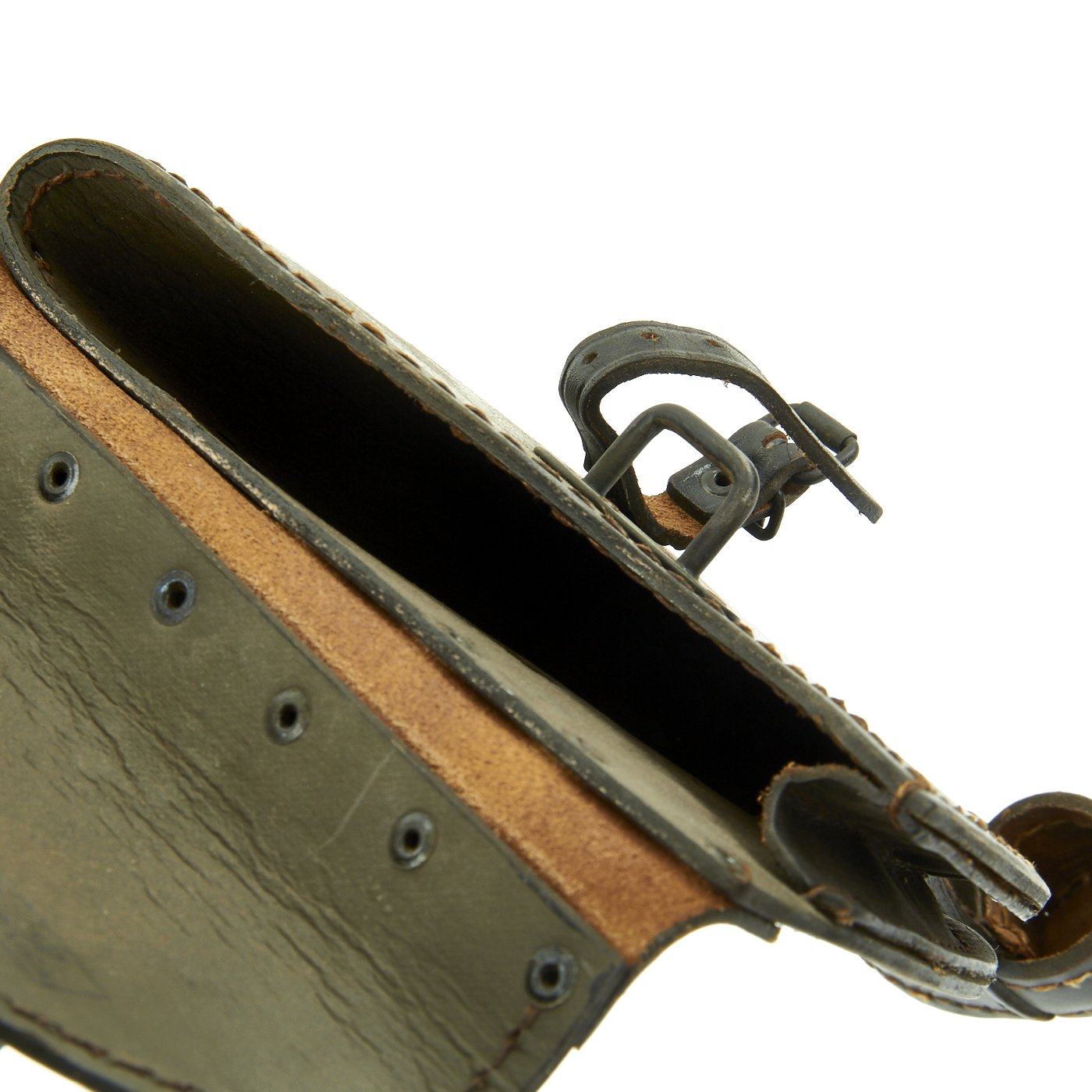 Original Item: Only One Available. This is a great example of the standard German WWII issue heavy black soft shell flare signal pistol holster, as used throughout the war. Unlike most however, this is actually made mostly of "Prestoff", an imitation leather made from pressed paper. We rarely see these holsters intact and in such great condition. The "hinge" for the lid a strip of leather that is riveted on to the flap and body, and the sides and bottom of the holster are also leather, as are the straps and buckle loops.