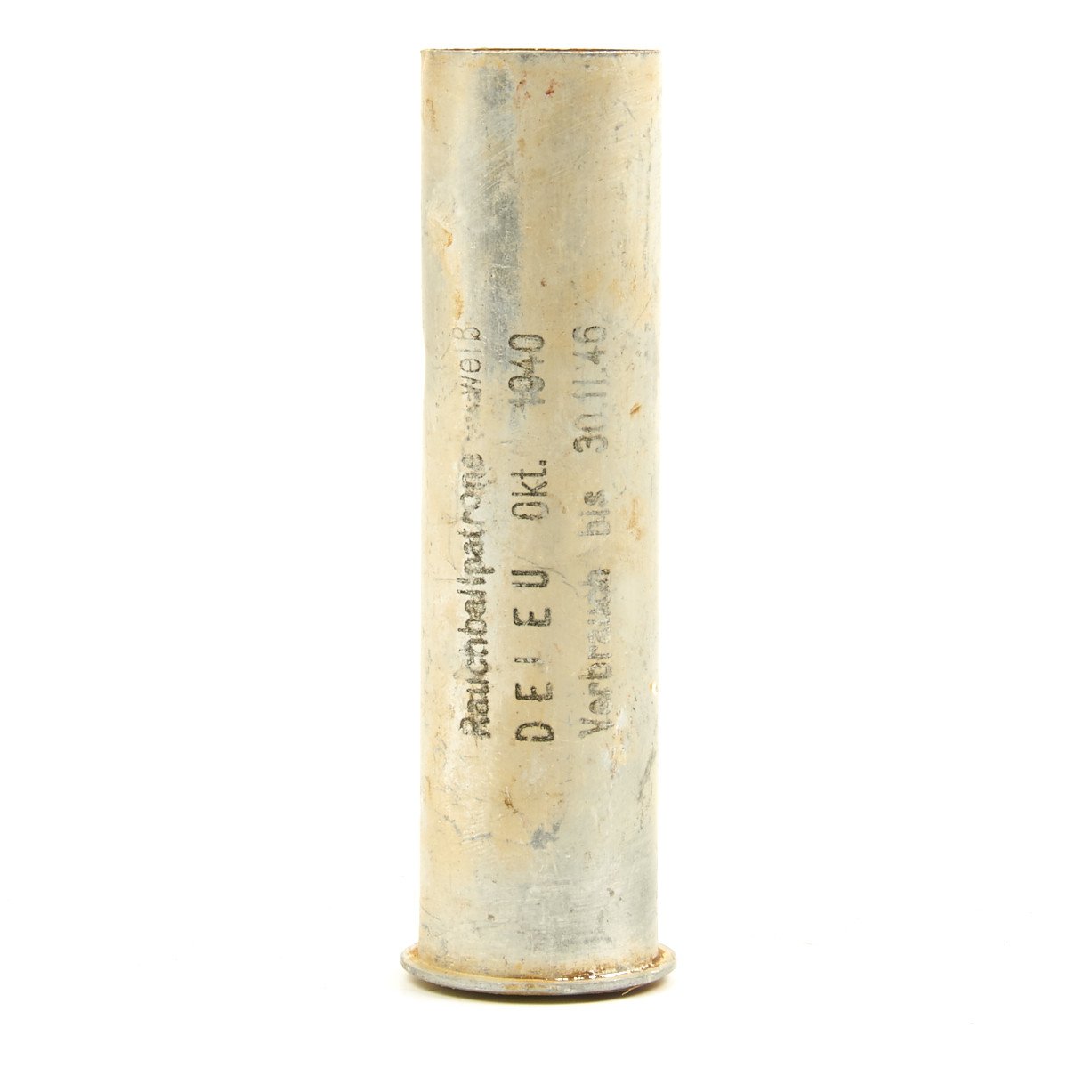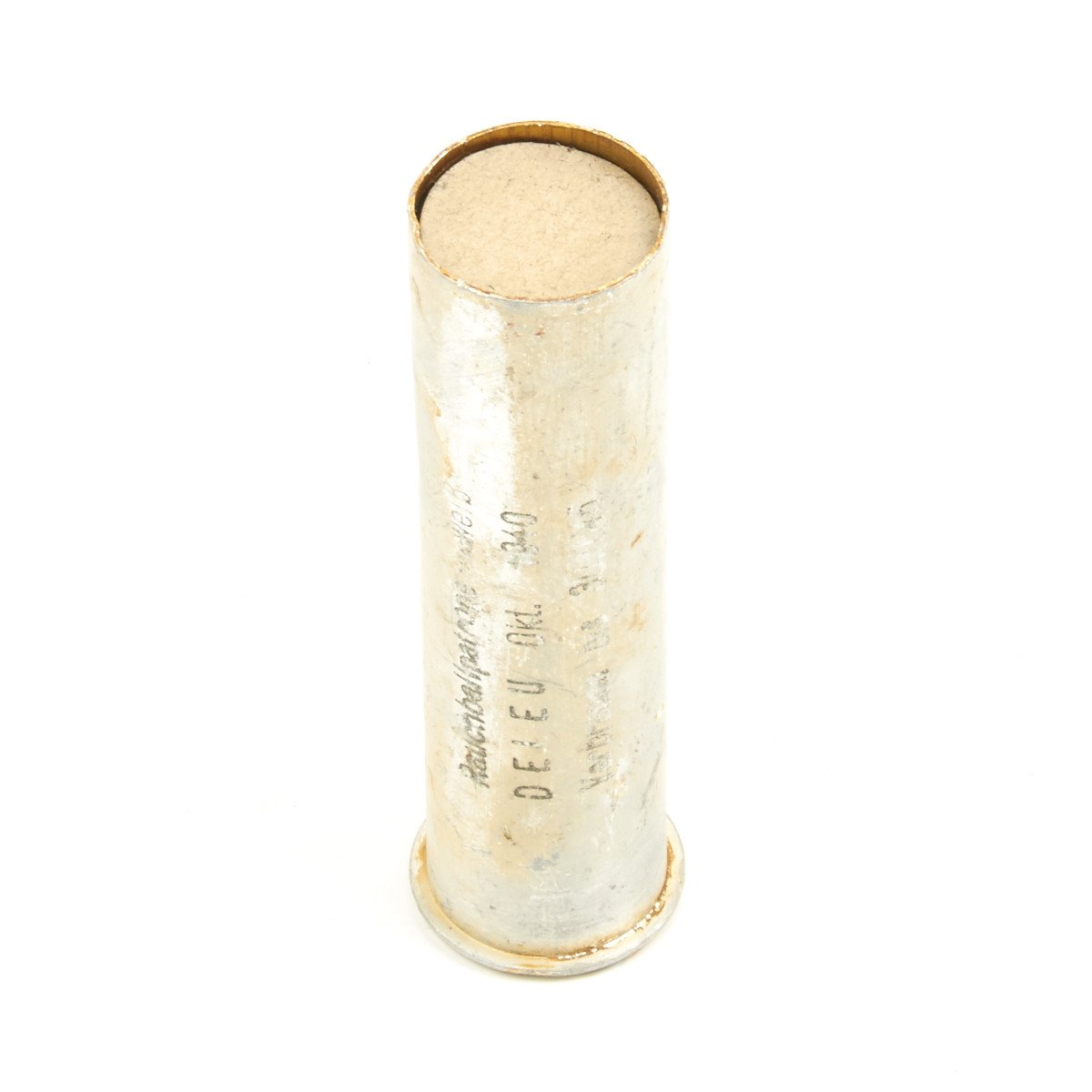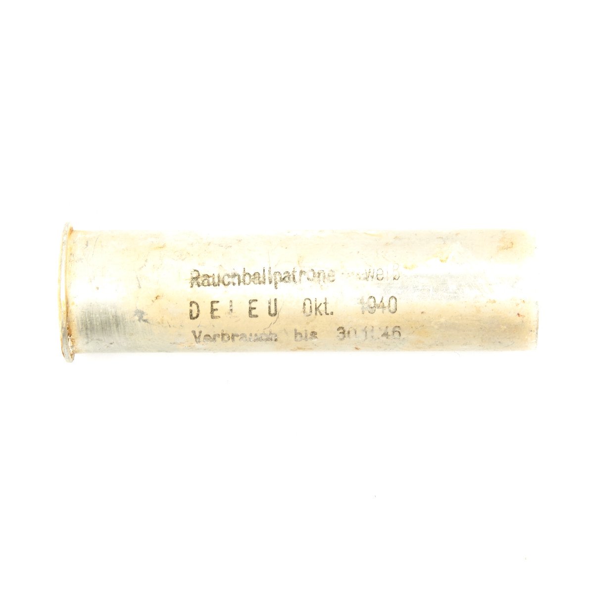 Original Item: Genuine WW2 German 26.5-mm flare signal that produces a ball of white smoke. These are the flares that would have been used in IMA’s Leucht Pistole 42 during the War. The case is made of aluminum and may have a label as follows, although many have faded: The first line identifies the type of signal, line two shows the manufacturer and date of manufacture, and line three is the expiration date, if present.