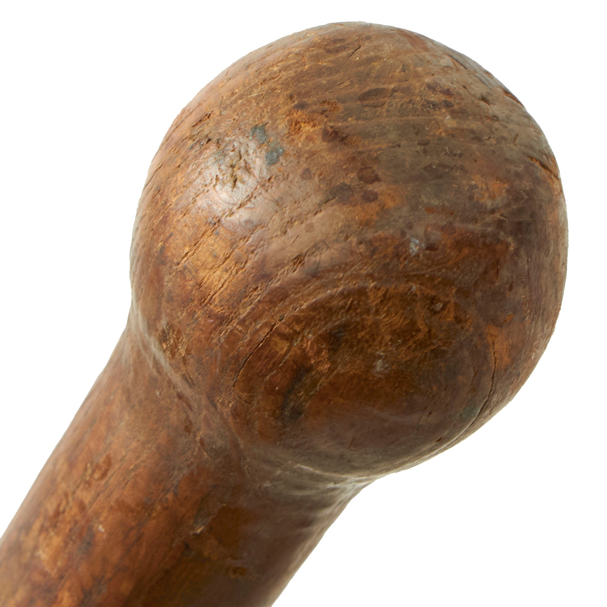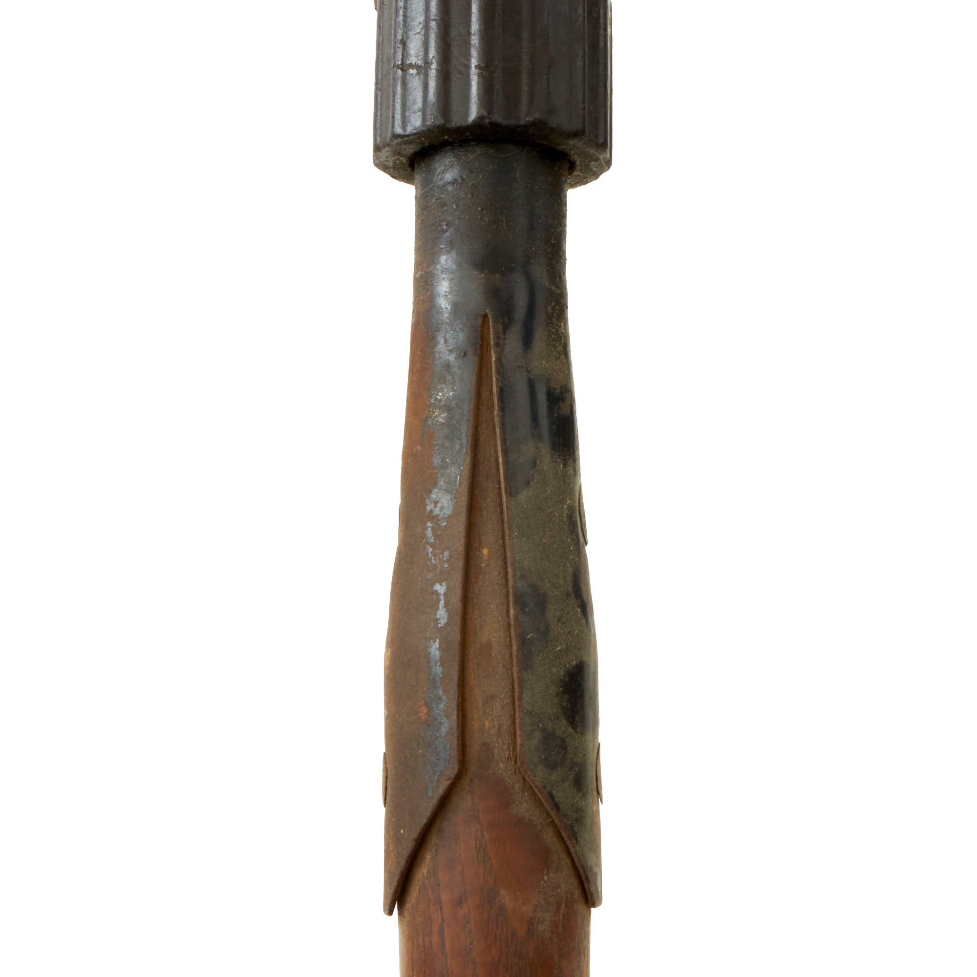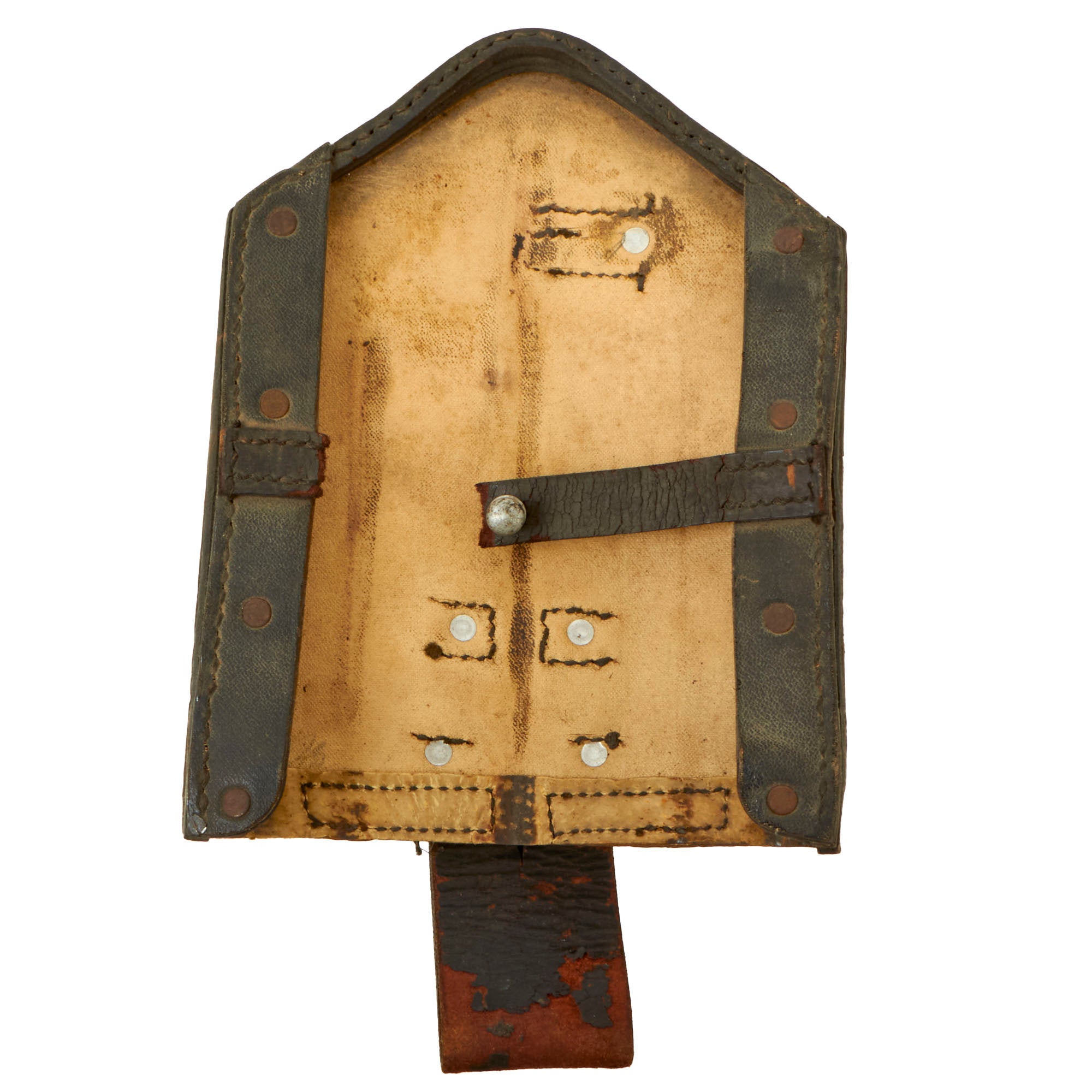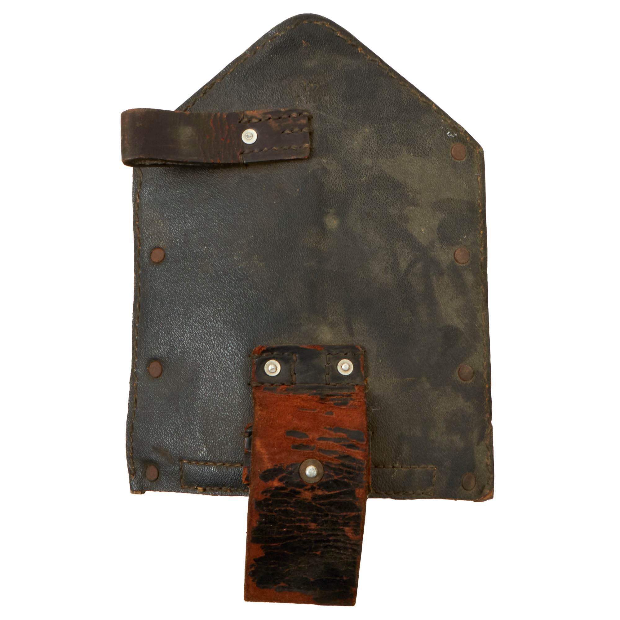 The shovel is in very nice condition with the original in "Wehrmacht finish". The German military blued their shovels rather than painted them. The shovel has a maker mark, VBW on the back. The shaft is marked with a plus sign carved into the wood. The rare Presstof carrier is marked bmd 41 for 1941 production by Max G. Müller of Nürnberg O. in Bavaria, who was known leathermaker of the time that produced holsters, saddles and other leather goods.The leather strap on the carrier has broken and the top flap is partially detached, and the belt carrier on the opposite side is very cracked and fragile.