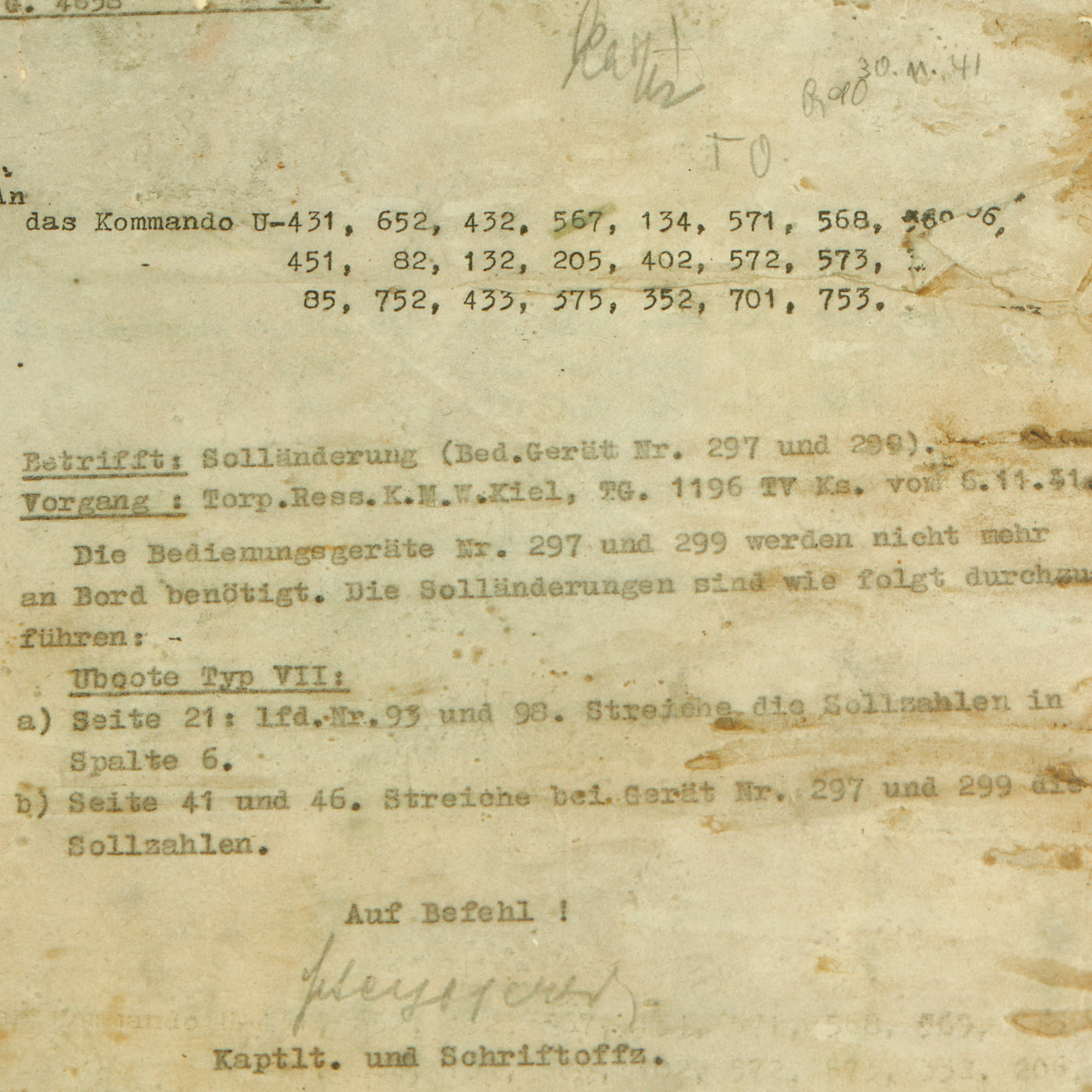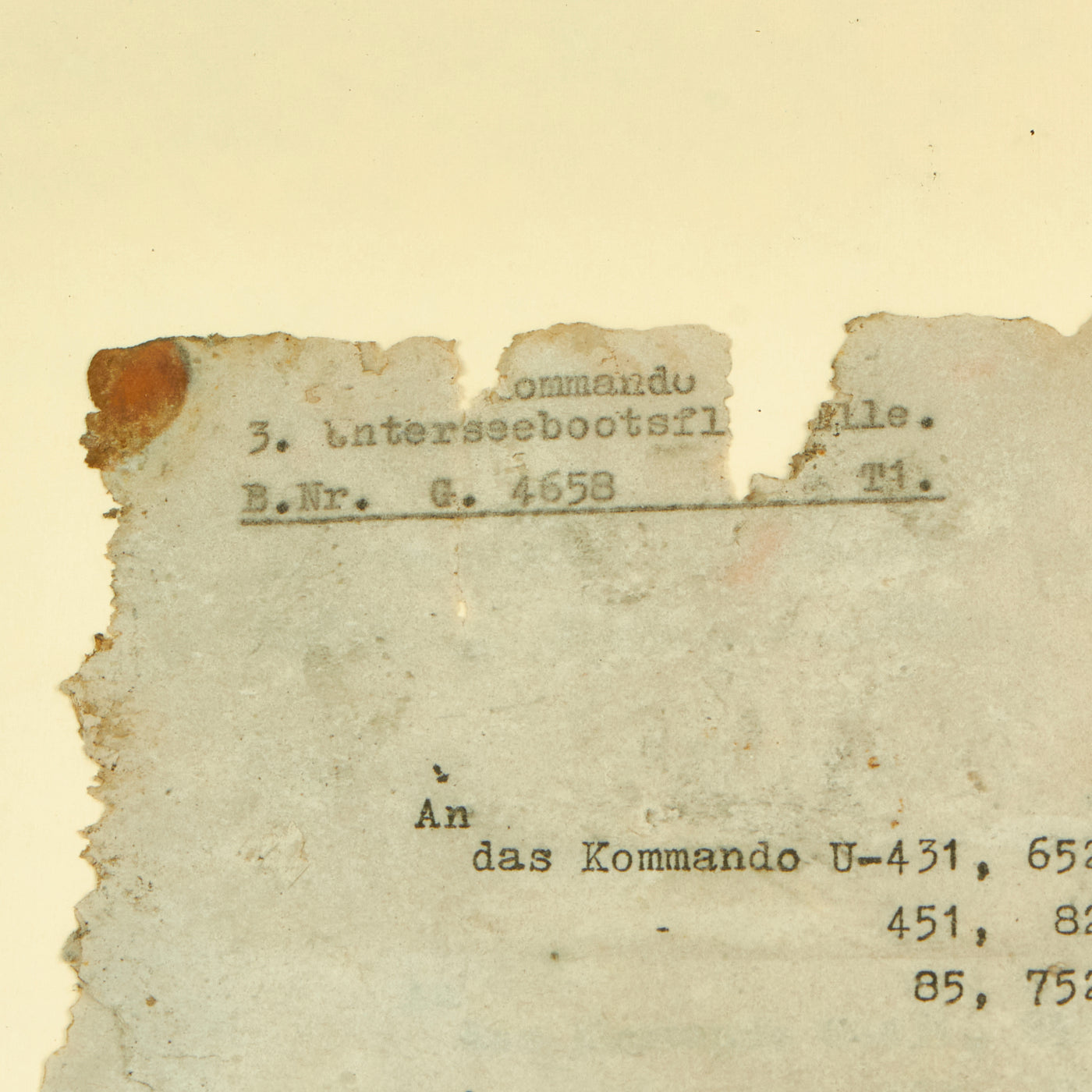 This document is a one of a kind original document I salvaged from the Captain's cabin of the U-352 submarine on August 22, 1979. The submarine sits in 110 feet of water off the coast of North Carolina where it was sunk on May 9, 1942. The sub lies in the sand and is listing to the port side. In the early years after the subs discovery there was a layer of diesel fuel trapped in the sub. I entered the sub by the rear torpedo loading hatch and after leaving the aft torpedo room I moved forward towards the control room. On the way I passed the captain's cabin on my right. The documents I have were in a rack in the Captain's cabin up in the diesel fuel which is what preserved them. After salvaging them they were dried and treated to preserve them. Since then they have sat in my collection. This is one of those documents from my collection.”