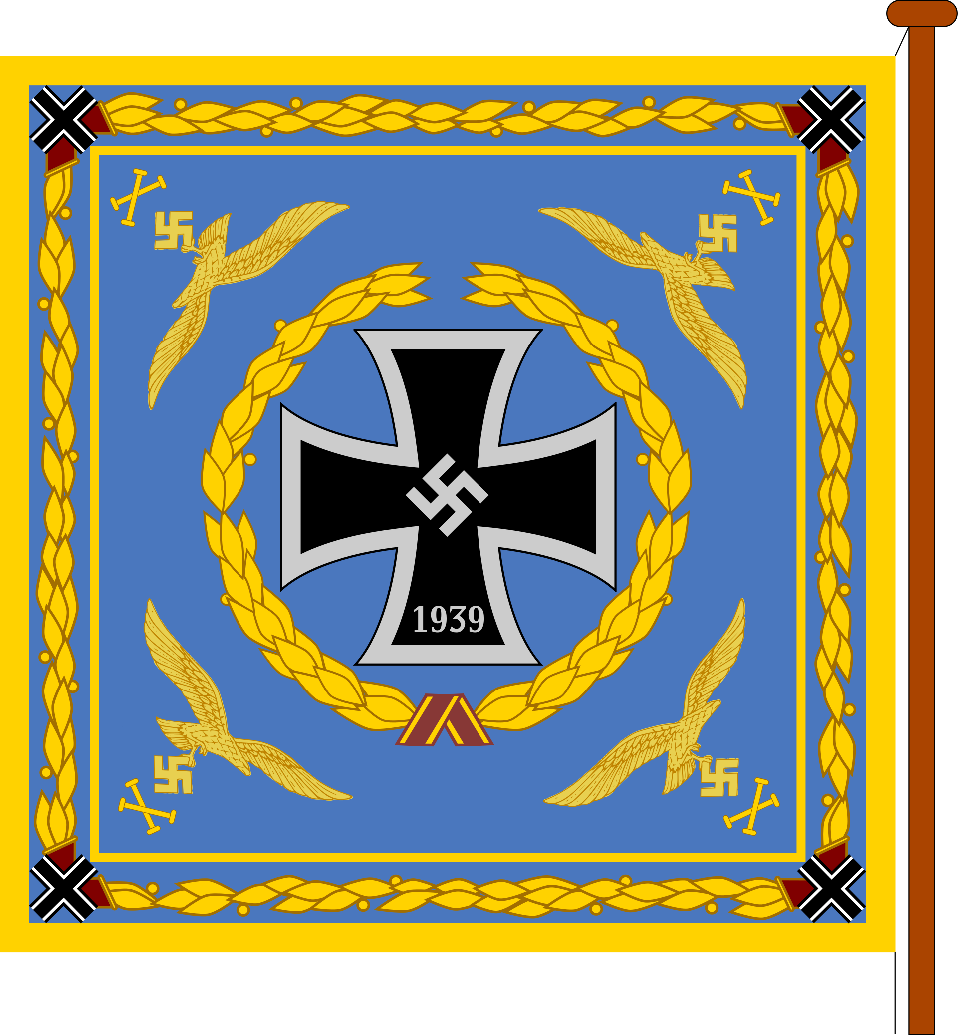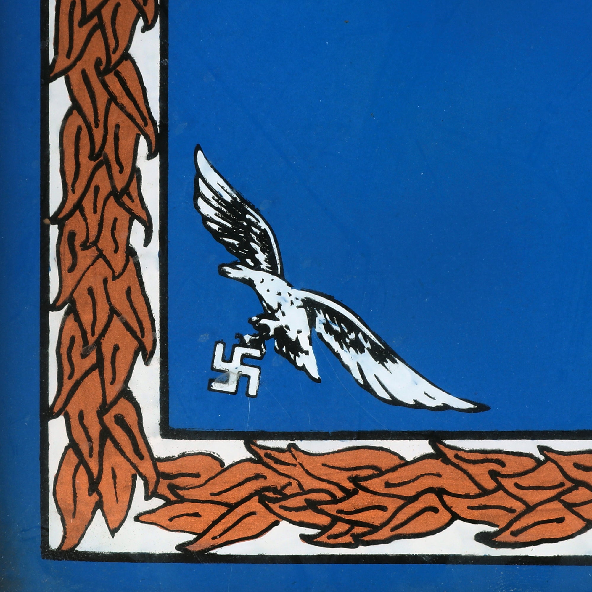 This design is strikingly similar to the Standard of the Reichsmarschall used from 1941-1945 which we have provided a photograph of. The only differences are the shape, as the standard was square and not rectangular, along with the standard having Iron Crosses in each corner, and the crosses batons in each corner. Otherwise, this glass painting is nearly identical to the standard of the Reichsmarschall. We have no information about where this piece came from, but it is certainly Luftwaffe-made and of the period.