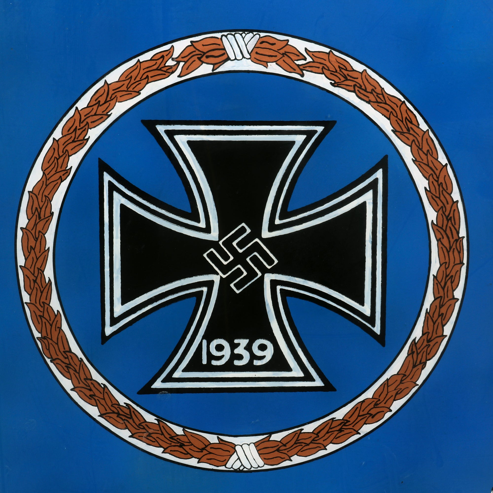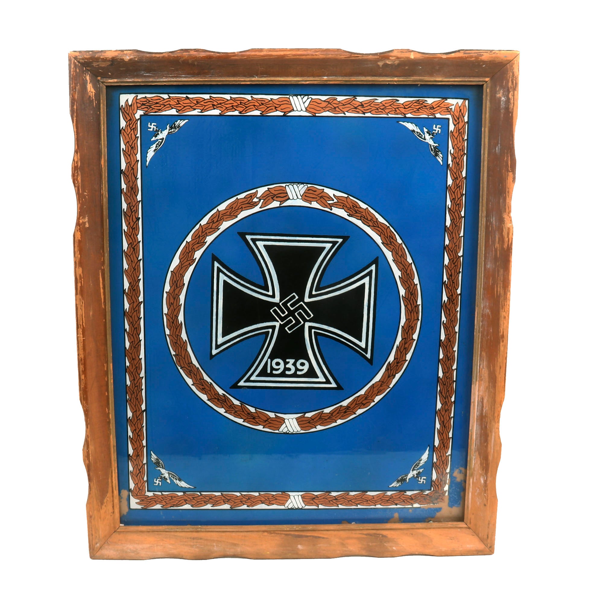 Original Item. One-of-a-Kind. This is a gorgeous framed piece of glass painted for the Luftwaffe, with an Iron Cross 1st Class painted in the center over a blue background, surrounded by a wreath with Luftwaffe eagles in each corner, surrounded by a rectangular wreath border. The frame measures 18½ x 22¼”, and there is a piece of glass in front of the painting so it is not damaged. This is a gorgeous display piece, the first of its kind we have ever seen.