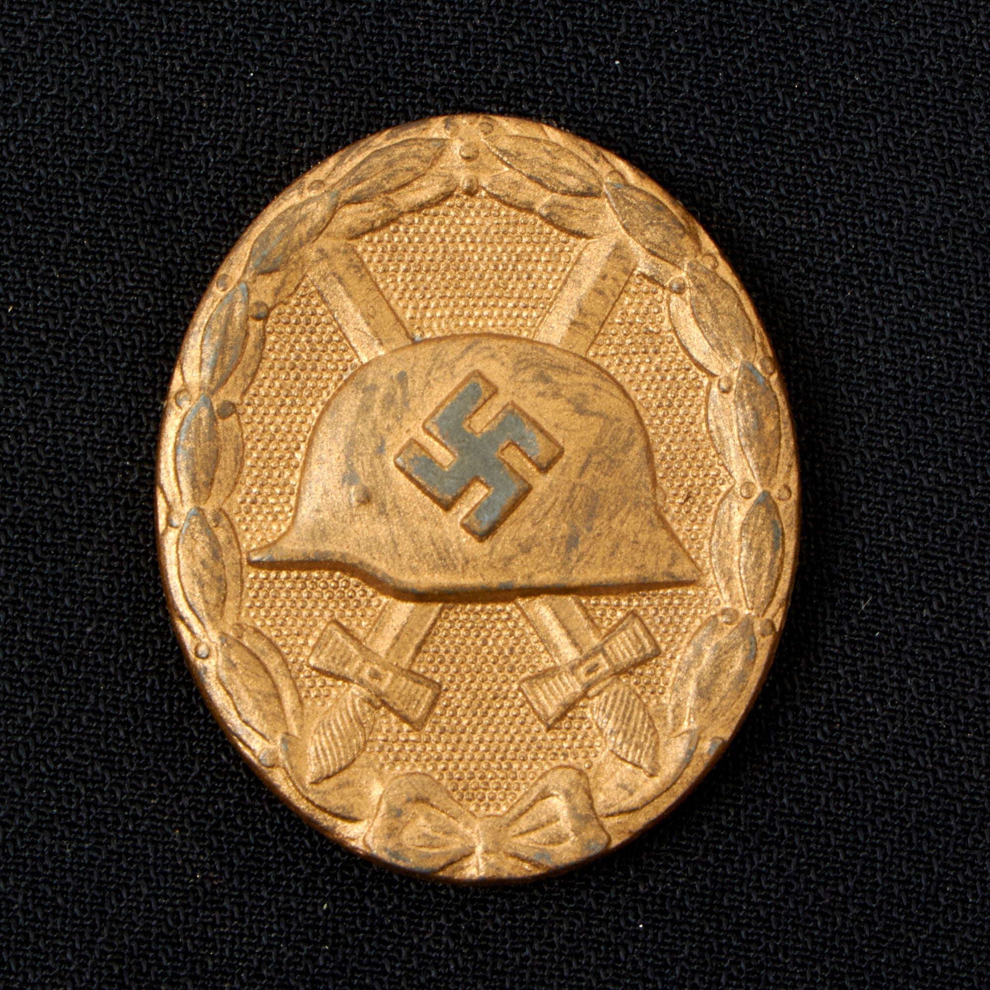 Gold / 1st class badges, which could be awarded posthumously, were awarded to those wounded five or more times. The oval badge depicts an embossed profile of a mobile swas (hook cross), above an M35 pattern helmet, which is above two crossed broad swords. This then lies on a pebbled field and is surrounded by a laurel leaf and berry wreath which is tied together at the bottom with a bow tie. The badge measures 1.75 inches high by 1.5 inches wide.