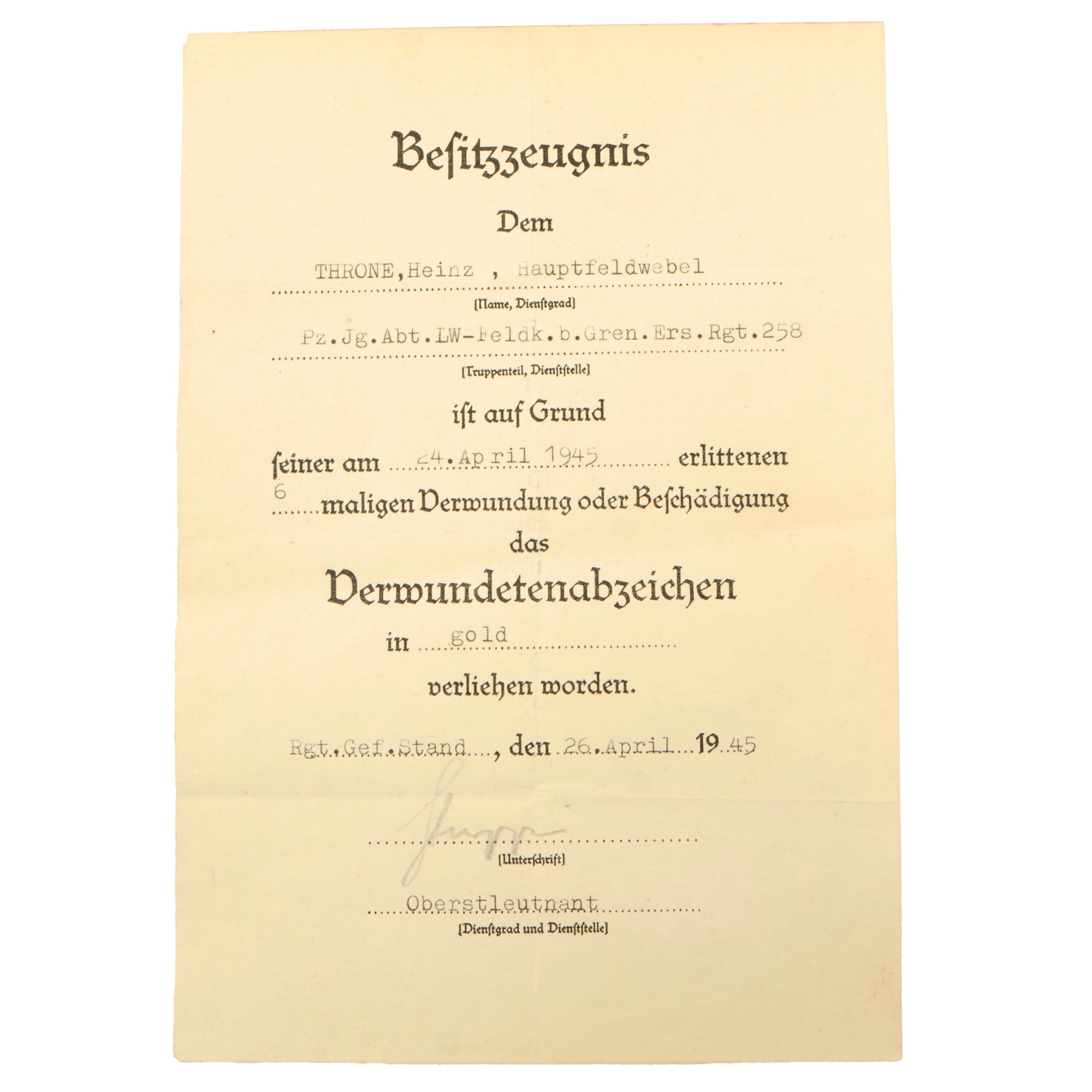 It was awarded on 26. April 1945 for a total of 6 injuries sustained as of 24. April 1945. The award was given at the Rgt. Gef. Stand, or the Regiment's combat position, and is signed by an Oberstleutnant. The document has all the correct markings, and is the standard, 8" x 5.5", (20cm x 14cm), printed on lightweight paper with black print and typed in particulars.