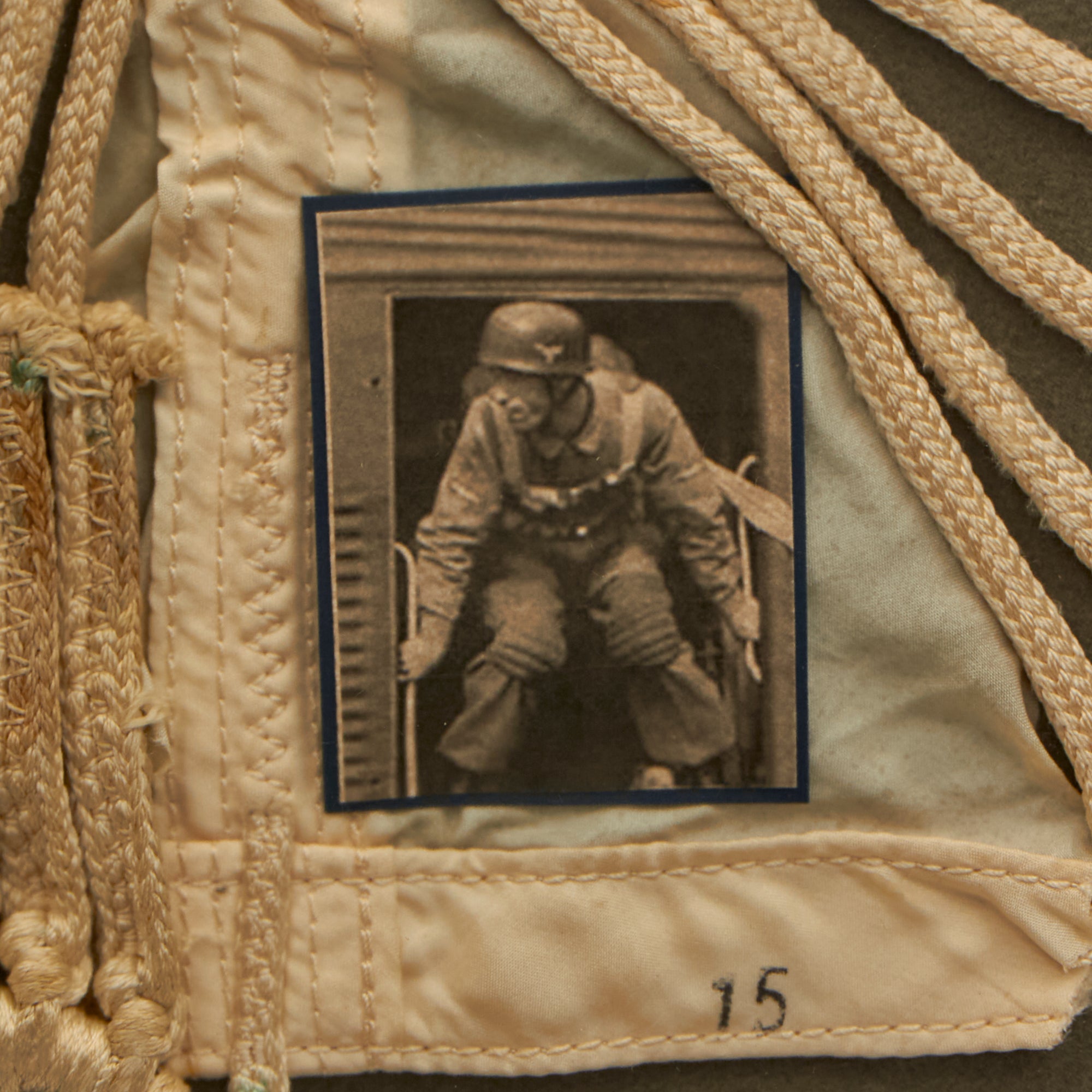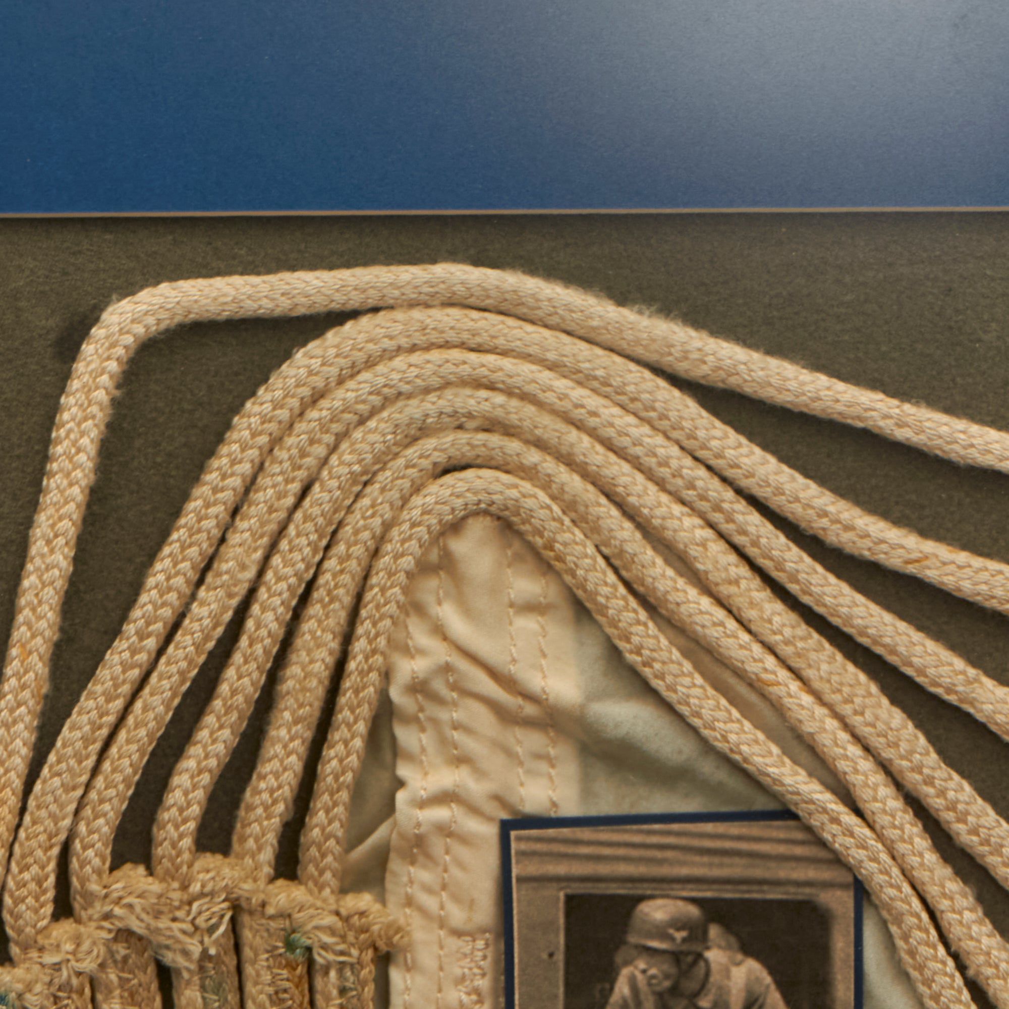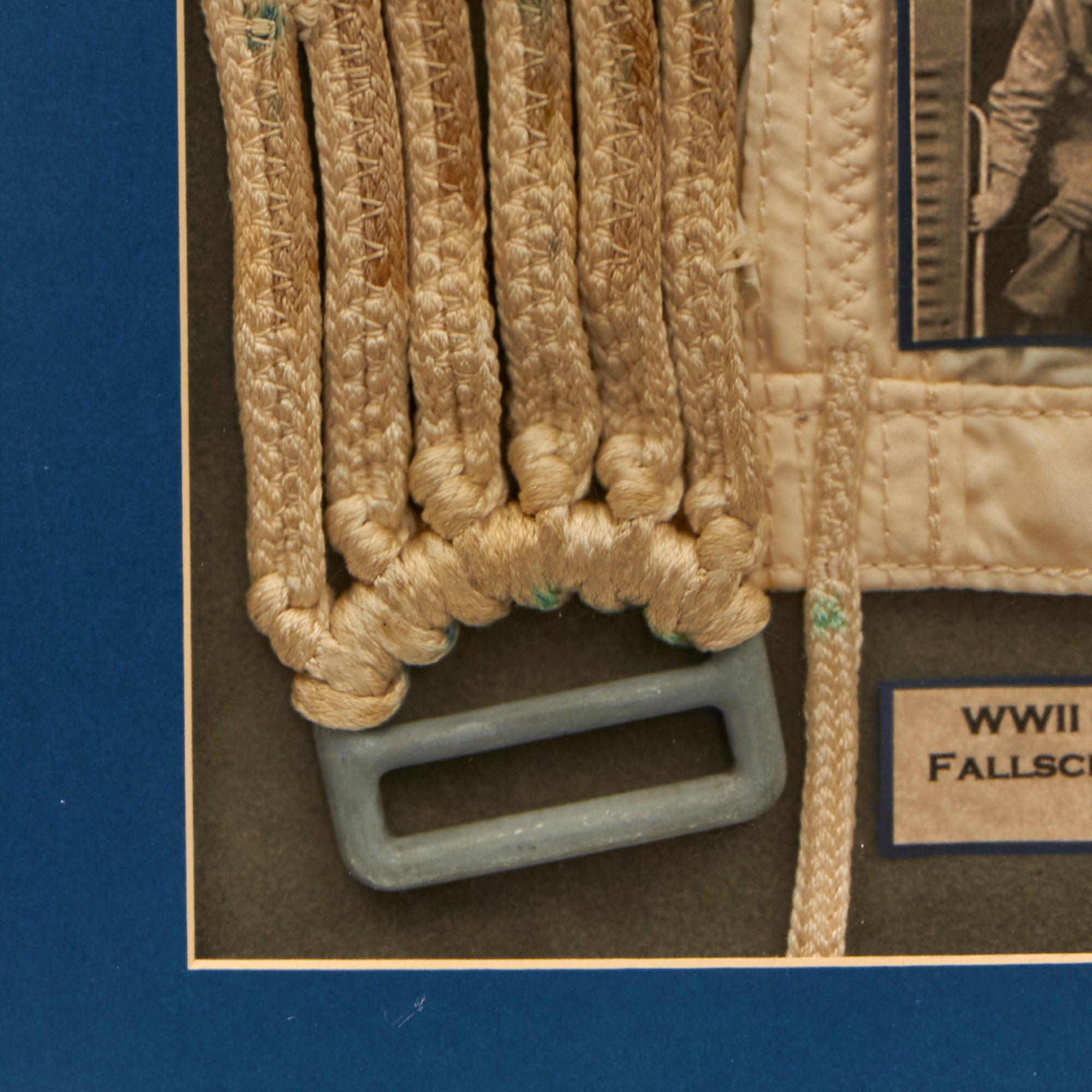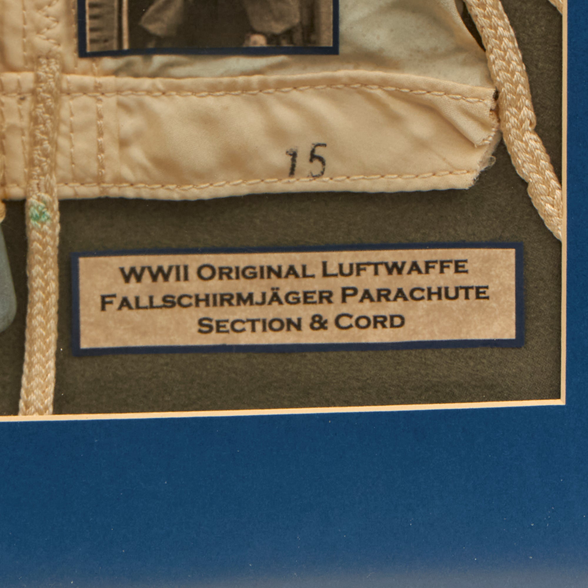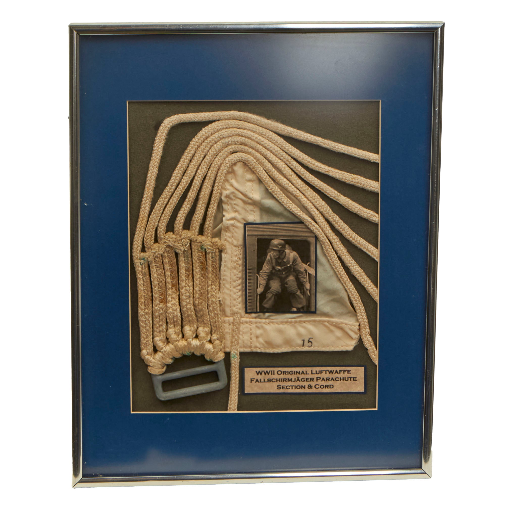 Original Item. Only One Available. This is a lovely piece for someone wanting a Fallschirmjäger representative piece in their collection, but doesn’t want to drop the money on an original helmet. This is a framed section & cord of a Fallschirmjäger parachute, with a small photograph of a paratrooper for reference.The frame measures 11¼ x 14¼” and is in great shape. The parachute was well-framed and has a stamped 15 still visible on the fabric. There is some wear to the cording as shown. A lovely piece, ready for further research and display.Army where they would conduct operations in the Leningrad area.From late October 1941 until 4 July 1942, the 22nd Airlanding Division participated in the Siege of Sevastopol. The Fallschirmjäger overran most of the Soviet 79th Naval Infantry Brigade during combat operations. The Soviet unit tried counterattacking on 10 June, but was repulsed. The Soviet formation was effectively destroyed, with the support of the Luftwaffe, which used anti-personnel bombs against Soviet infantry caught in the open.In July 1942, the Ramcke Parachute Brigade was deployed to North Africa to assist the Axis war effort there.Between November and December 1942, the 1st and 3rd Battalions of the 5th Parachute Regiment were flown into Tunisia to protect its airfields and take up defensive positions around the city of Koch during the Allied Operation Torch.On 26 December 1942, the men of Parachute Company of the Brandenburg Regiment were transported by gliders in an operation to destroy bridges and supply routes used by the British.The 2nd Parachute Regiment, an Assault Regiment Battalion, and Antitank and Machine Gun Battalions were sent to conduct operations in Ukraine.In March 1943, the Fallschirmjäger of the 3rd Battalion of the 4th Regiment, 7th Airborne Division defended a hill at Lushi on the Eastern Front.In May 1943, what was left of Fallschirmjäger units in North Africa had been captured by Allied forces.On 12 September 1943, the Fallschirmjäger conducted a successful rescue mission of Italian Prime minister Benito Mussolini at the Gran Sasso. Skorzeny received a promotion to Sturmbannführer, the award of the Knight's Cross of the Iron Cross and fame that led to his "most dangerous man in Europe" image.During 26 September 1943 to 16 November 1943, the Fallschirmjäger participated in the Battle of Leros.In October 1943, the Fallschirmjäger 22nd Airlanding Division participated in the Battle of Kos.In November 1943, the 2nd Parachute Division was ordered to the Eastern Front where it took up position near the Russian held town of Zhitomir.On 15 December 1943, the 2nd Parachute Division was airlifted to Kirovograd and put on the front at Klintsy.During 17 January – 18 May 1944, the Fallschirmjäger participated in the Battle of Monte Cassino. Allied Forces' aim was a breakthrough to Rome. At the beginning of 1944, the western half of the Winter Line was being anchored by Germans holding the Rapido-Gari, Liri and Garigliano valleys and some of the surrounding peaks and ridges. Together, these features formed the Gustav Line. Monte Cassino, a historic hilltop abbey founded in AD 529 by Benedict of Nursia, dominated the nearby town of Cassino and the entrances to the Liri and Rapido valleys. Lying in a protected historic zone, it had been left unoccupied by the Germans. They had defended some positions set into the steep slopes below the abbey's walls.Repeated pinpoint artillery attacks on Allied assault troops caused their leaders to conclude the abbey was being used by the Germans as an observation post, at the least. Fears escalated along with casualties and in spite of a lack of clear evidence, it was marked for destruction. On 15 February American bombers dropped 1,400 tons of high explosives, creating widespread damage. The raid failed to achieve its objective, as the Fallschirmjäger occupied the rubble and established excellent defensive positions amid the ruins.Between 17 January and 18 May, Monte Cassino and the Gustav defences were assaulted four times by Allied troops, the last involving twenty divisions attacking along a twenty-mile front. The German defenders were finally driven from their positions, but at a high cost.In early January 1944, the Red Army conducted a new offensive against the 2nd Parachute Division.On 3 July 1944 the 2nd Parachute Corps battled the U.S. 1st Army at Coutances-Marigny-St. Lo. The Fallschirmjäger utilized the terrain of the so-called Bocage and the hedgerows to their advantage to negate American superiority in both firepower and quantity of troops.On 11 July 1944 the 1st Battalion, 9th Parachute Regiment executed a successful attack on the U.S. 1st Battalion, 115th Infantry Regiment.On 11 July 1944 the 3rd Parachute Division suffered heavy casualties while attempting to prevent American forces from capturing the city of St. Lo.On 25 July 1944, the 21st Parachute Pioneer Battalion was positioned on the road between Dunaburg and Kovno in Lithuania.On 25 July 1944, the 2nd Parachute Division was involved in the defense of Brest against the American 7th Corps. American forces suffered 4,000 casualties in its effort to invest the port.In September 1944, the 1st Parachute Corps fought in the Allied Offensive in Italy known as Operation Olive.In September 1944, the 4th Parachute Division was defending positions at the Futa and 2 Giogo Passes when the U.S. 91st and 85th divisions mounted an attack.On 21 September 1944, British and Canadian forces were successful in overcoming defensive positions occupied by the 1st Parachute Corps to capture Rimini.On 13 October 1944, Axis forces which included the 4th Parachute Division manage to halt an Allied 2nd Corps' advance south of Bologna, Italy.In April 1945, the 9th Parachute Division would be destroyed while trying to contain a Russian bridgehead on the west bank of the River Oder.In April 1945, the 10th Parachute Division would be destroyed by the Red Army in Austria.On 15 