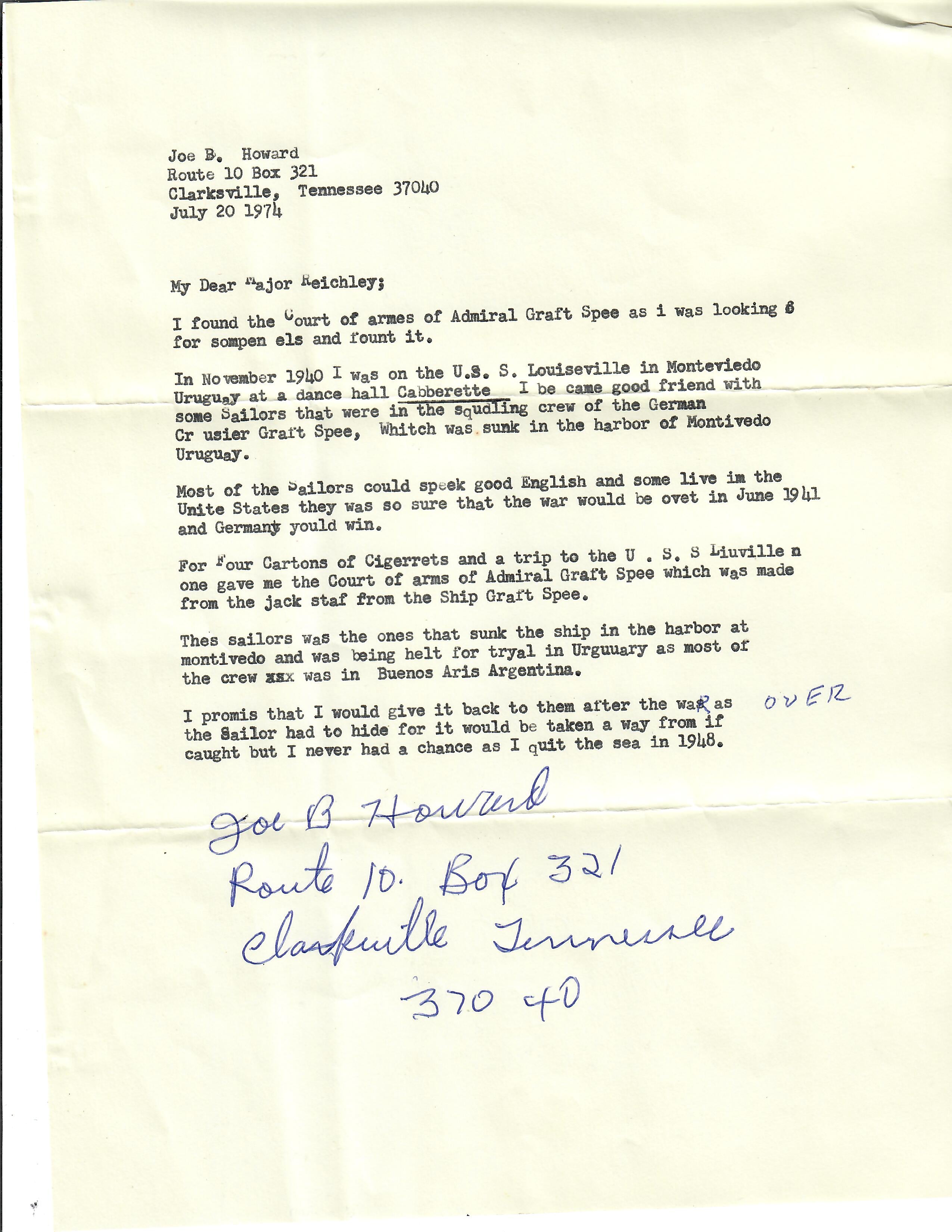 However, the Helena wasn't the only ship to visit Montevideo before the U.S. entrance into WWII. The Northampton-class cruiser USS Lousville was also present in the Eastern South America area during 1940 after fleet problems in the Pacific. During this time, the ship put in at Montevideo in Uruguay, definitely a more friendly port-of-call than German-friendly Buenos Aires, even though the U.S. was neutral. It was at this time that Joe B. Howard of Clarksville TN went ashore, as described in a letter he sent to Major John A. Reichley at Fort Mead, MD in 1974. For clarity purposes we have corrected the numerous spelling mistakes in the original letter.