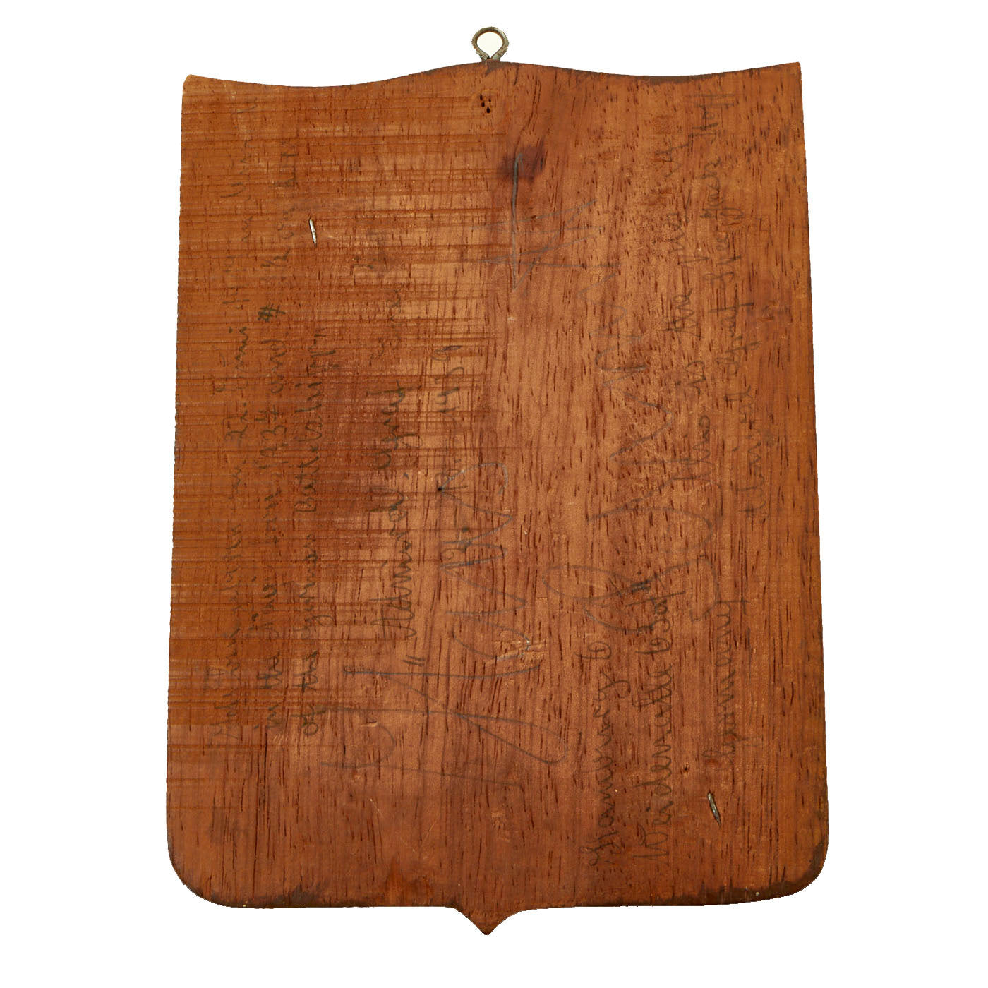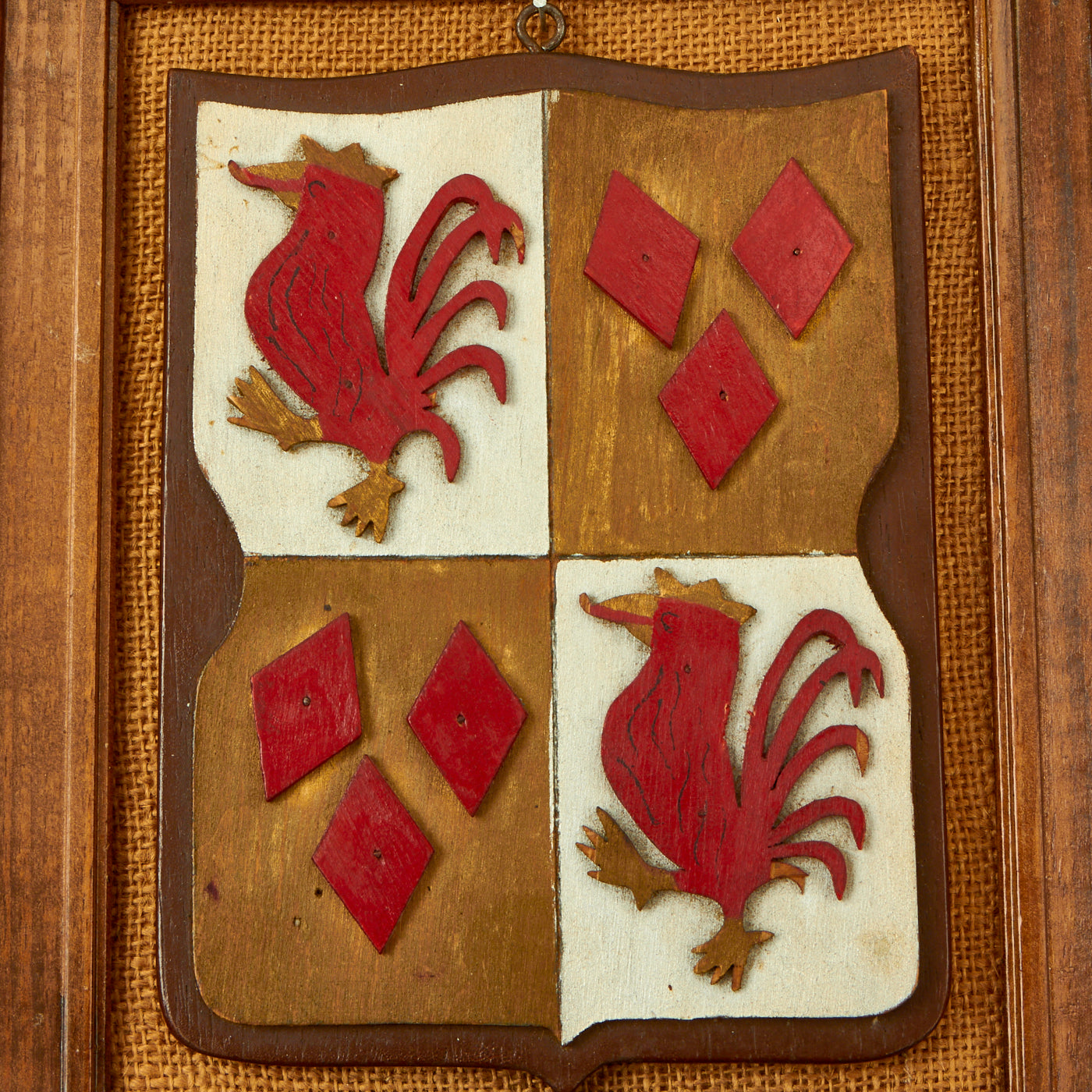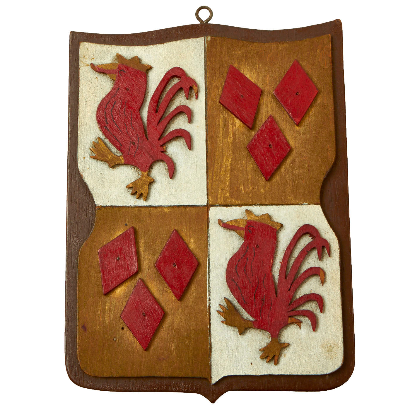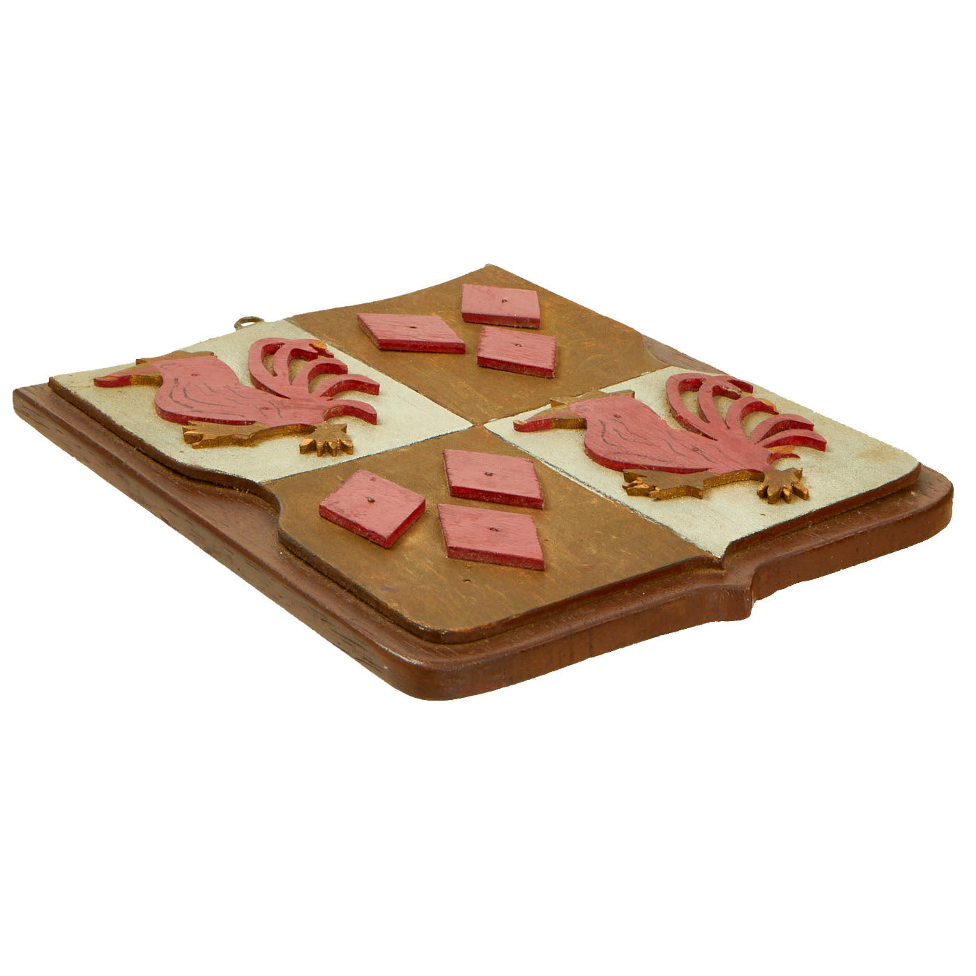 The coat of arms that Howard refers to is a small hardwood example measuring 6 1/4"W x 8 1/2"H, made from a dark hardwood. It displays the "von Spee" family coat of arms, with roosters in two quadrants, with three diamonds in the other. It is made from Several pieces of wood, with the backing, shield, and insignia all separate. The diamonds are held on by a single nail each, which is why they are rotated somewhat out of position.