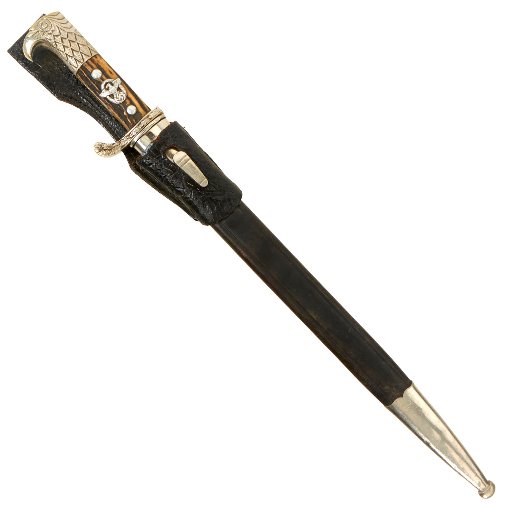 Original Item: Only One Available. This is a fantastic Unit-marked Frankfurt Dictrict Metropolitan Police Long Dress "Walking Out" Bayonet by the legendary firm Carl Eickhorn of Solingen. It comes complete with its original nickel fitted black leather scabbard, which is held in a very nice aged black patent leather frog.