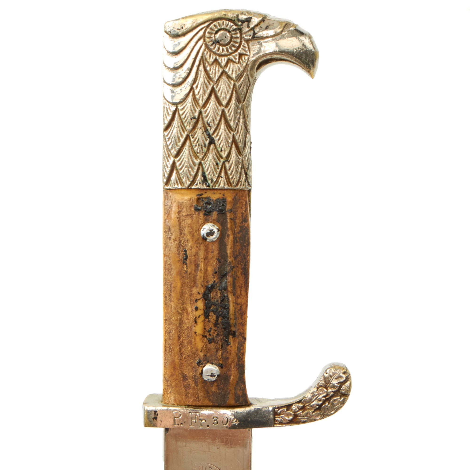 This indicates issue to the Metropolitan Polizei (Police) of the Frankfurt District, Officer 304. The back of the scabbard is marked with P. Fr. 154, so it is not matching but from the same unit, probably swapped at some point while in service.