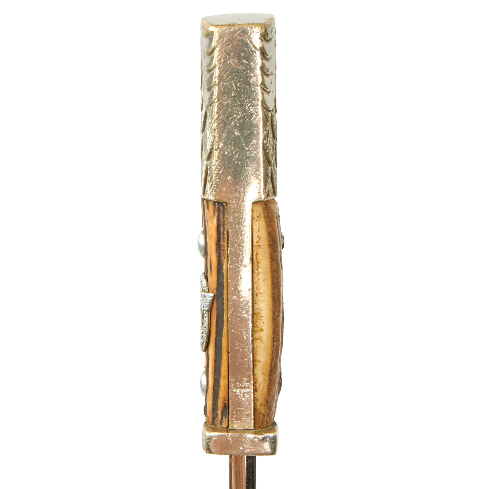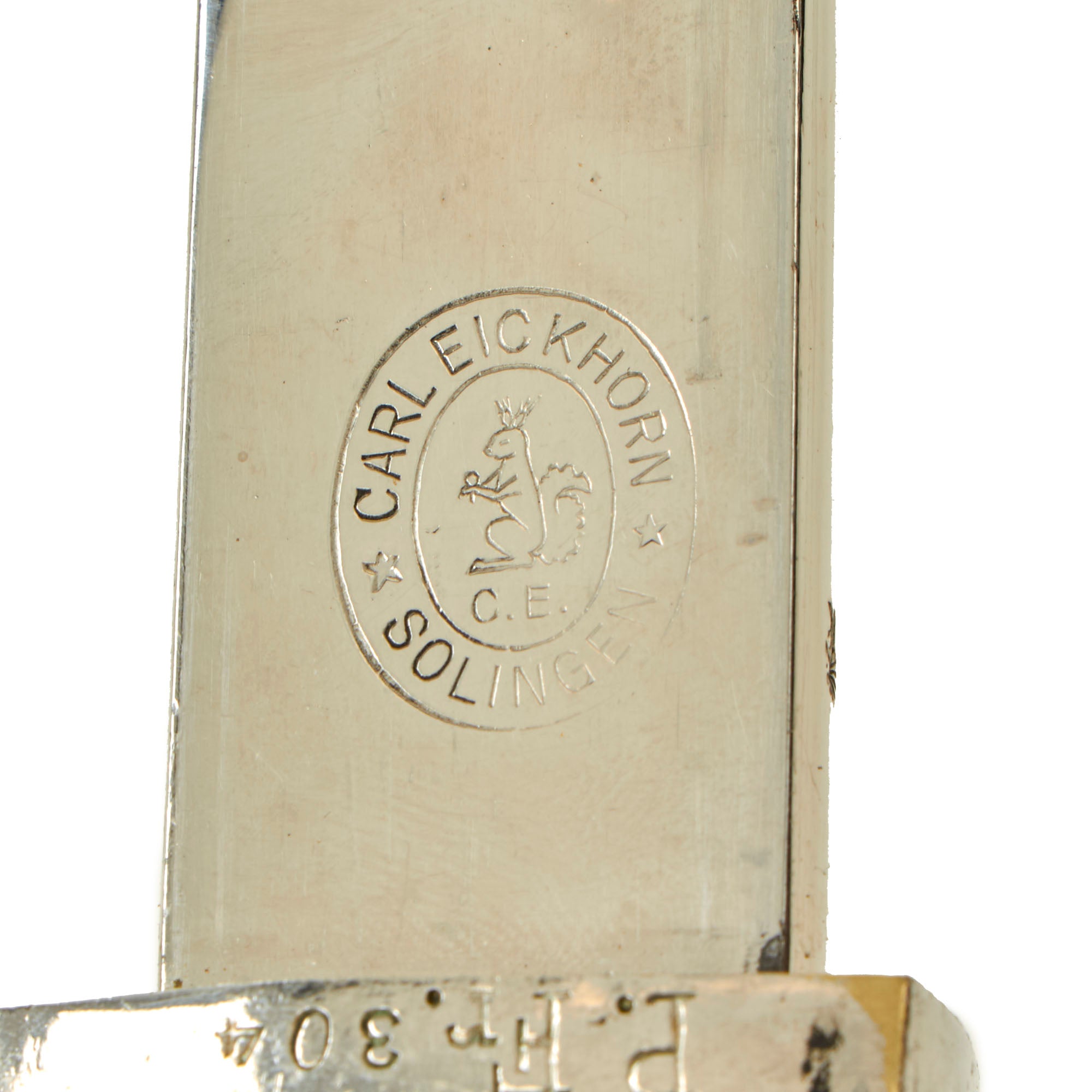 The rear ricasso of the blade is stamped with the Carl Eickhorn 1934-35 style double oval trademark logo. It features the trademark squirrel looking to the viewer's left over C.E., surrounded by the first oval. Inside the second oval is CARL EICKHORN above and SOLINGEN below, with stars in between. According to J. Anthony Carter's book, GERMAN KNIFE AND SWORD MAKERS, this company was founded in 1865 by Carl Eickhorn, and is arguably the most famous of all Solingen makers. Not only could the family trace their history back 500 years, but they could also demonstrate involvement in the hardening and grinding industries for the same period. Truly the nobility of Solingen Edged weapon dynasties. Eickhorn edged weapons are the most desirable of all makers.