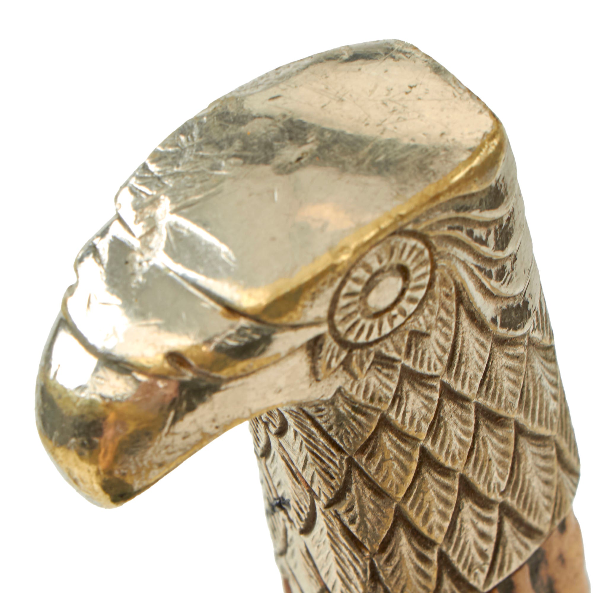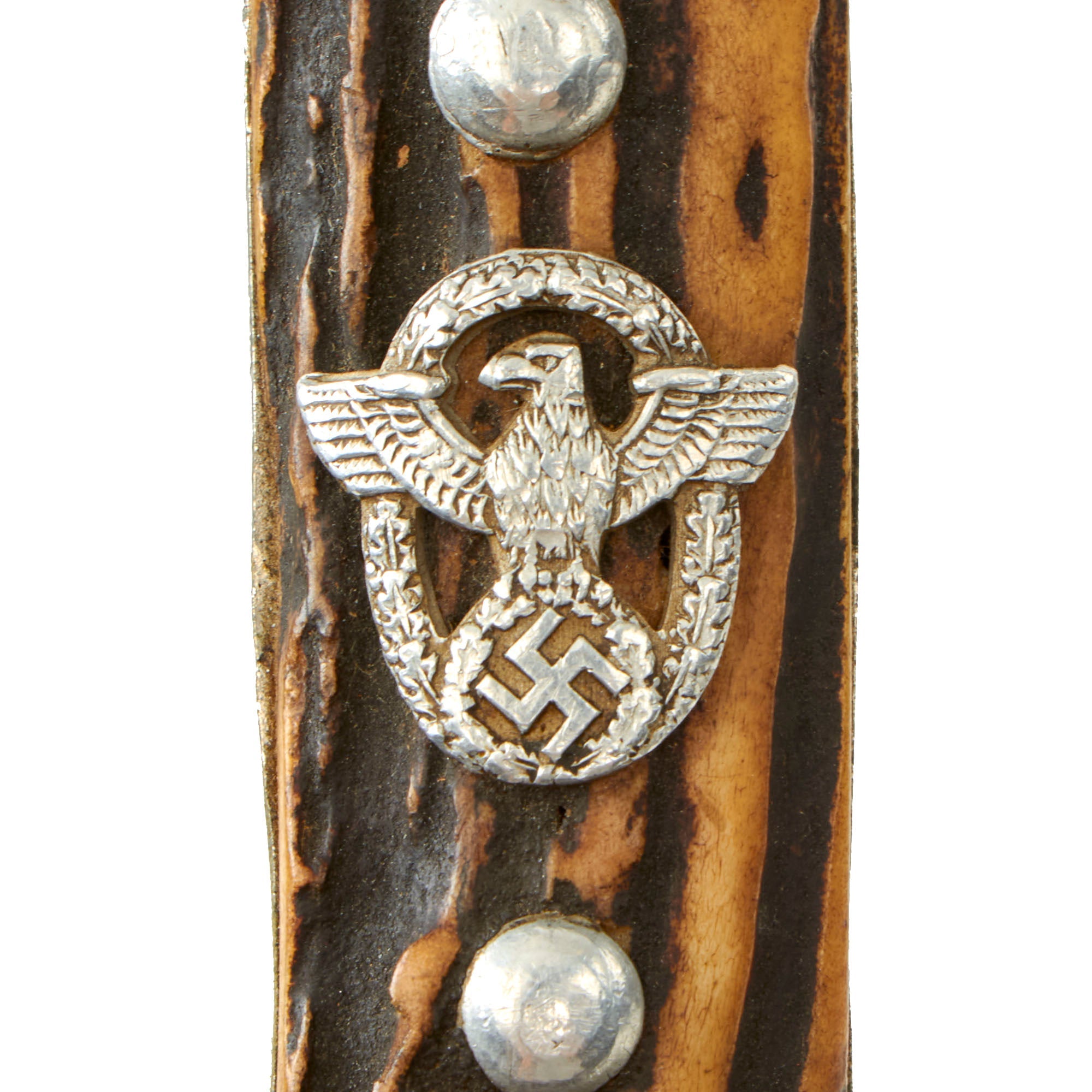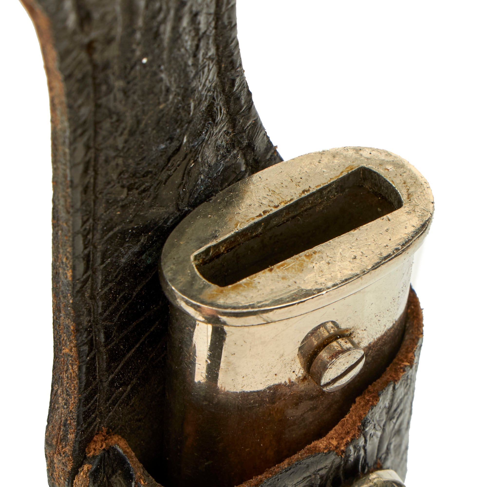 The handle of the bayonet is lovely solid plated nickel or brass alloy, featuring a lovely decorated "Birds Head" pommel without a bayonet slot, and an upswept cross guard decorated with oak leaves. The grip scales are made of beautiful stag horn with an aluminum police insignia firmly attached on one side. These are held with solid aluminum rivets and firmly attached in place, with no wiggle. Both cross guard and eagle’s head are in very good condition, with most all of the original nickel plating still intact, showing only light wear.