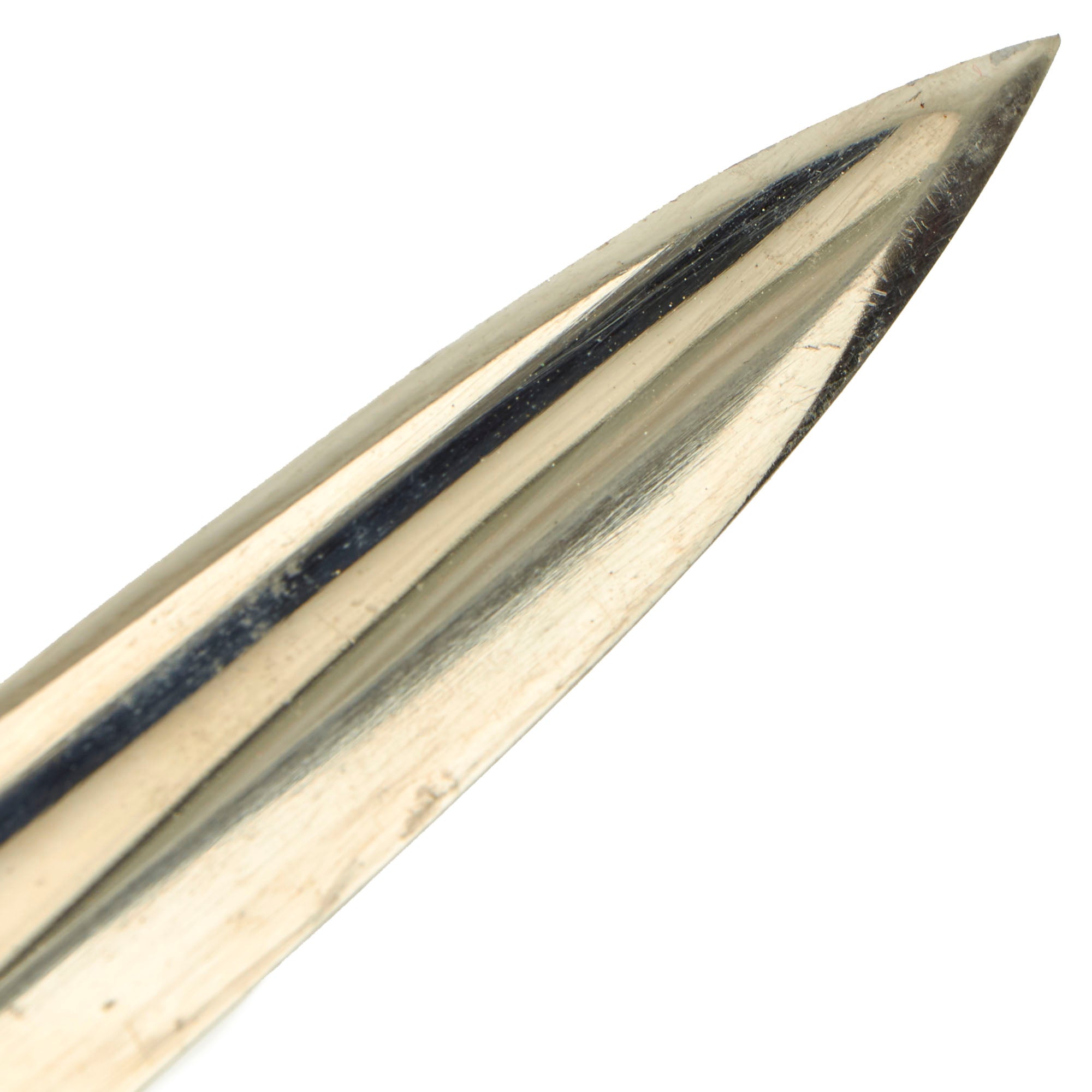 The bayonet has a lovely approximately 33 cm (12.75 inches) long nickel plated steel blade, which was forged "cut-down" style, with the fuller running to the tip. Blade is nice and bright, of excellent quality, with almost all of the original nickel plating remaining. It shows some runner wear and scratches near the tip, with a very tiny area on the tip where the plating is missing. The edge is correctly unsharpened, however the leather blade washer is missing.