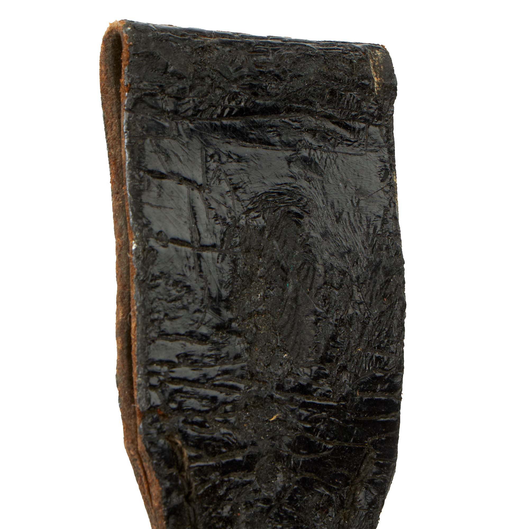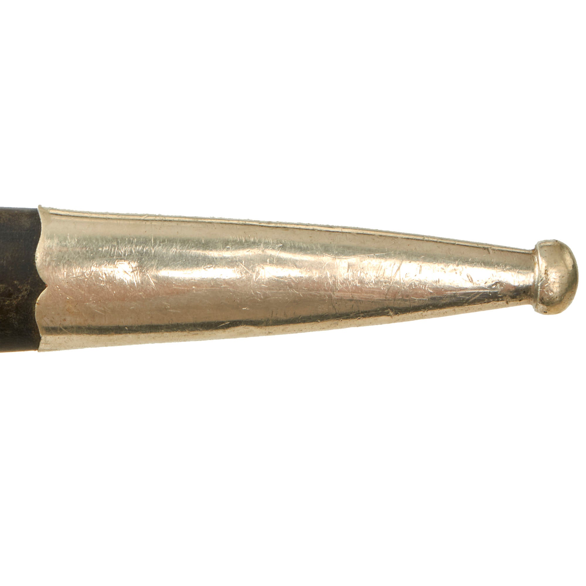 The scabbard is made of fine black leather, fitted with heavily nickel plated alloy, and is in very good condition. The fittings have a lovely look, and the leather is still in great shape, showing just some wear to the finish, and no cracking, tearing, or splitting along the seam. Attached to the scabbard is a nice black leather dress frog, which does not have any securing rivets near the loop. Unfortunately the black gloss finish on the leather has "melted" over the decades, and it is now in somewhat delicate condition.