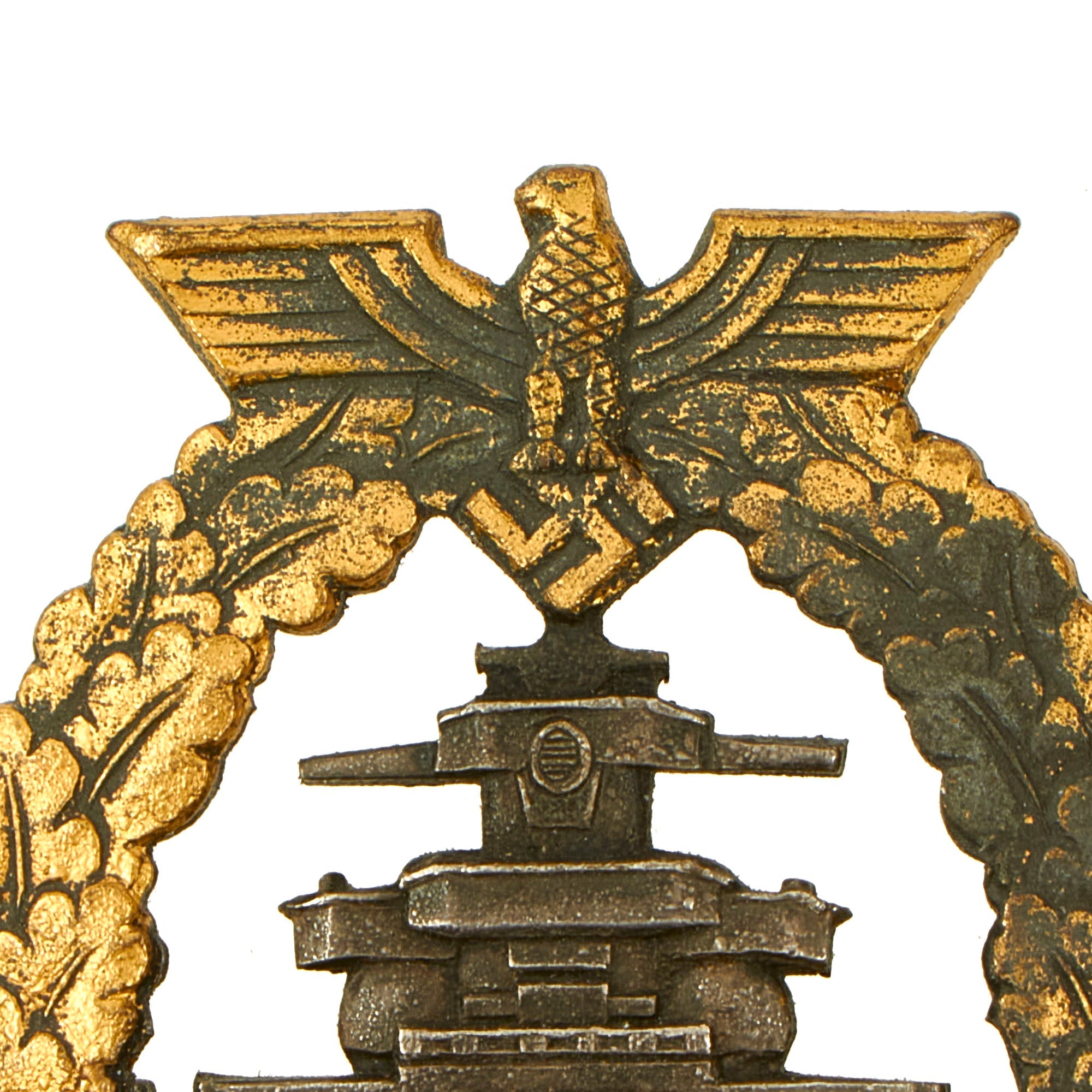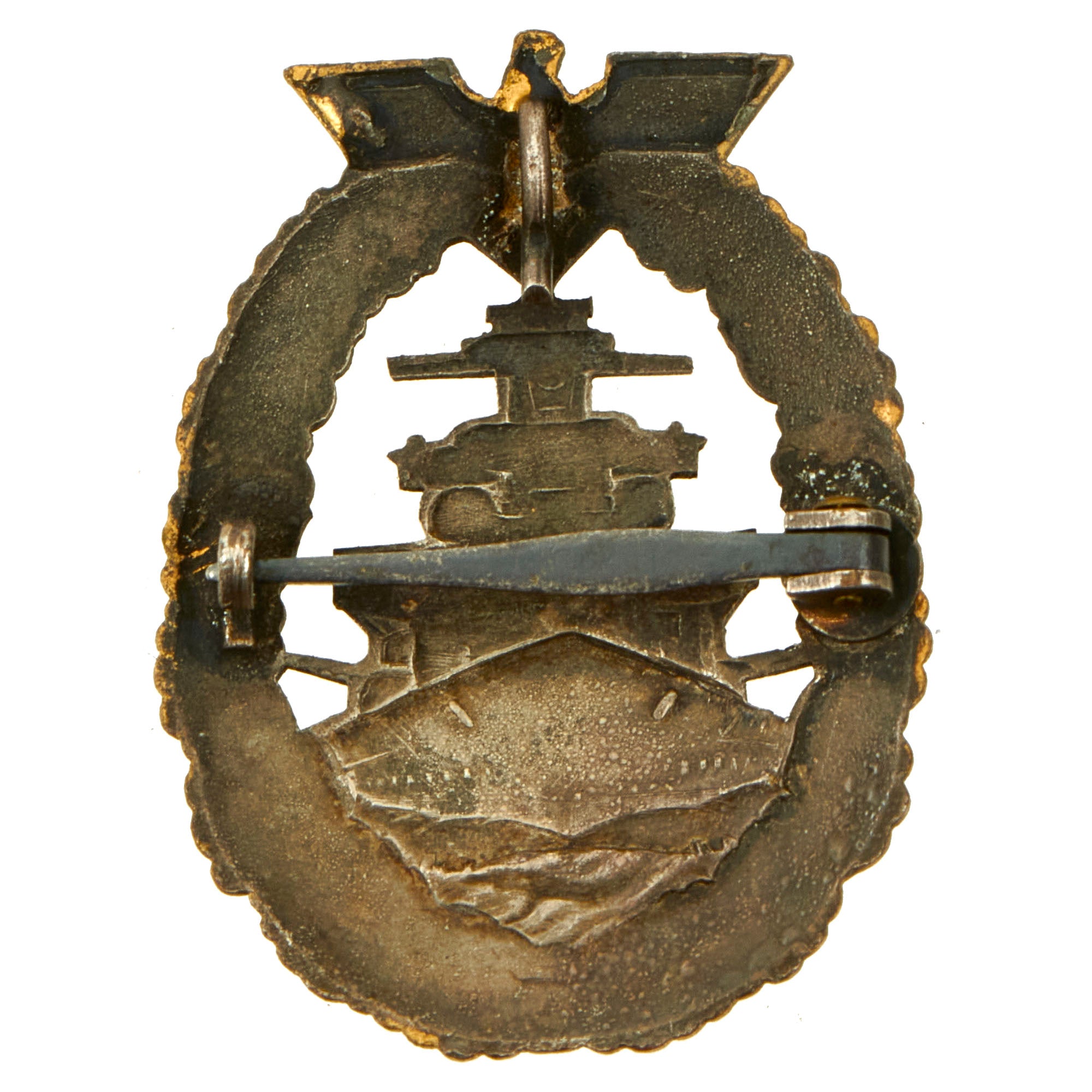 Original Items: Only One Available. This is a very good condition Late War Flottenkriegsabzeichen der Kriegsmarine - High Seas Fleet Badge, made of Zinc alloy. Earlier in the war, these had been made of Brass with a blacked battleship in the middle, but as the war went on, they moved to zinc.
