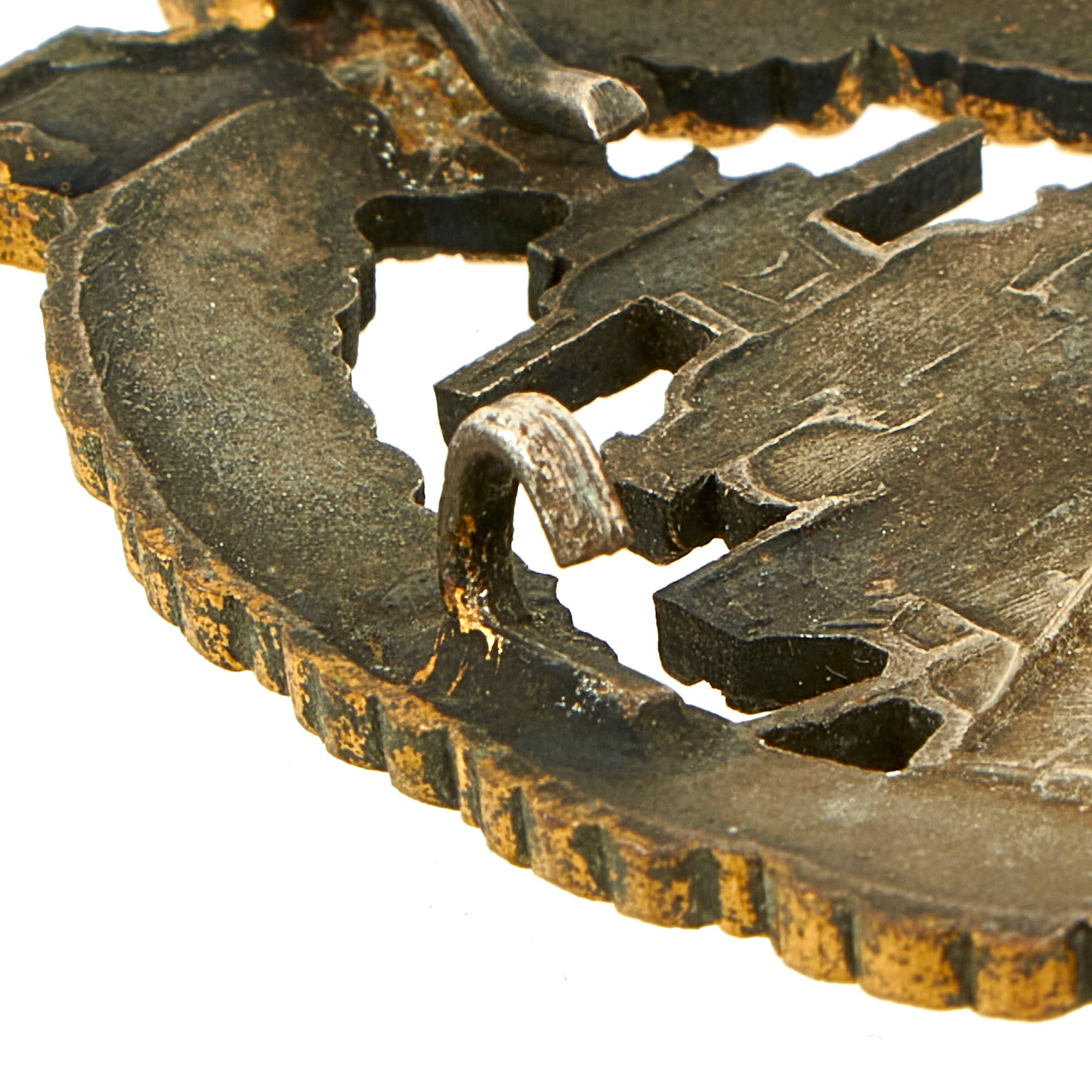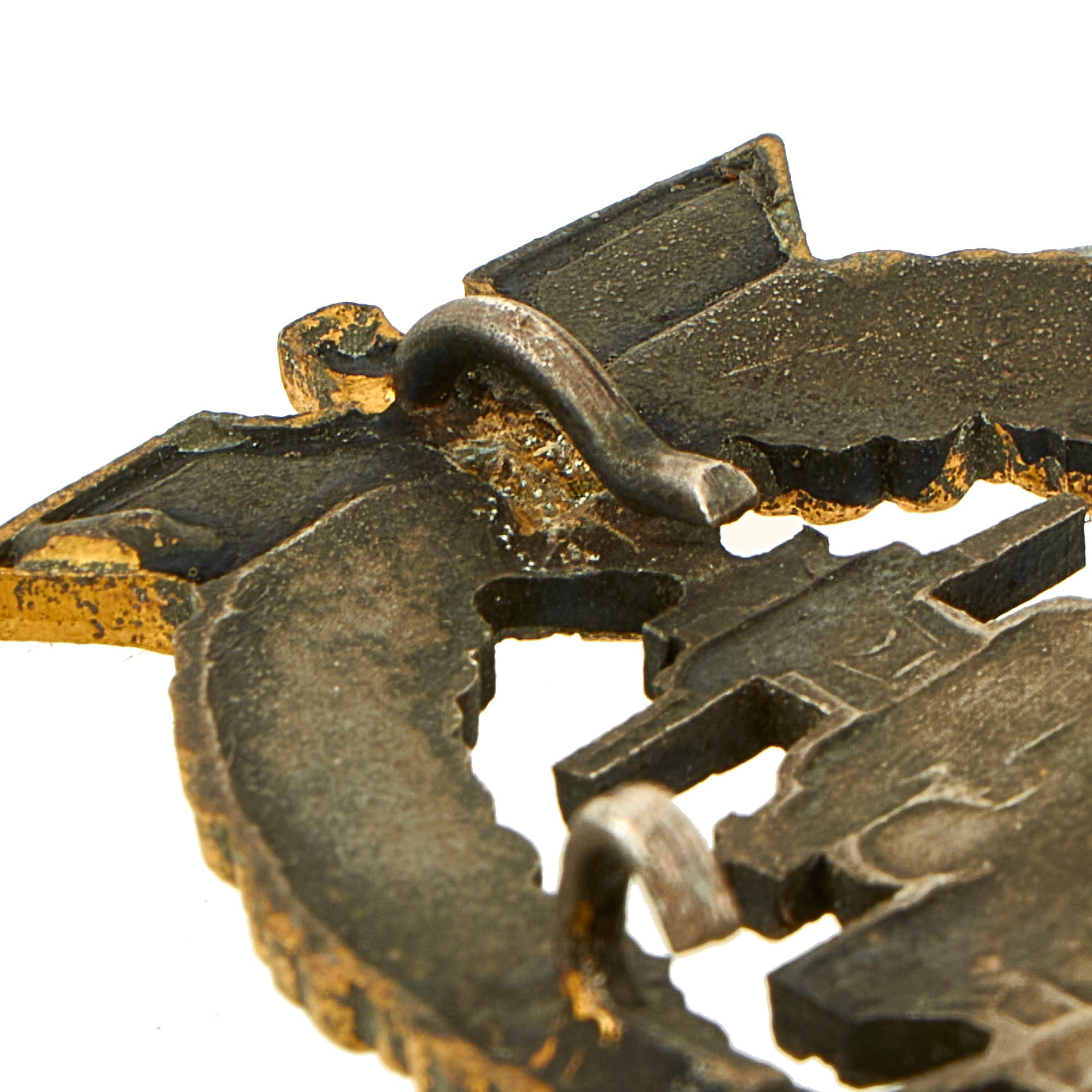 This example was made in France during WWII, and conforms well to other known examples, with the horizontal pin catch and hook on the top, a hallmark of French-made badges from Bacqueville in Northern France. There was a large Kriegsmarine presence in this area on the Northern French Coast, including the Coastal Artillery Batteries, Submarine Pens, and so forth. This made it more convenient to source these specific badges in France.