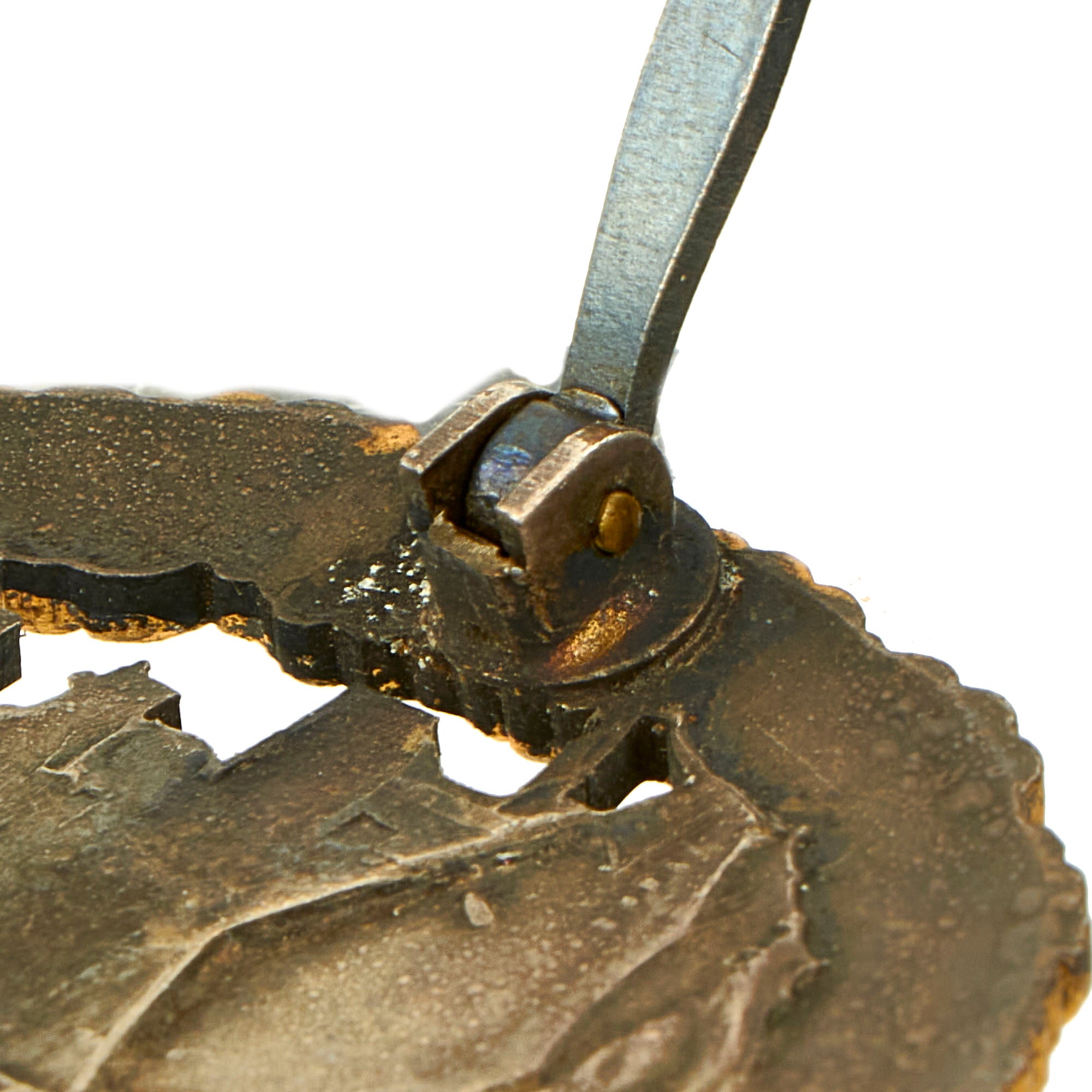 It is made from the standard zinc alloy, with lots of the original gold wash on the wreath still present and bright. The zinc portions show a lovely oxidized patina, with the central battleship looking great! The pin on the back has a very high quality hinge, and is fully functional.