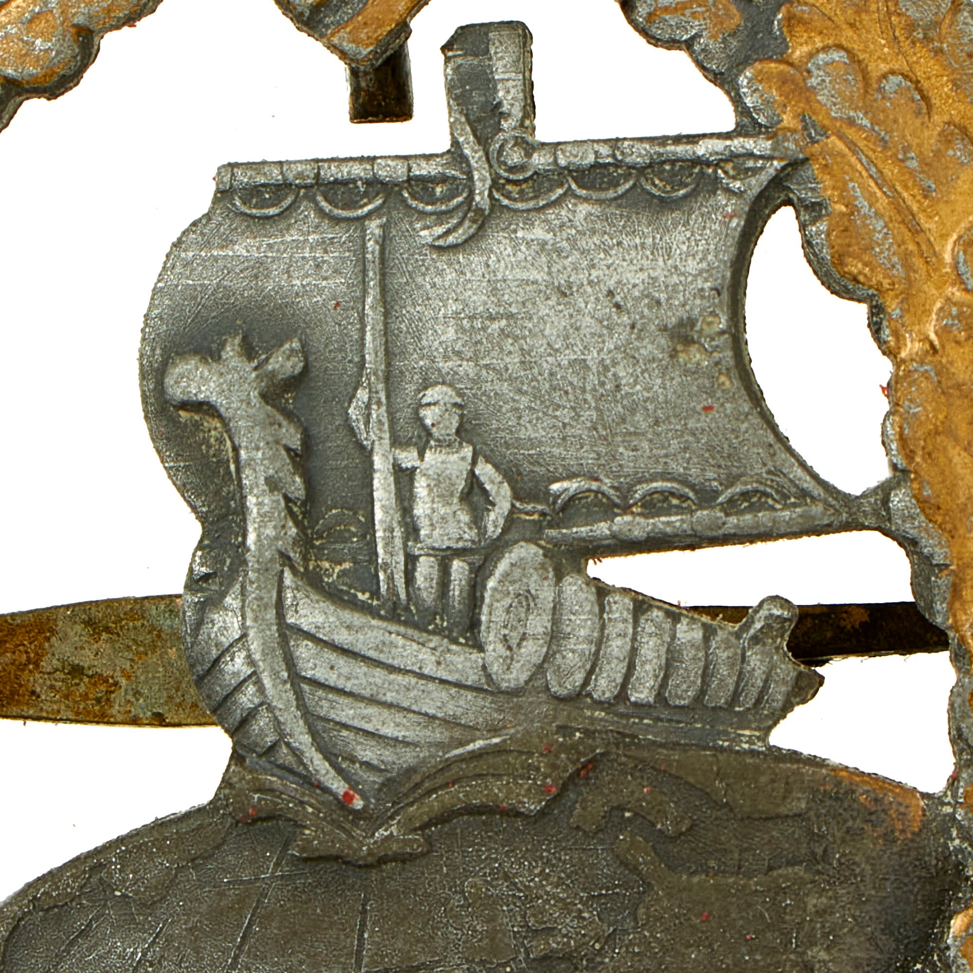 Designed by Wilhelm Ernst Peekhaus in Berlin, the award featured a Viking longship sailing over the northern hemisphere of the globe surrounded by a laurel wreath of oak leaves. At the apex of the badge was a German Eagle clutching a swas. The wreath, eagle and ship were in gilt and the globe area gray colored. Versions were produced in bronze and later in zinc.