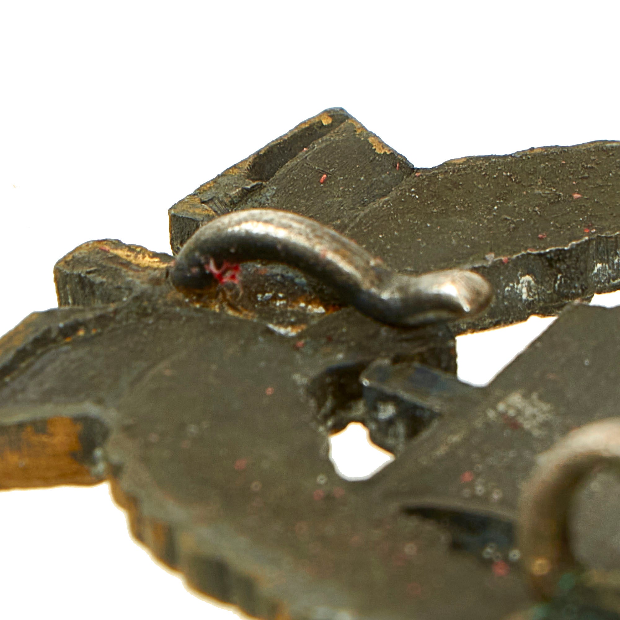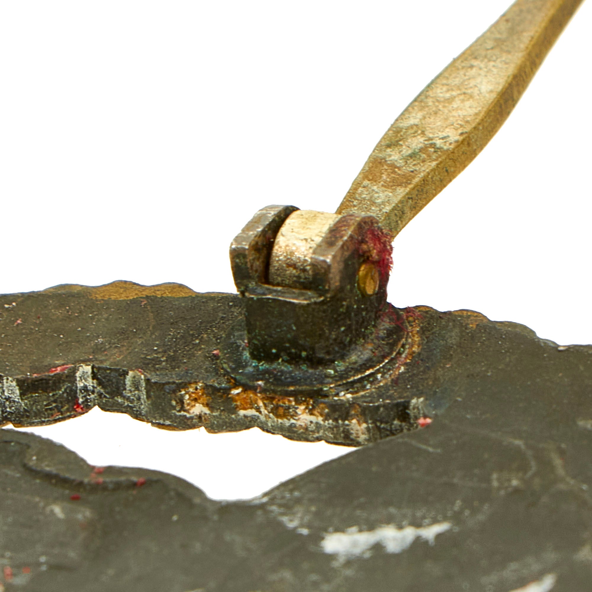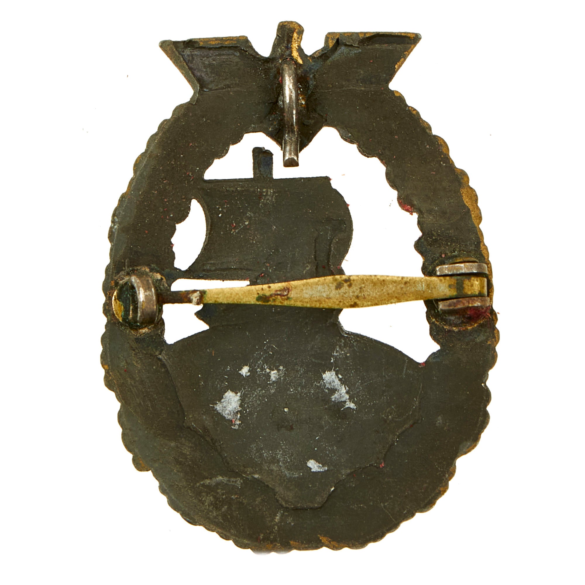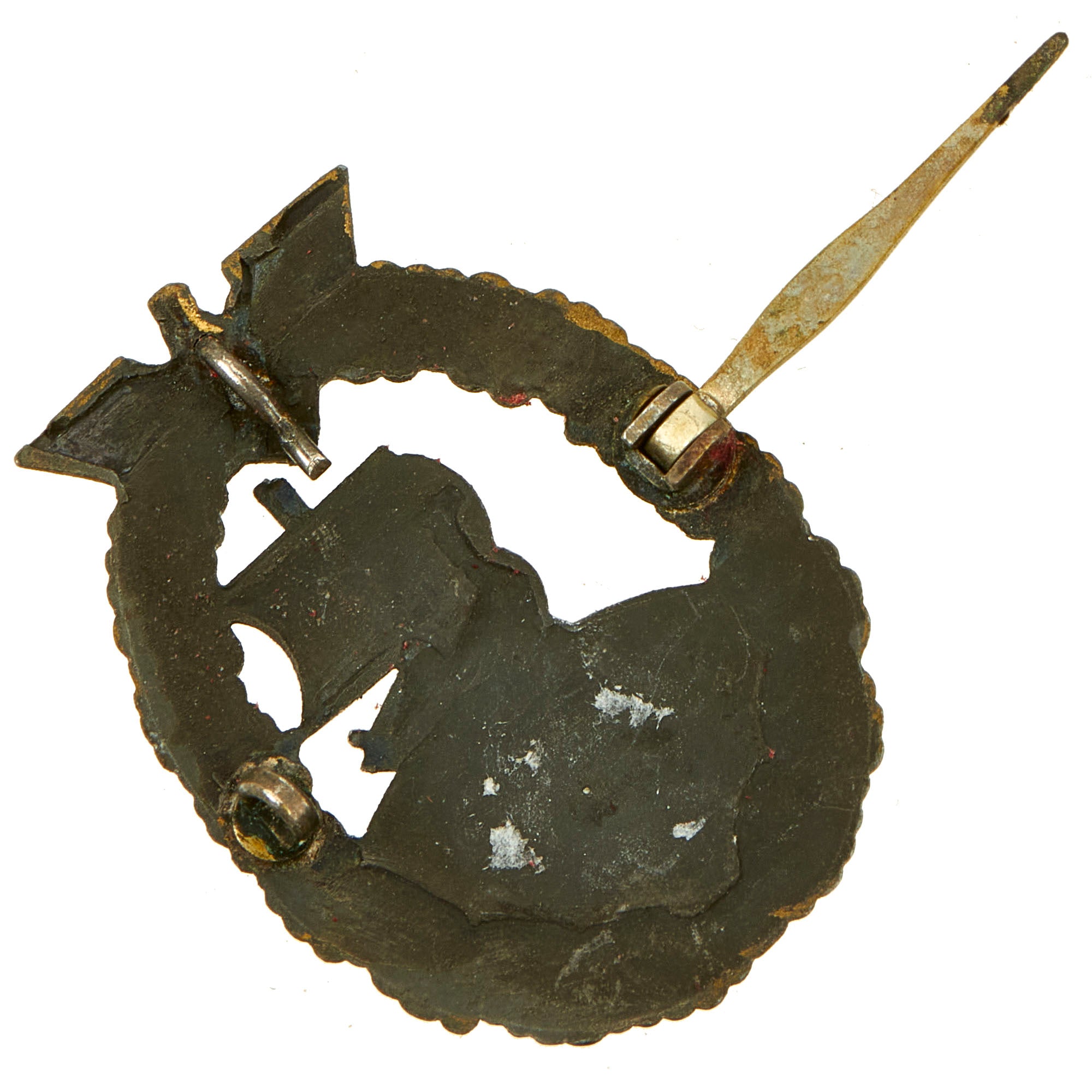 This example was made in France during WWII, and conforms well to other known examples, with the horizontal pin catch and hook on the top, a hallmark of French-made badges from Bacqueville in Northern France. There was a large Kriegsmarine presence in this area on the Northern French Coast, including the Coastal Artillery Batteries, Submarine Pens, and so forth. This made it more convenient to source these specific badges in France. The badge is not maker marked, as is correct for the French pattern.