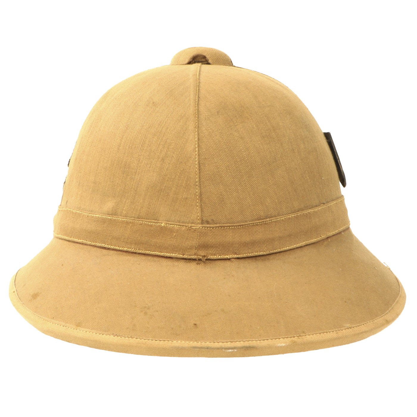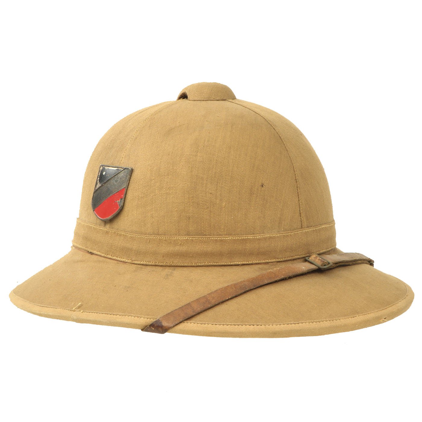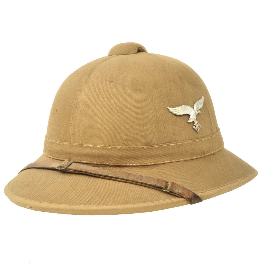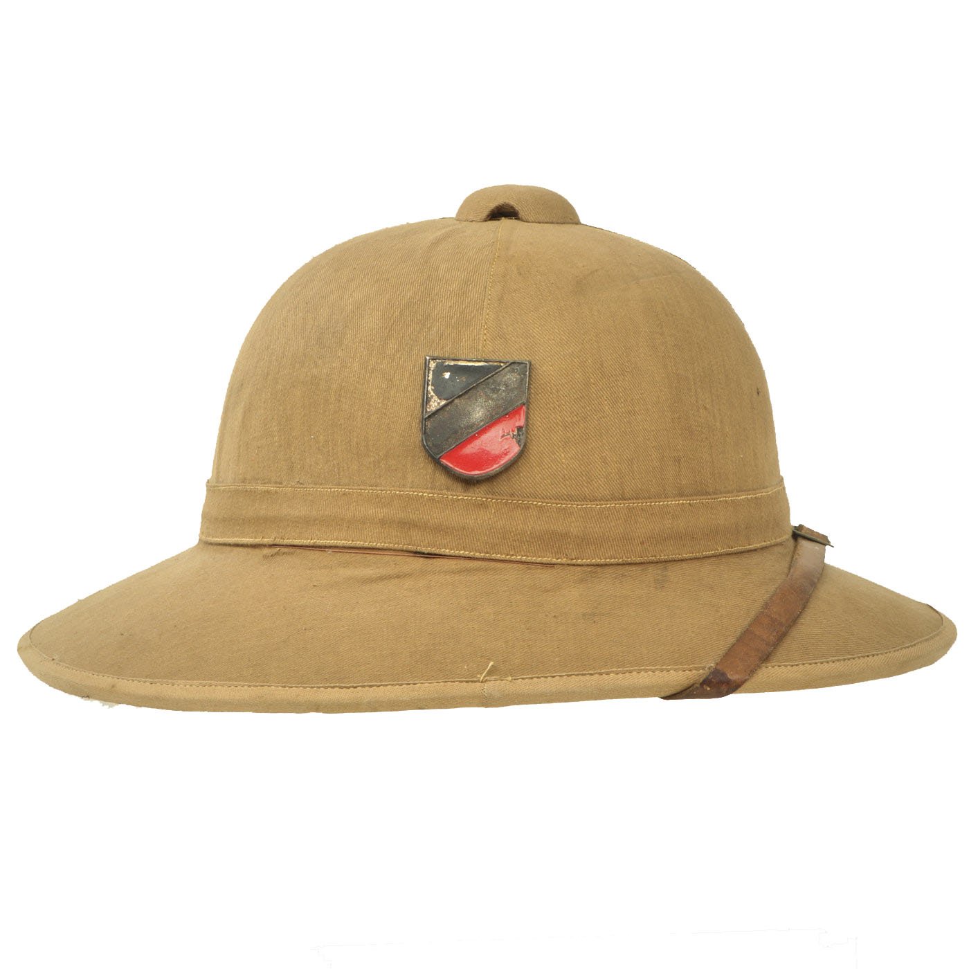 Original Item: On first deployment to North Africa in 1941, Deutsches Afrikakorps (DAK) troops were issued with the traditional European sun helmet known as Tropische Kopfbedeckung, of the type known to the British forces as the solar topi (or topee). In the German case, these were made of pith, were khaki in color and bore two metal shields; on the right the national colors and on the left the German eagle. There were several models made, with the first model having cotton outer covering made of six fabric panels sewn together.