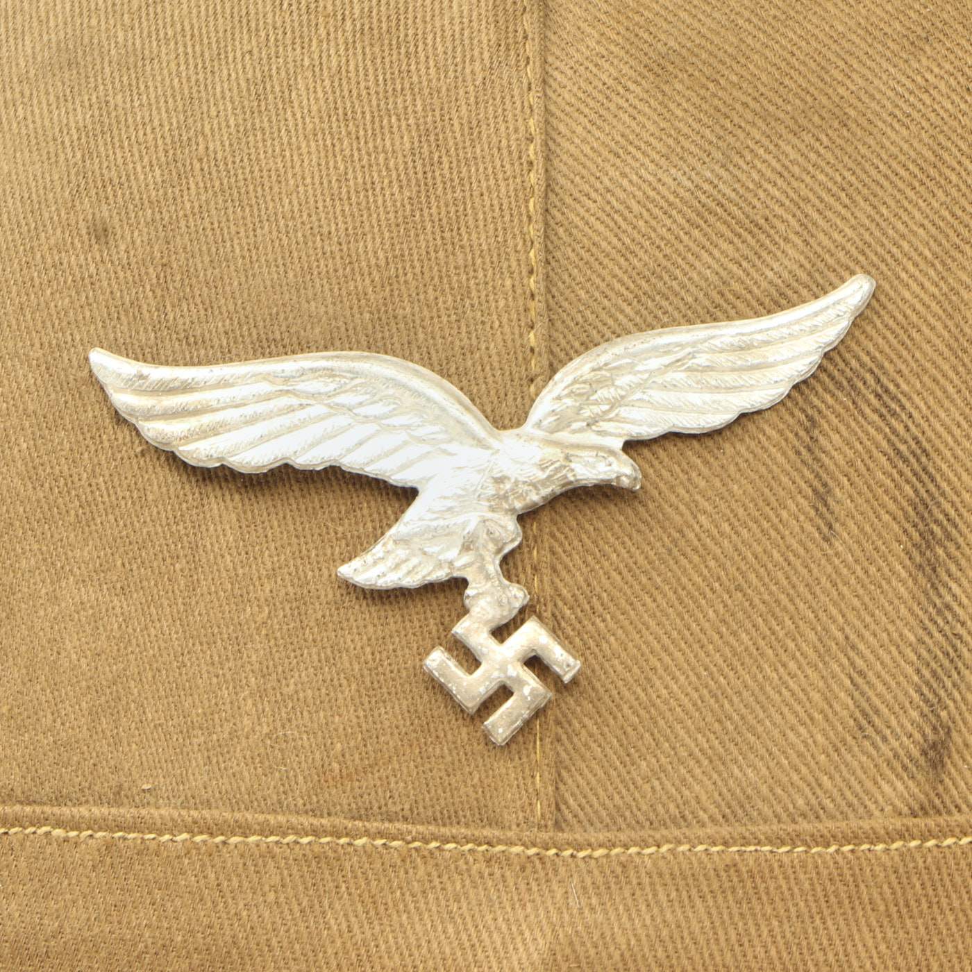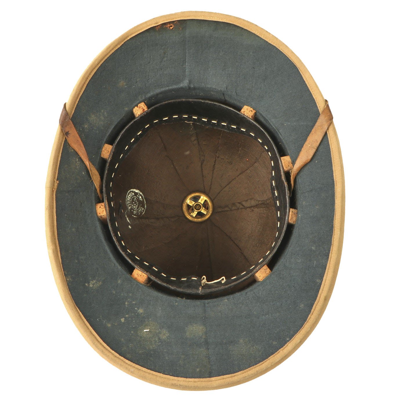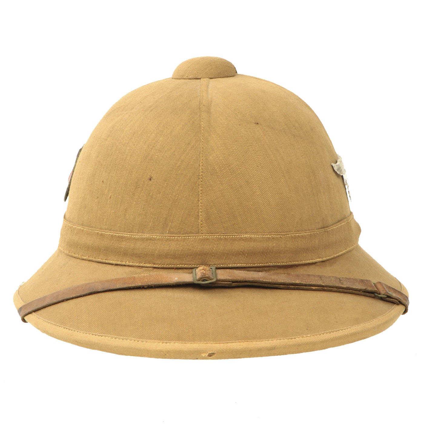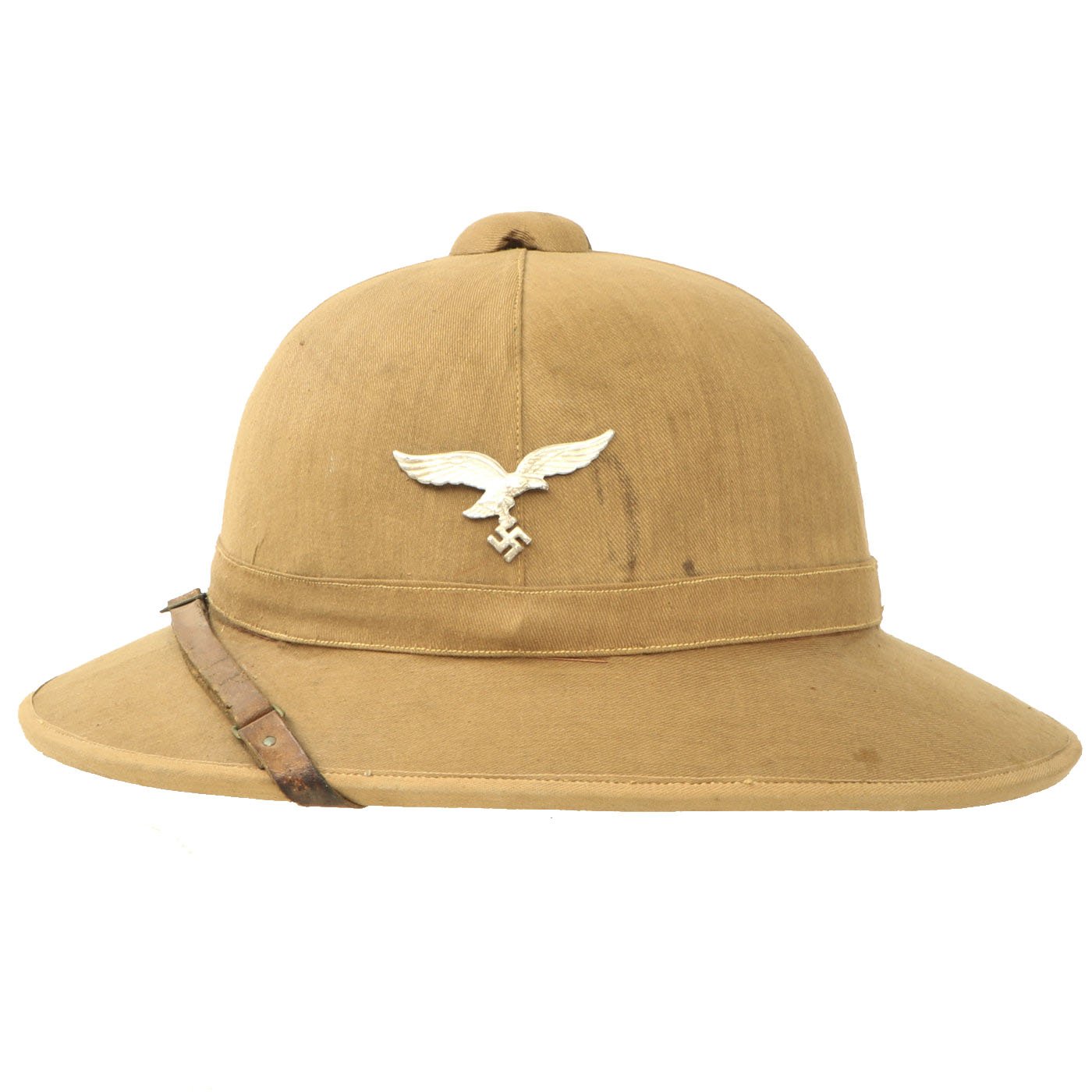 Original Item: On first deployment to North Africa in 1941, Deutsches Afrikakorps (DAK) troops were issued with the traditional European sun helmet known as Tropische Kopfbedeckung, of the type known to the British forces as the solar topi (or topee). In the German case, these were made of pith, were khaki in color and bore two metal shields; on the right the national colors and on the left the German eagle. There were several models made, with the first model having cotton outer covering made of six fabric panels sewn together.