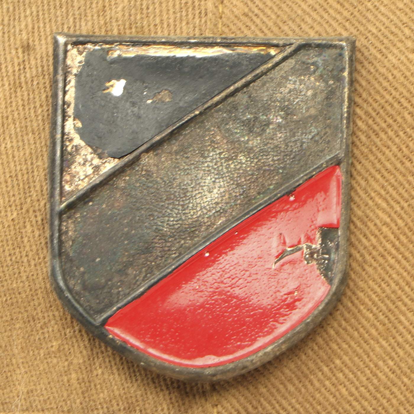 The metal badges are totally genuine and are in very good condition with a great finish, and very little wear. The aluminum Luftwaffe Eagle has a great look and lightly oxidized patina. The silver plated brass tricolor shield has held up slightly worse, with some paint loss. Also since it is silver plated, that has now tarnished to a dark patina.