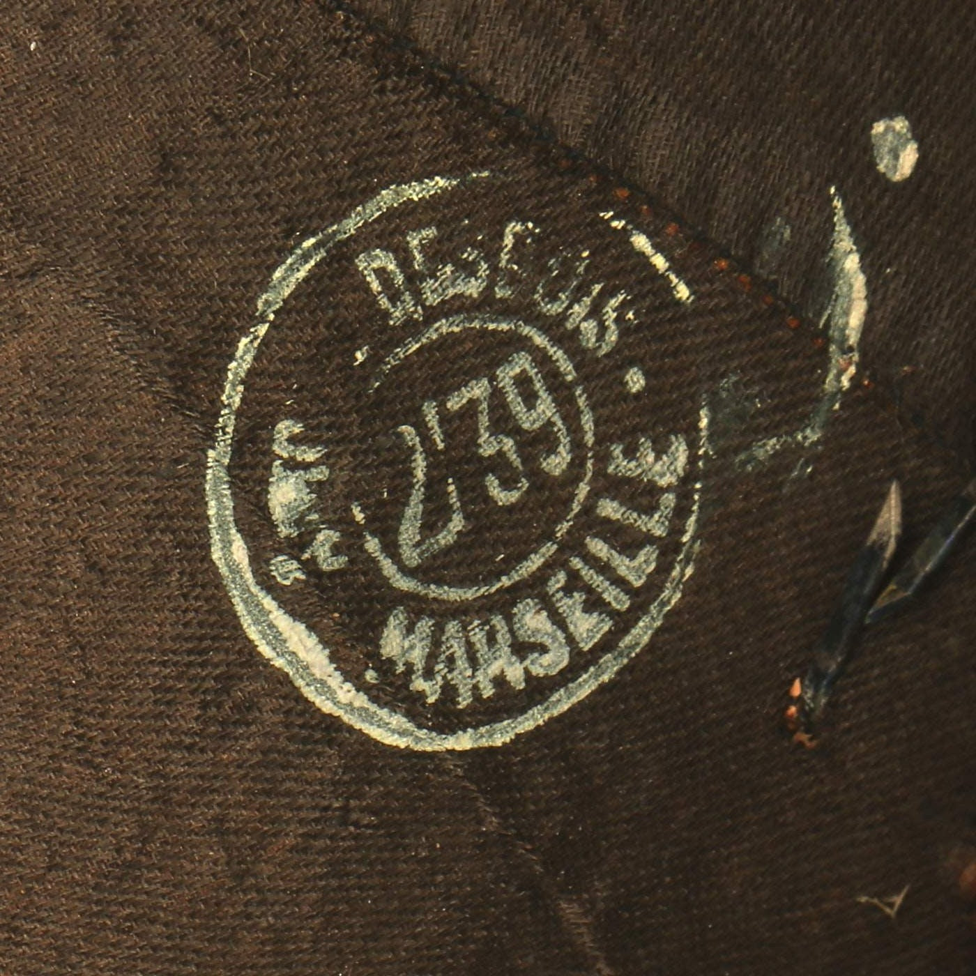 The interior of the helmet is still in good condition, though unlike the German issue, the brim is lined with navy blue, and inside the crown it is black. Inside there is a round manufacturer stamp, with the date 2 / 39 in the center, over the French city of MARSEILLE. This is a port city on the Southern Coast of France, and is exactly where a German Soldier might have embarked for the voyage to the North African countries of Algiers or Tunisia. After the fall of France in 1940, these were now under the control of the German-sympathetic Vichy French government. The liner itself is in very good condition, with the black finished leather still supple, and the 8 cork spacers still intact. There is a blue size label reading 57 inside the front of the helmet.