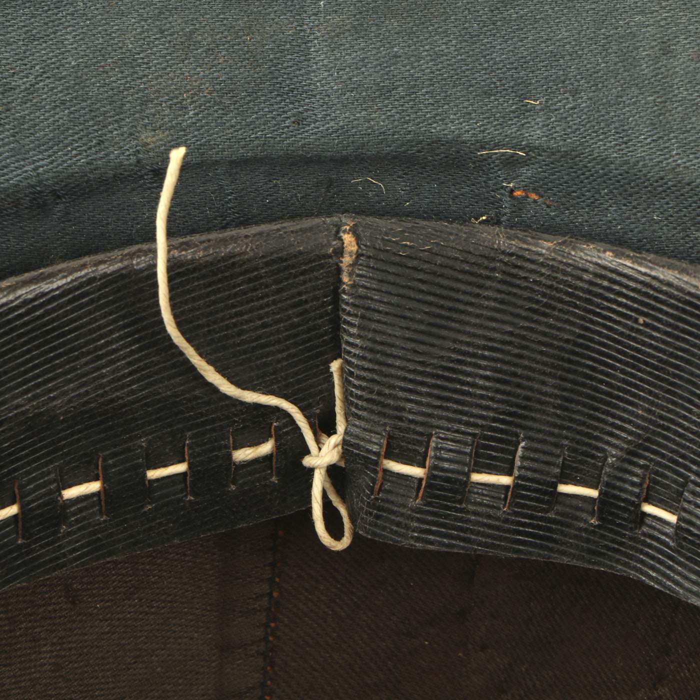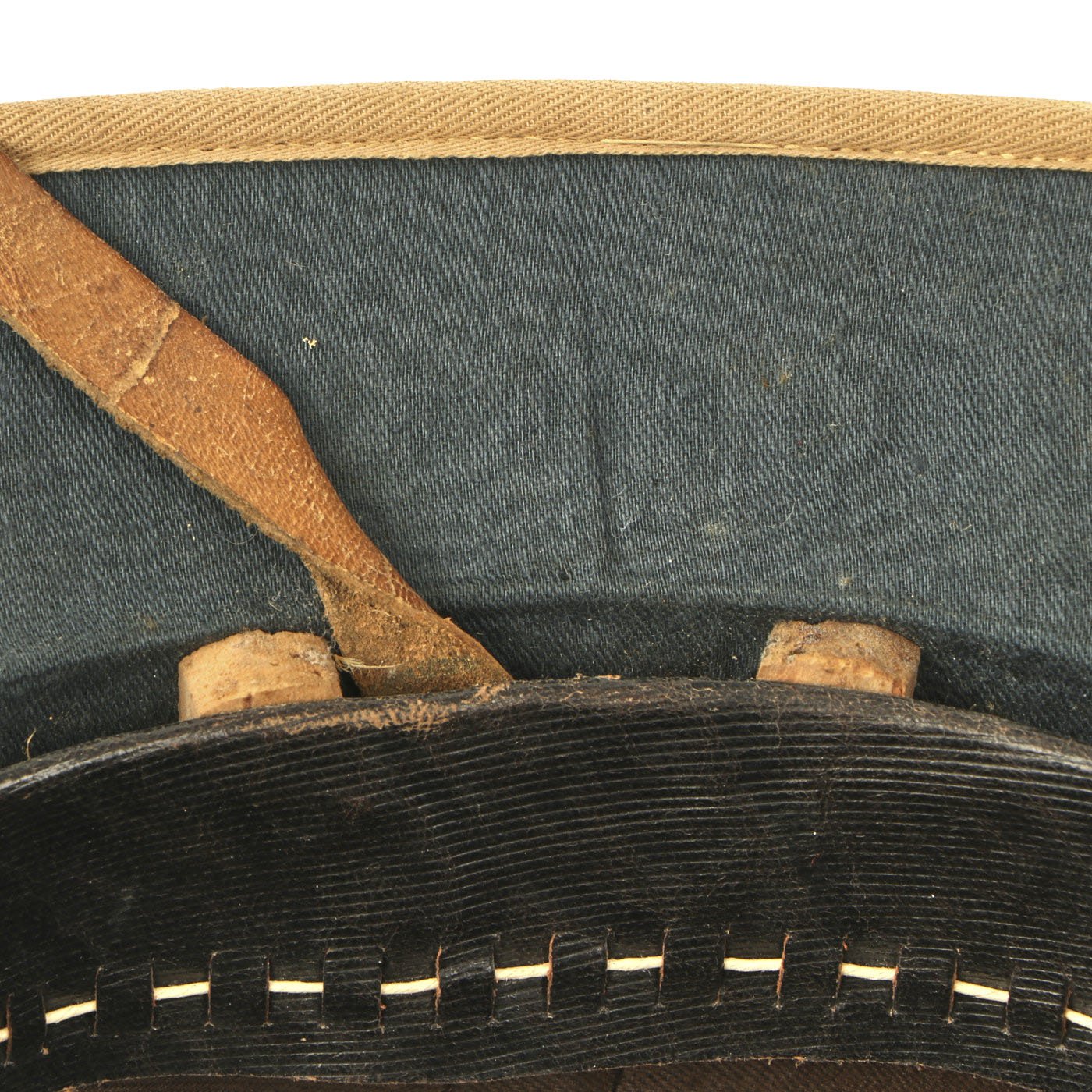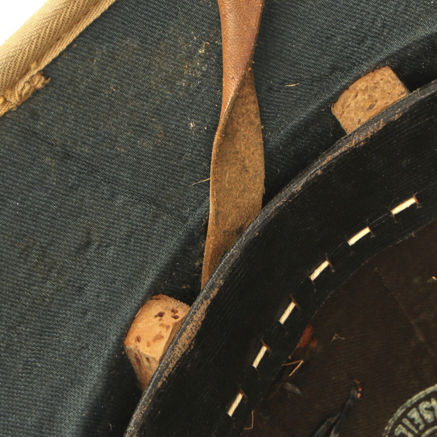 However, we quickly noticed that this example has four panels on the outside, instead of six, and the prominent ventilation holes in the crown were missing. A closer look shows that while this was indeed used by the DAK Luftwaffe, it was in fact made in France before the fall to the Germans, and then was pressed into service. It still has all components present, including the often missing chinstrap and badges. The original khaki cloth covering is intact and retains its original color. The helmet band, is in very good condition, and still hides the liner split pins. The rim is cloth, not leather like the German type. The chinstrap shows some age and cracking, but is still complete.