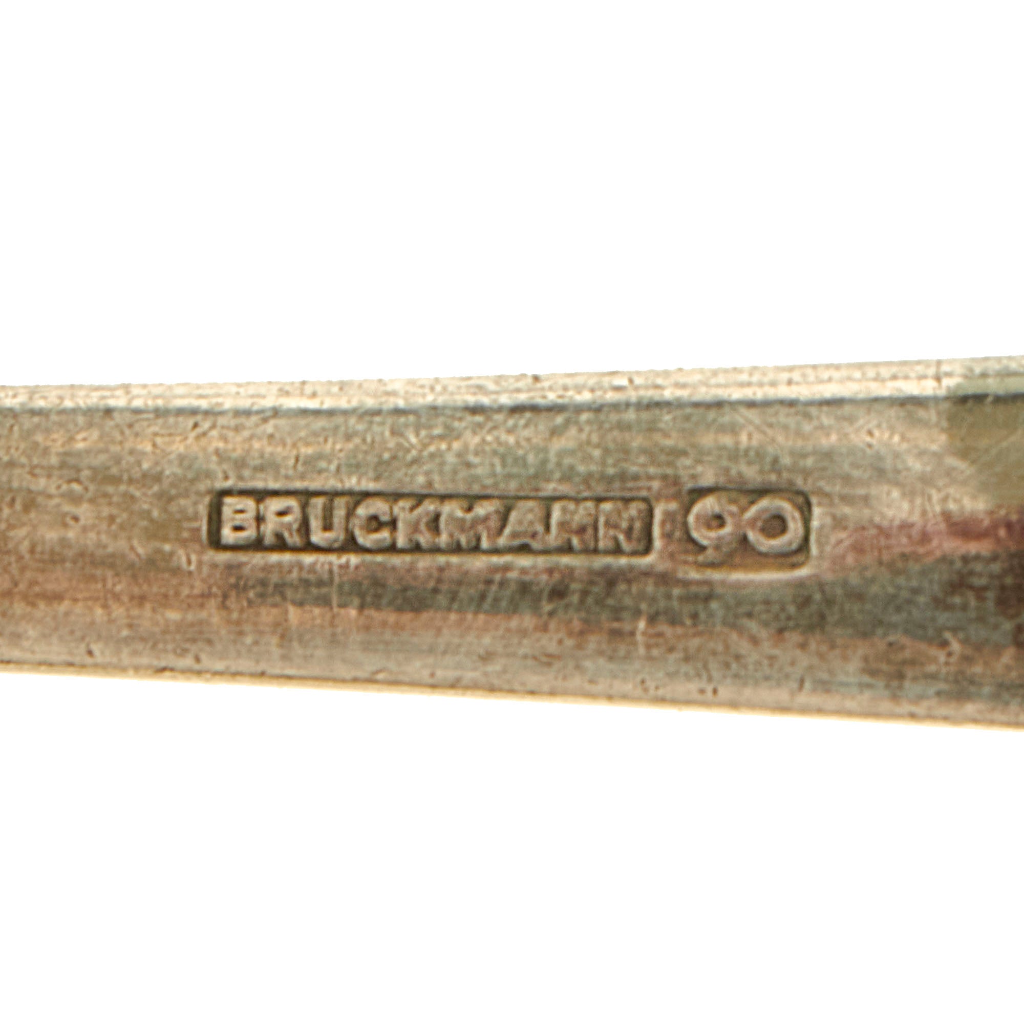 The serving spoon measures 8 5/16" long, and is marked on the front with an embossed / relief Gau Thuringen (Thuringia) Eagle logo, which has an Eagle with its wings at a right angle to each other, perched on a "static" swas (hook cross). The rear is marked by maker BRUCKMANN (Bruckmann & Sohne), along with 90, which indicates it is silver plated.