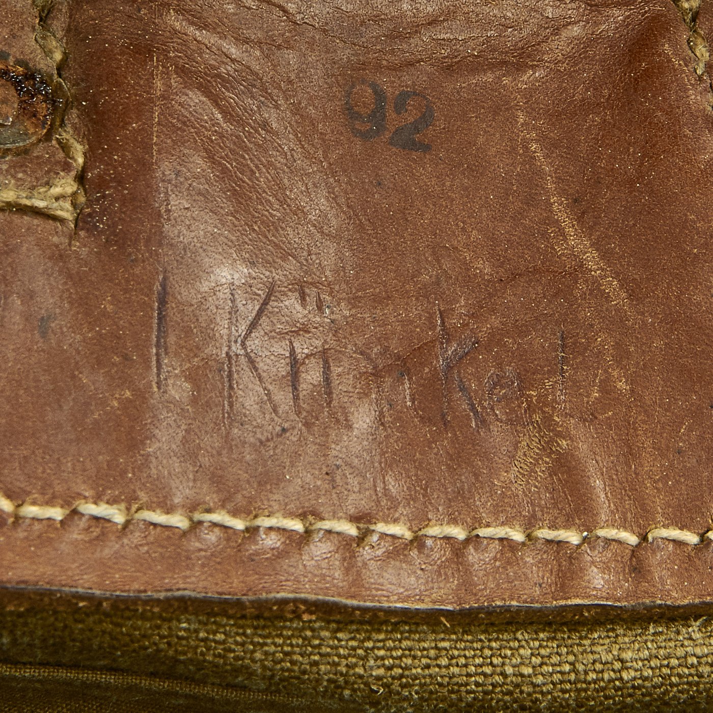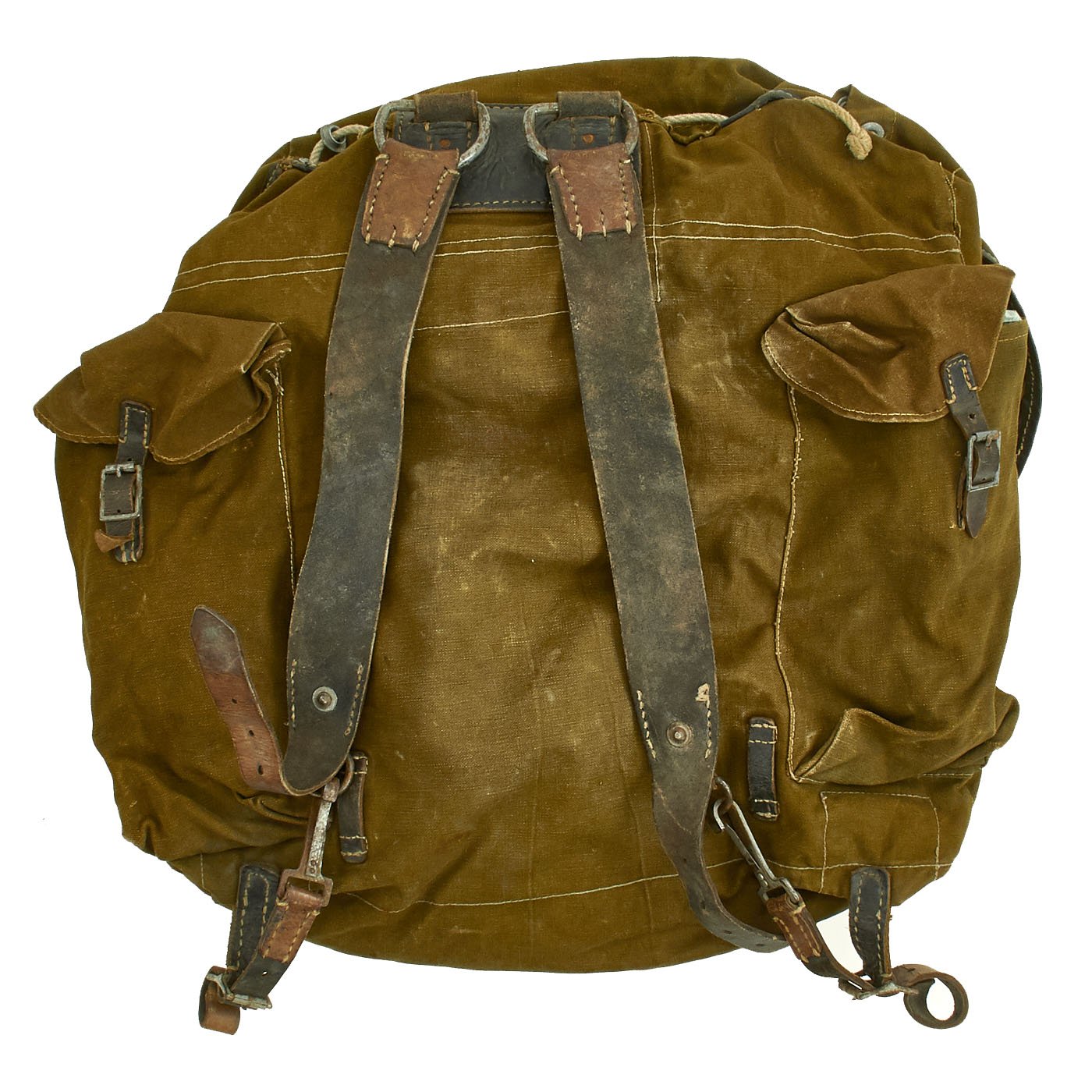 Condition is very good, especially considering the age. The shoulder straps are complete and intact, and are the type permanently attached to the rings. Both sides are secured to the bottom straps with spring clips. The interior is very nice, with the expected wear from age. All pockets and compartments look to be intact. The various buckles and straps also all look to be present. It even has a field added pocket on the outside for storing a rifle cleaning kit. There is definitely wear and some small tears, as well as some grommets that have come loose, giving it a great field used look.