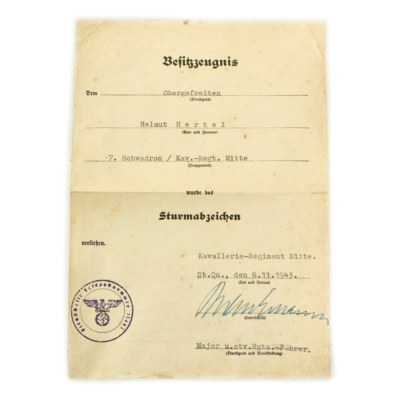 As a rare treat, this award comes complete with its original named and dated Besitzzeugnis "possession/award" certificate! The award document indicates that it was awarded to Obergefreiten Helmut Hertel of 7. Schwadron / Kav.-Regt. Mitte on 6.11.1943. We have not been able to locate specific service information on Hertel, however Kavallerie Regiment Mitte (Cavalry Regiment center) was a force formed by Lieutenant Georg von Boeselager as the Boeselager Mounted Force. This basically united the various mounted reconnaissance units throughout the front.