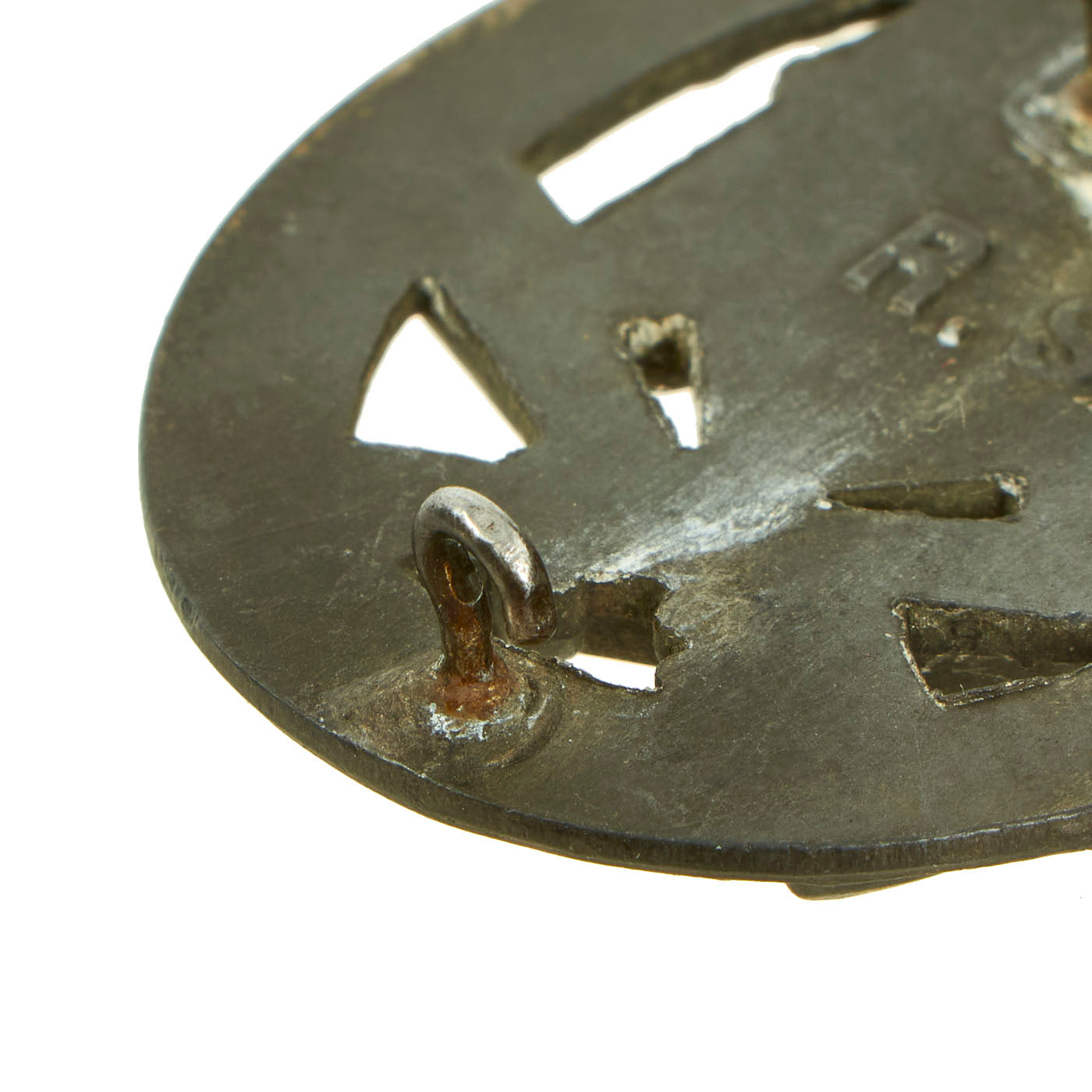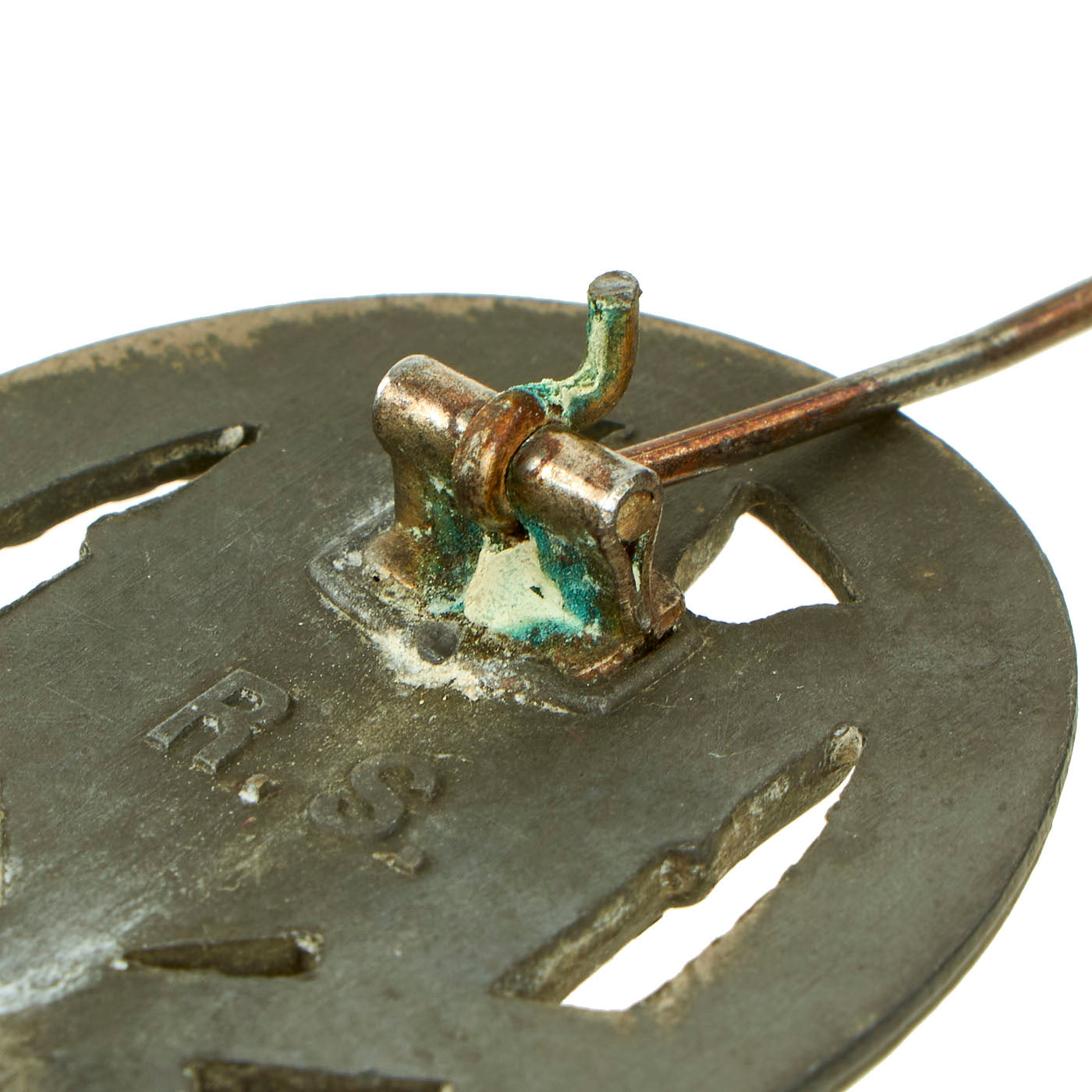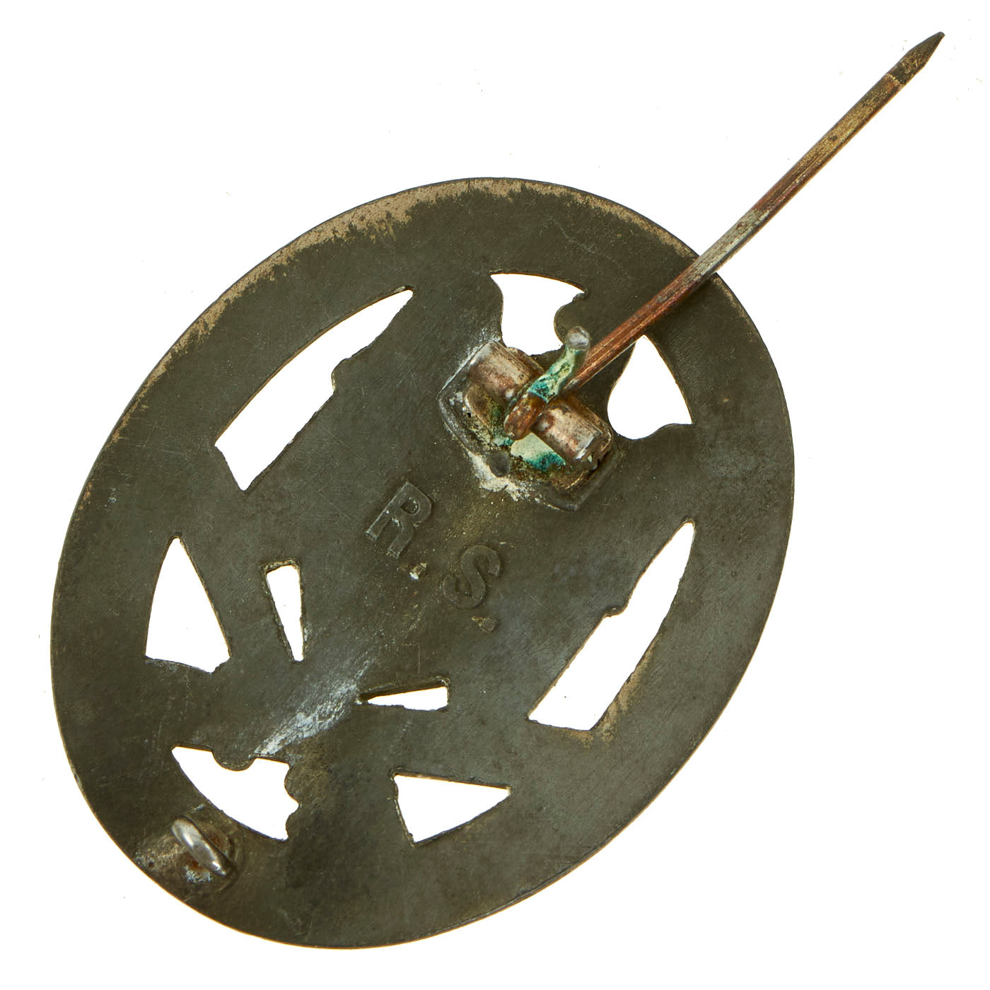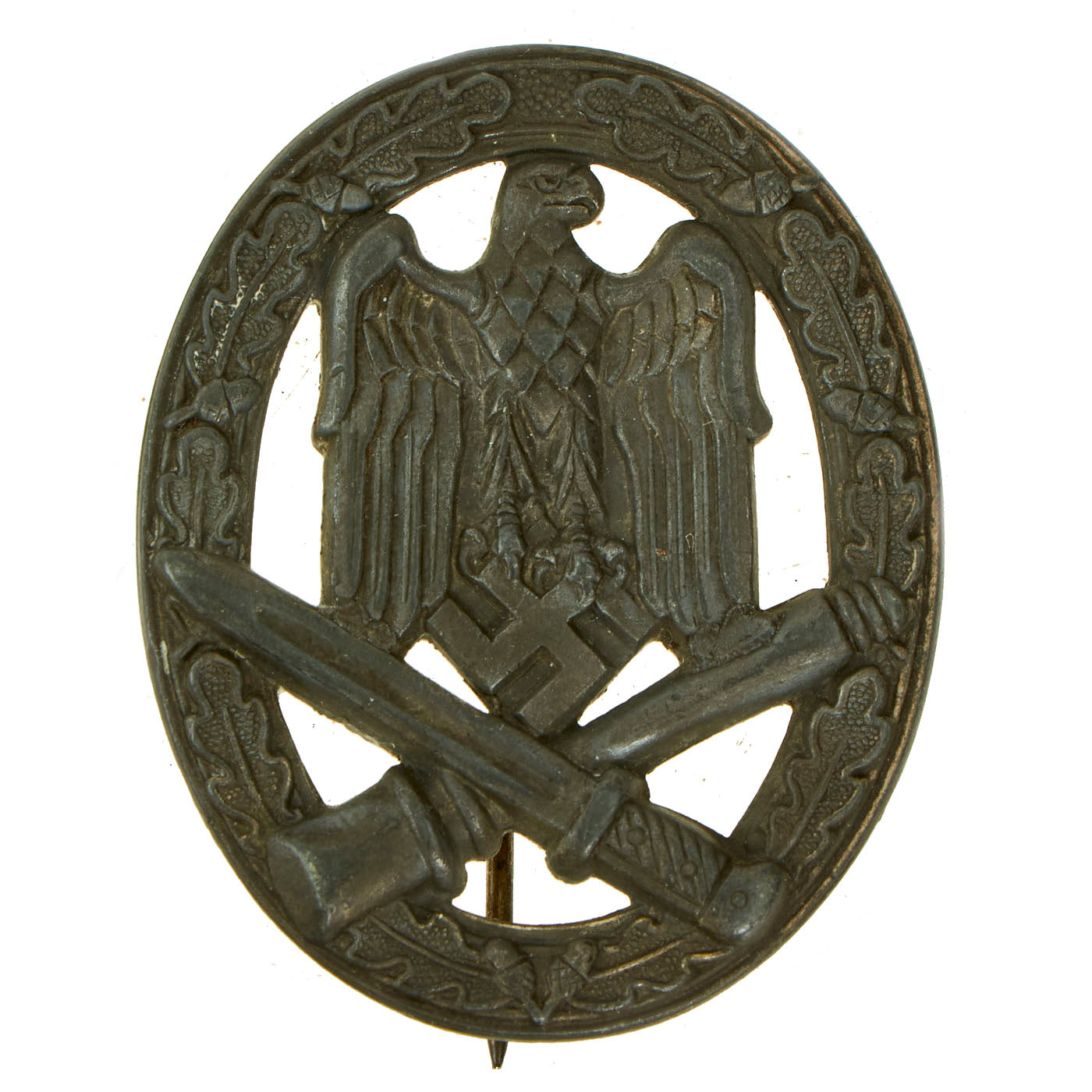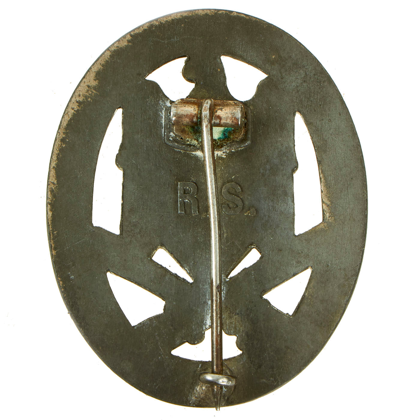 Original Items: Only One Available. This is an excellent condition General Assault Badge with a Solid Back and functional pin. The badge measures approximately 2 1/8" x 1 5/8", and is in very good condition. The die struck zinc alloy body unfortunately has lost almost all of the original silvering, which is quite common. It presently is only visible around the edges. The back has a very nice steel pin and barrel hinge, which locks into a soldered in hook. It bears maker mark R. S. under the hinge, which represents manufacture by Rudolf Souval of Wien (Vienna), Austria.