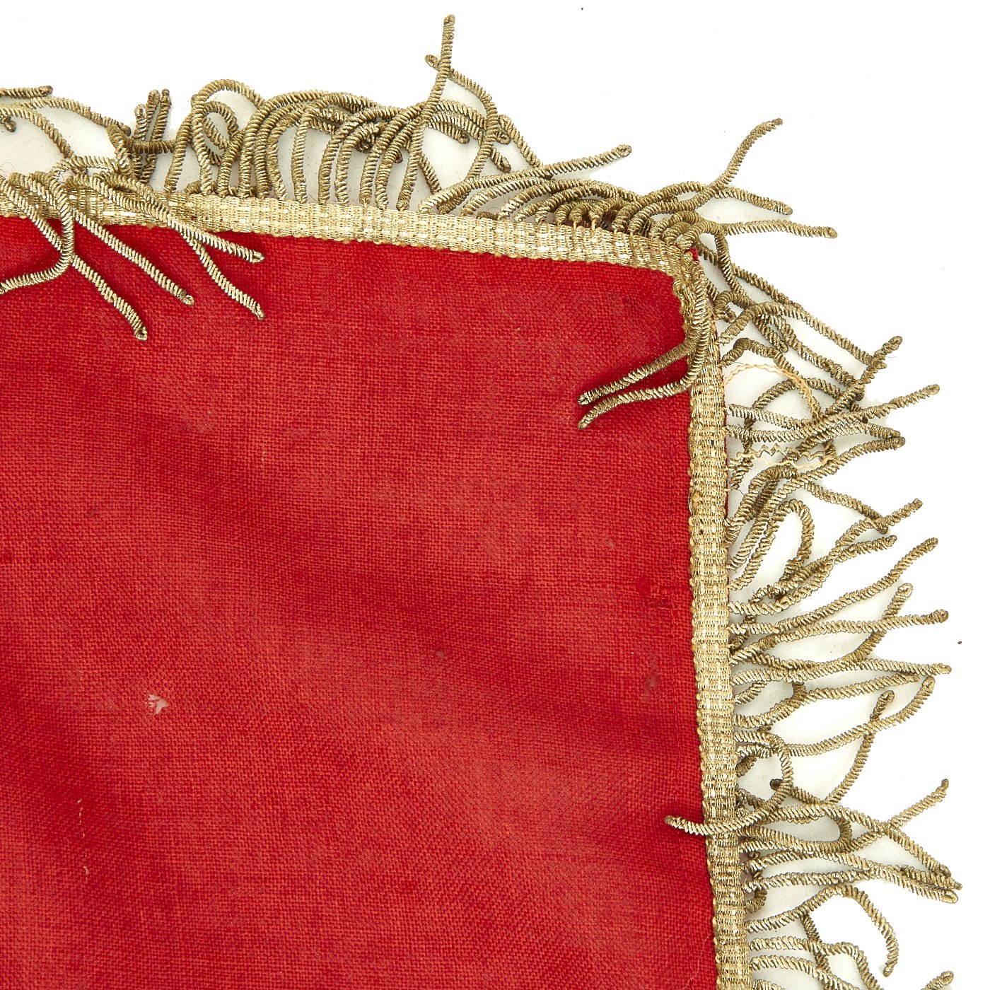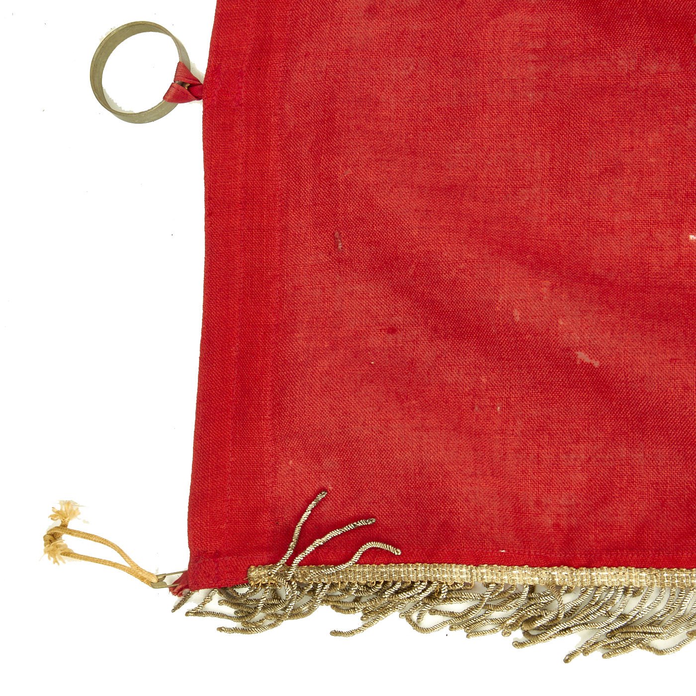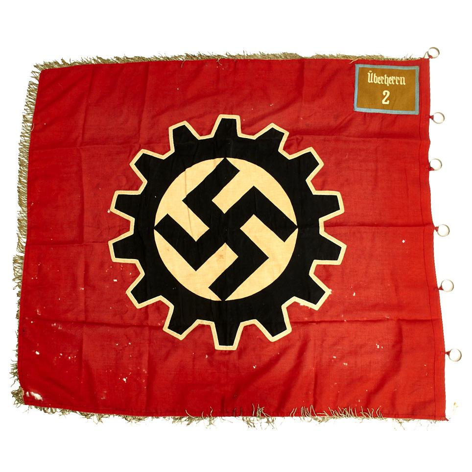 Original Item: Only One Available. The DAF (Deutsche Arbeitsfront or German Labor Front) was a National Socialist trade union that supplanted independent unions once the NSDAPs had come to power in Germany. This 47" x 52" Fringed Flag was most likely originally displayed on a pole inside DAF offices. It appears to be made of woven red wool, with cotton white and black DAF emblems on each side. The fringe is silver bullion, and is relatively heavy. It still has several metal hanger rings installed on the header, which were used to secure it to a pole.