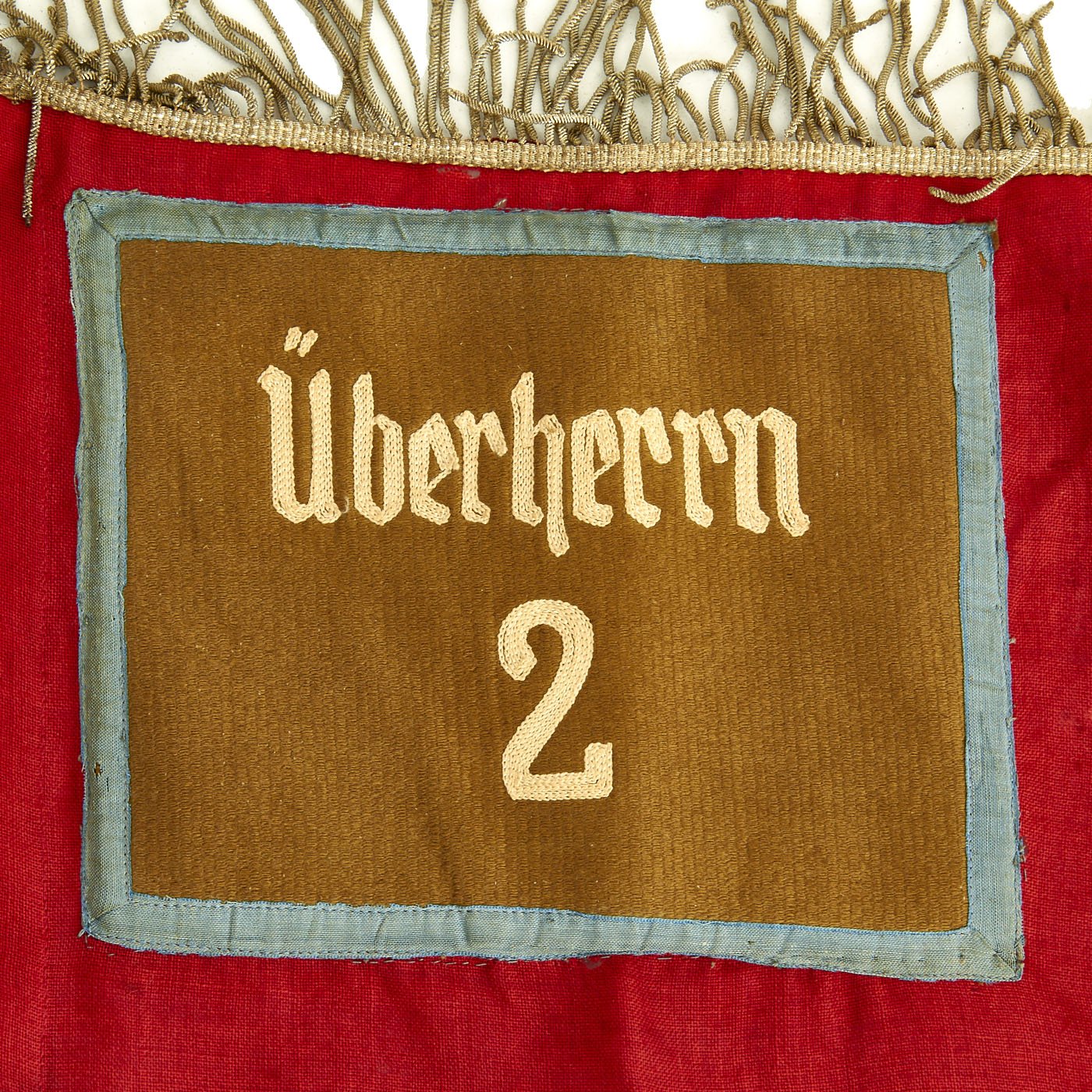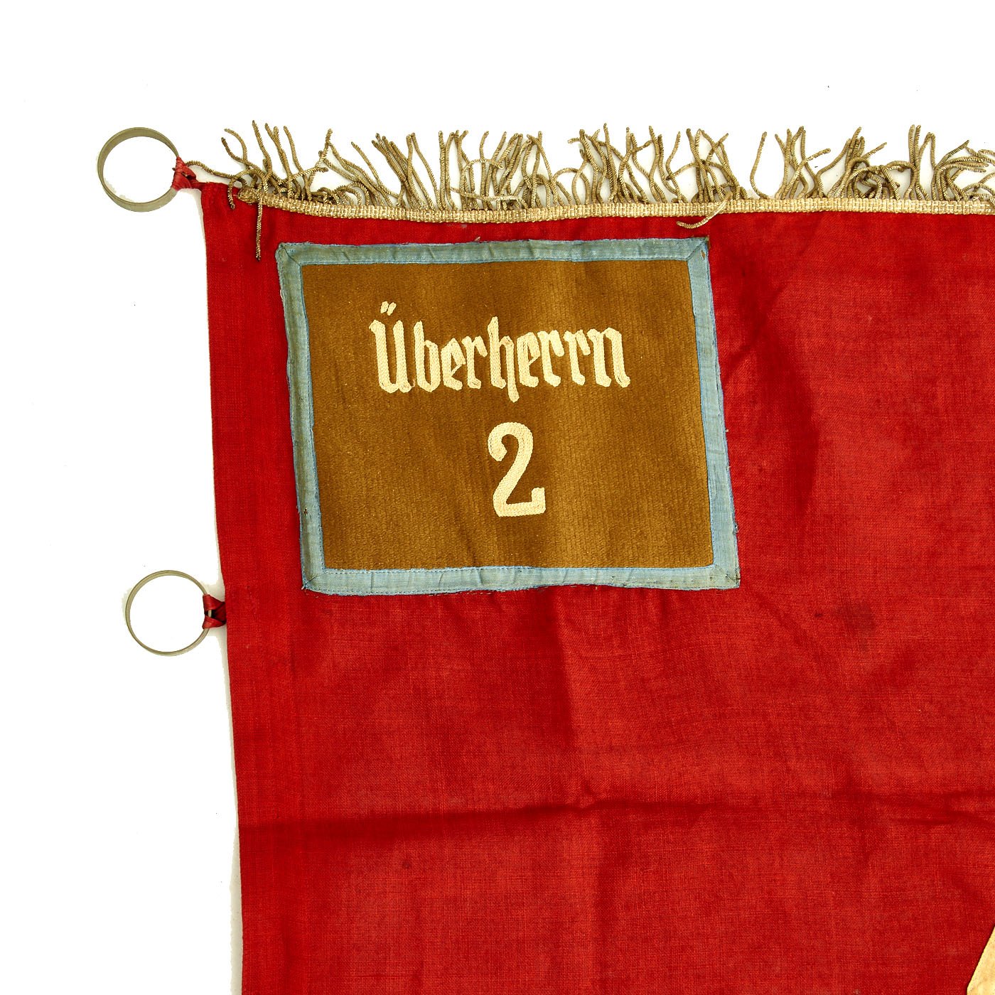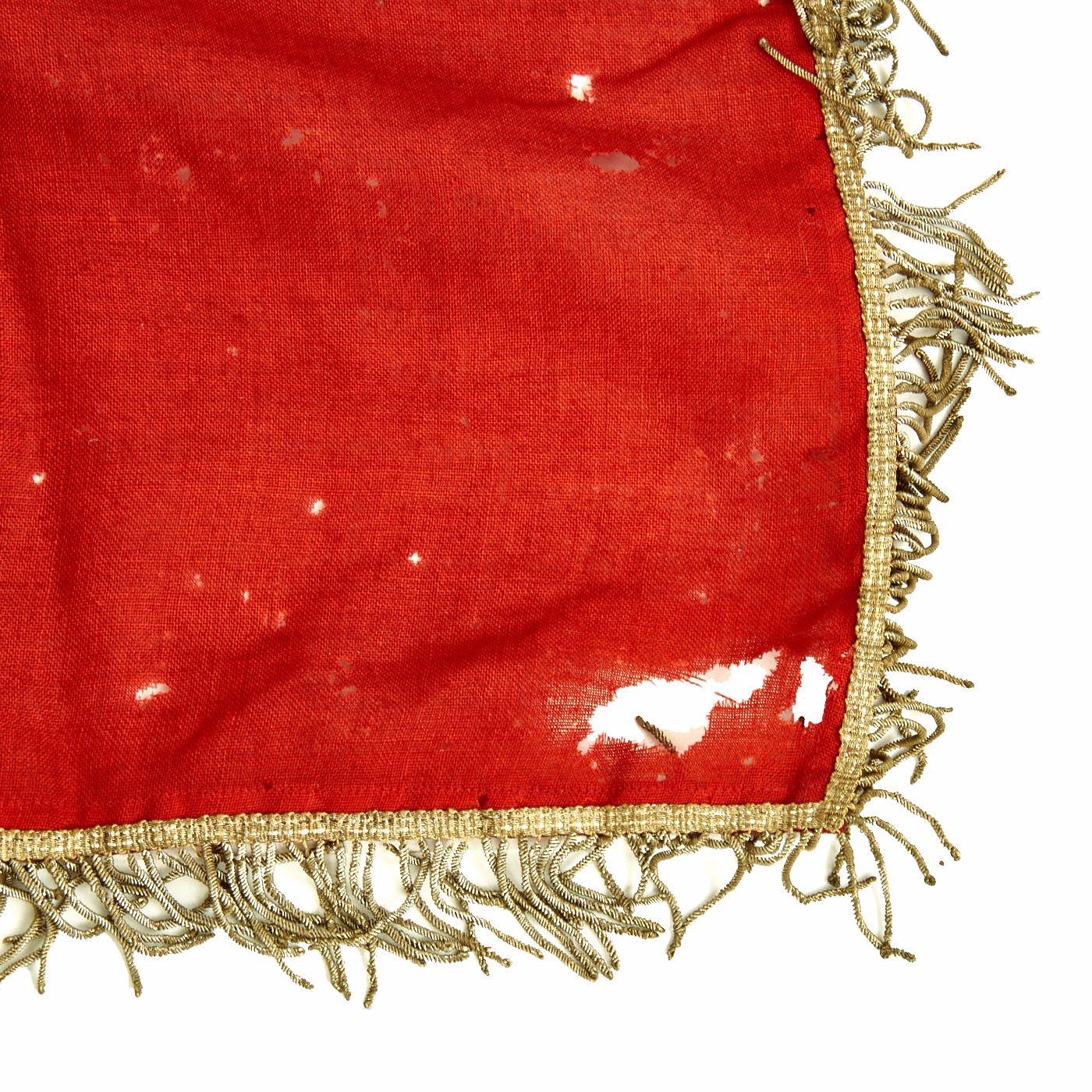 Original Item: Only One Available. The DAF (Deutsche Arbeitsfront or German Labor Front) was a National Socialist trade union that supplanted independent unions once the NSDAPs had come to power in Germany. This 47" x 52" Fringed Flag was most likely originally displayed on a pole inside DAF offices. It appears to be made of woven red wool, with cotton white and black DAF emblems on each side. The fringe is silver bullion, and is relatively heavy. It still has several metal hanger rings installed on the header, which were used to secure it to a pole.