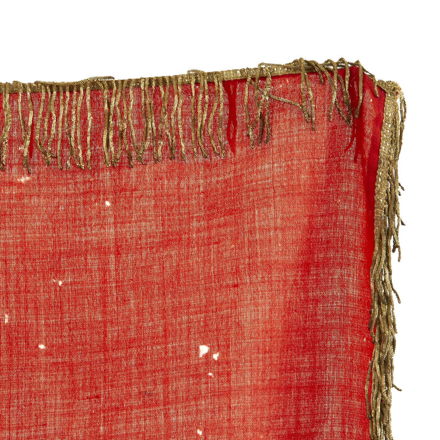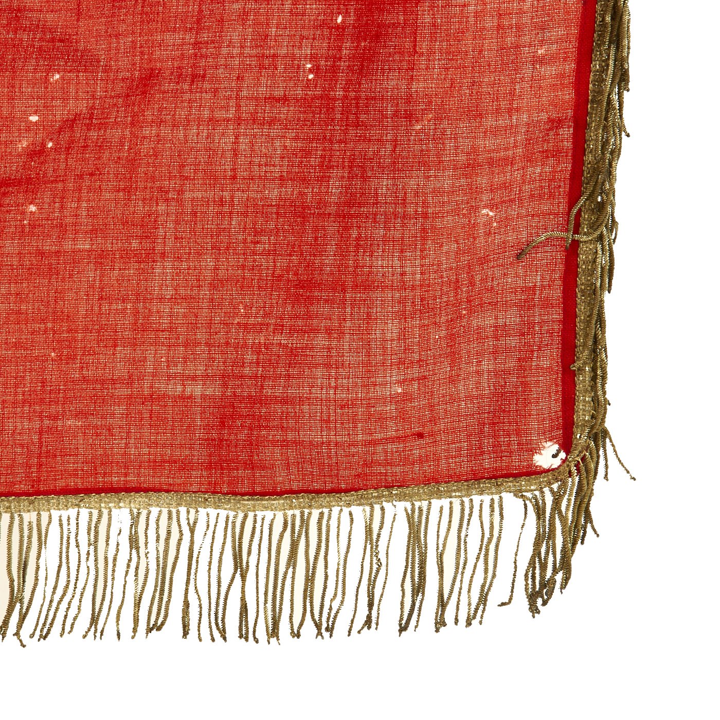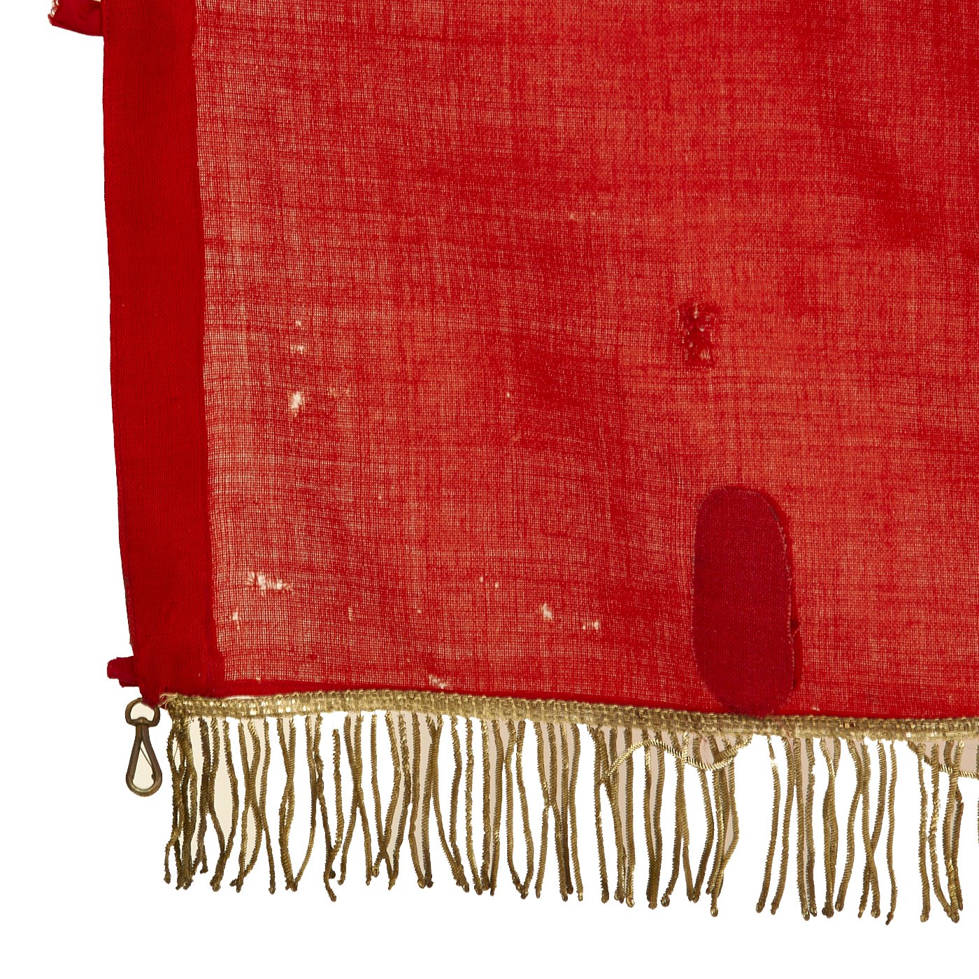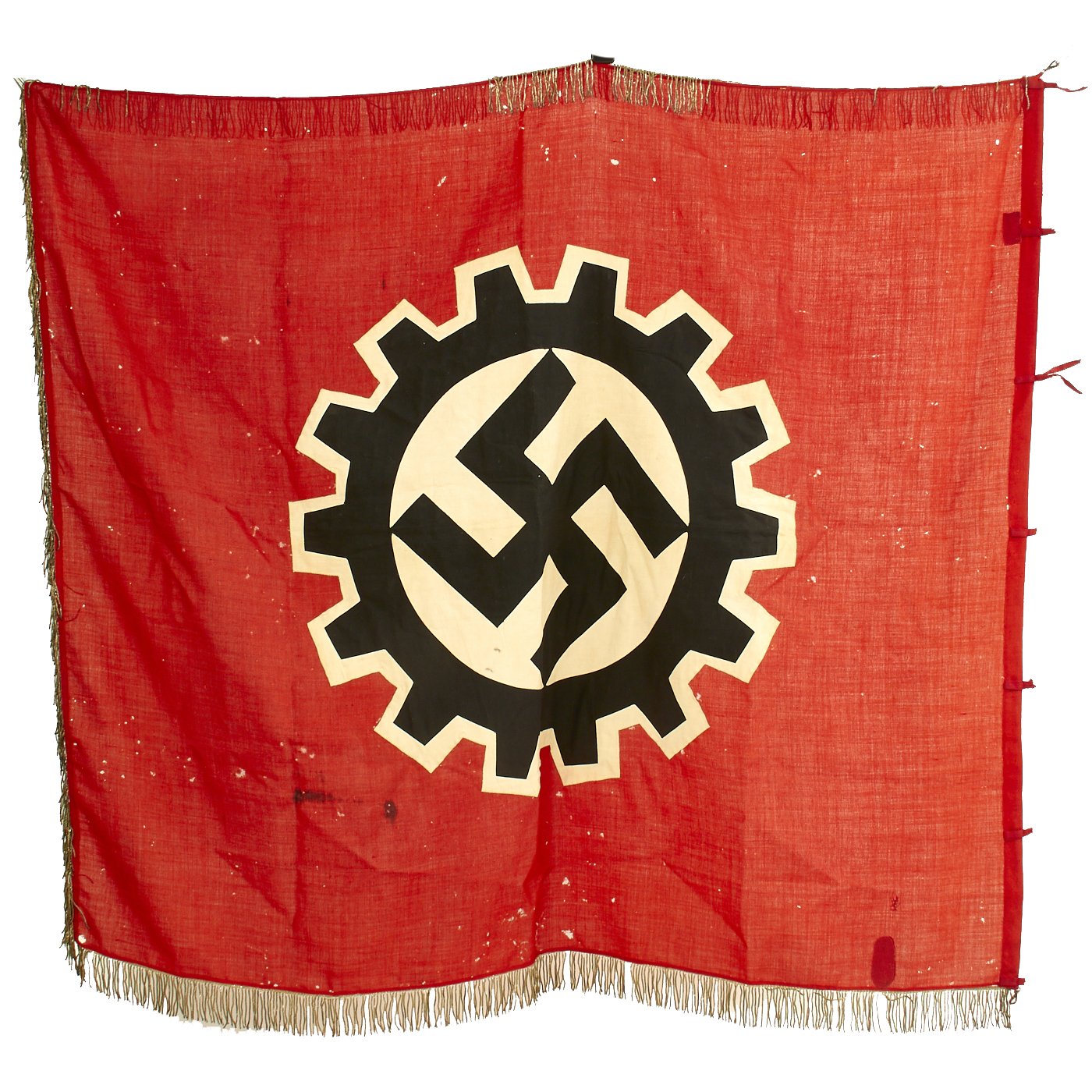 Original Item: Only One Available. The DAF (Deutsche Arbeitsfront or German Labor Front) was a National Socialist trade union that supplanted independent unions once the NSDAPs had come to power in Germany. This 48" x 54" Fringed Flag was most likely originally displayed on a pole inside DAF offices. It appears to be made of woven red wool, with cotton white and black DAF emblems on each side. The fringe is silver bullion, and is relatively heavy. It still has remnants of the cloth ties used to attach it to a pole on the header, though all but one have been cut off. There are still two small spring clips at the ends of the header.