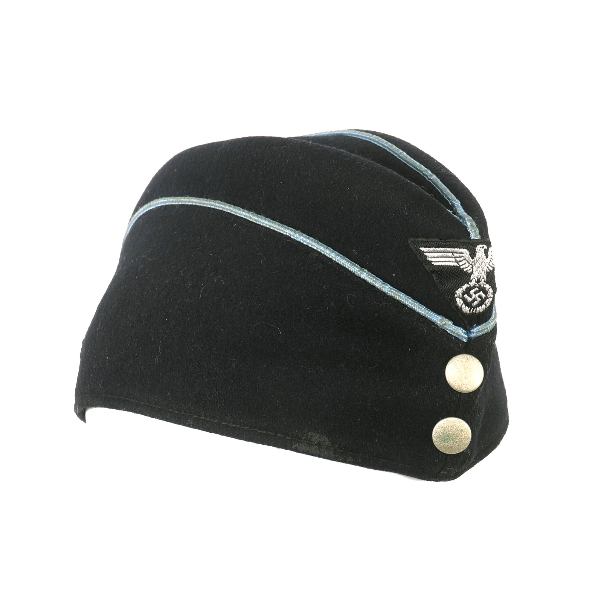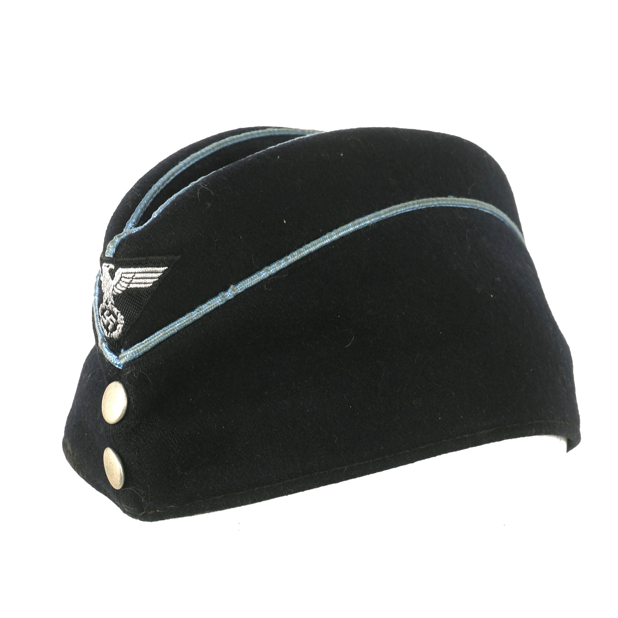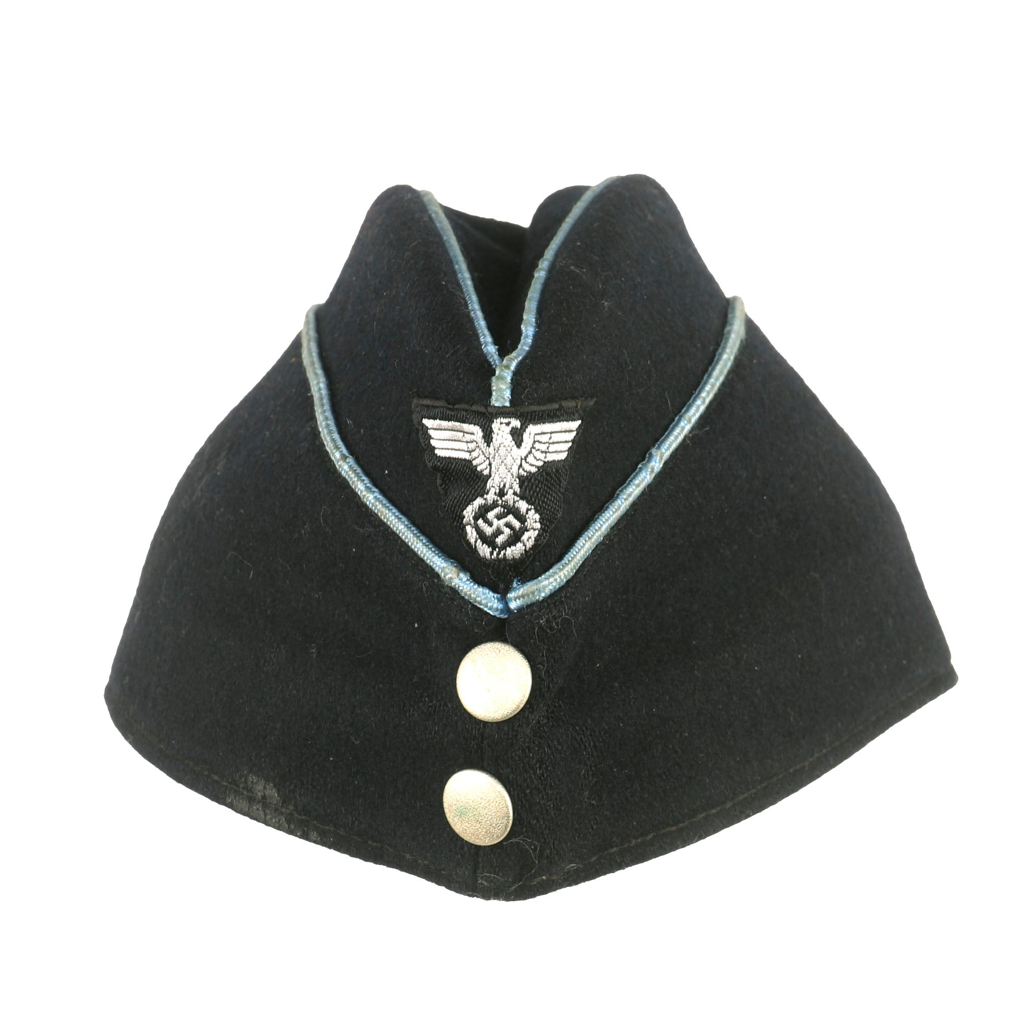 Original Item: Only One Available. The DAF (Deutsche Arbeitsfront or German Labor Front) was a National Socialist trade union that supplanted independent unions once the NSDAPs had come to power in Germany. This fantastic example of a Second Pattern DAF Leaders overseas cap that is constructed of fine dark navy blue wool. This cap is offered in very good condition with light wear. The front center of the cap features the machine embroidered BeVo style national eagle on black background and two aluminum buttons on the front. The top of the cap and the faux flaps on the side piped with blue. There is no size marking but it is approximately Size 7.