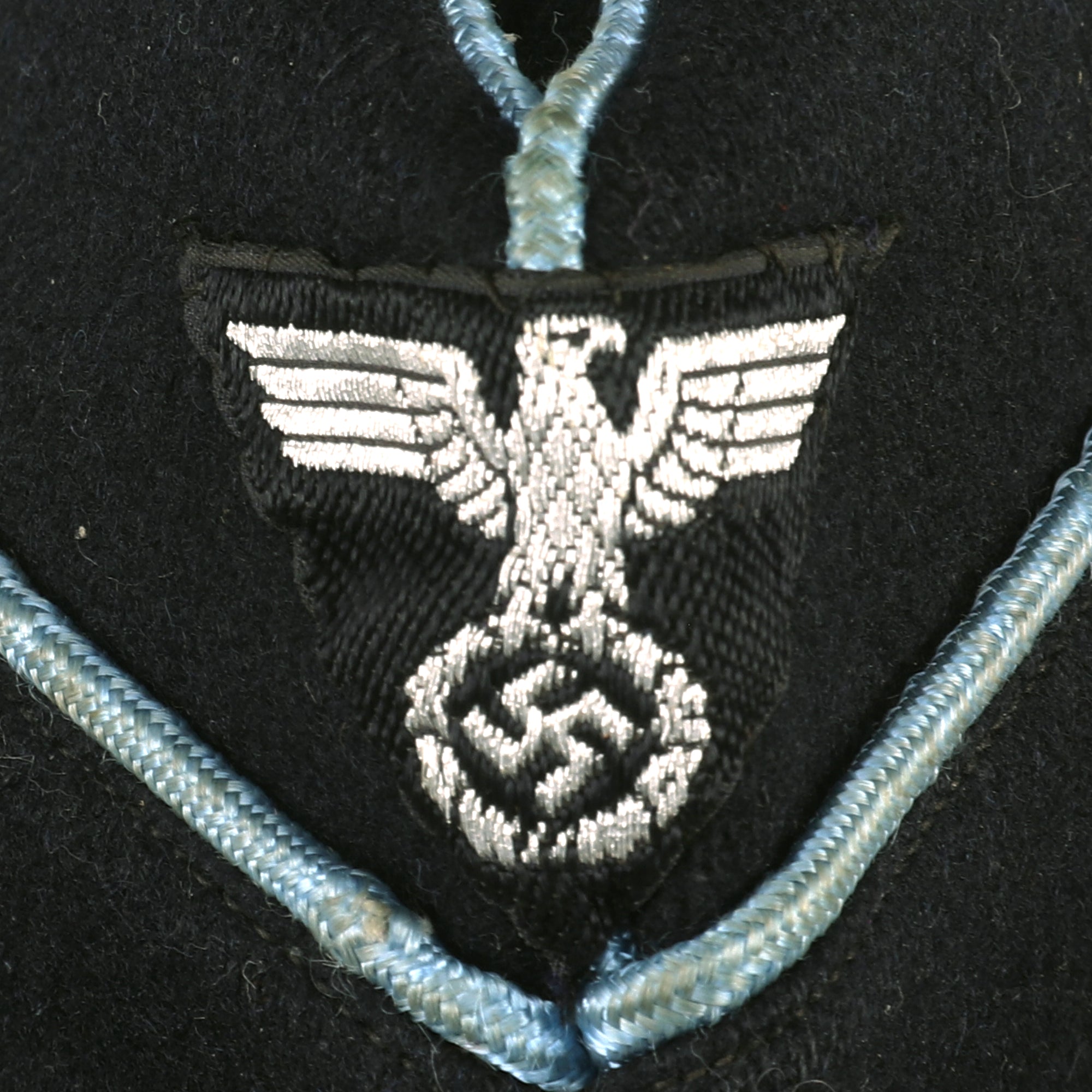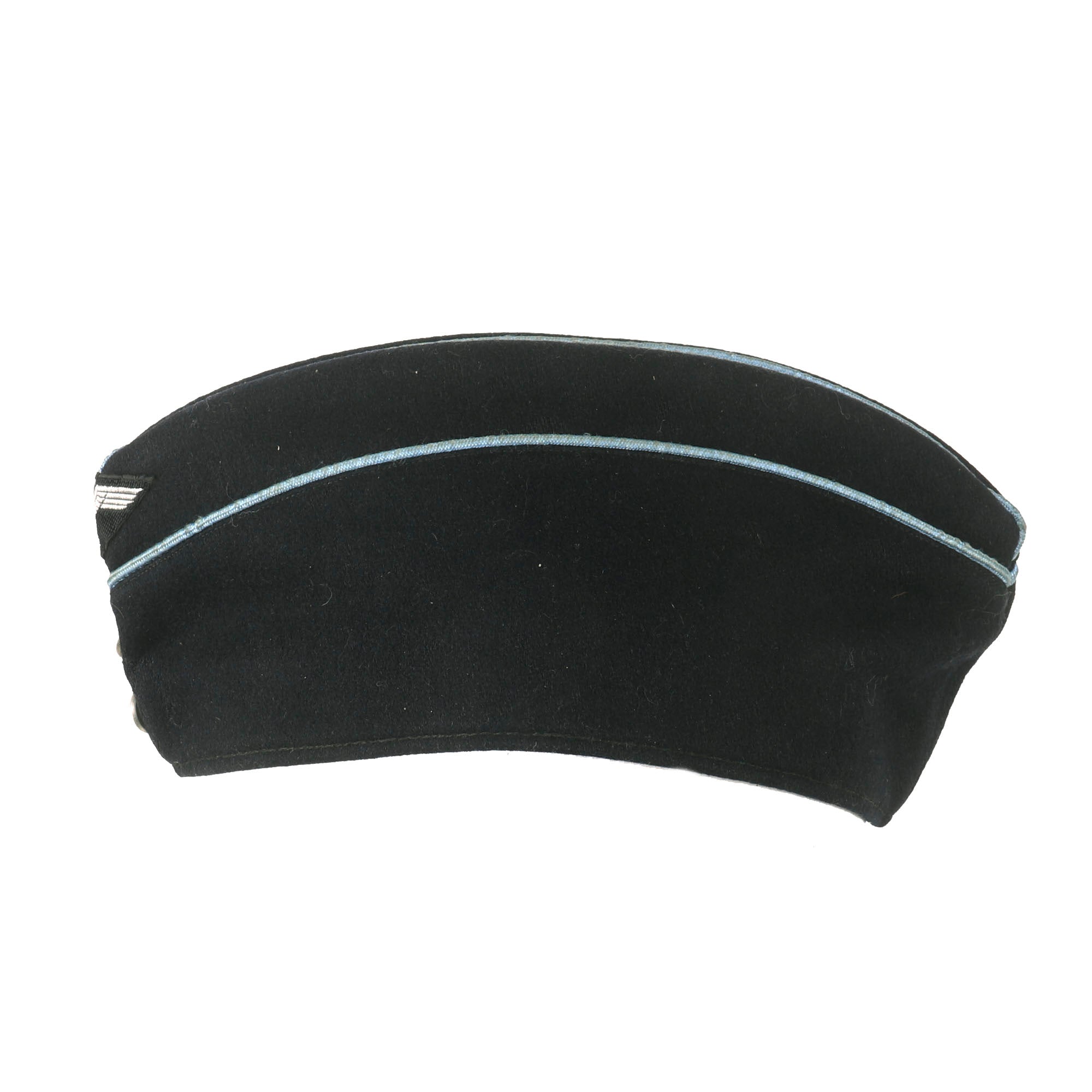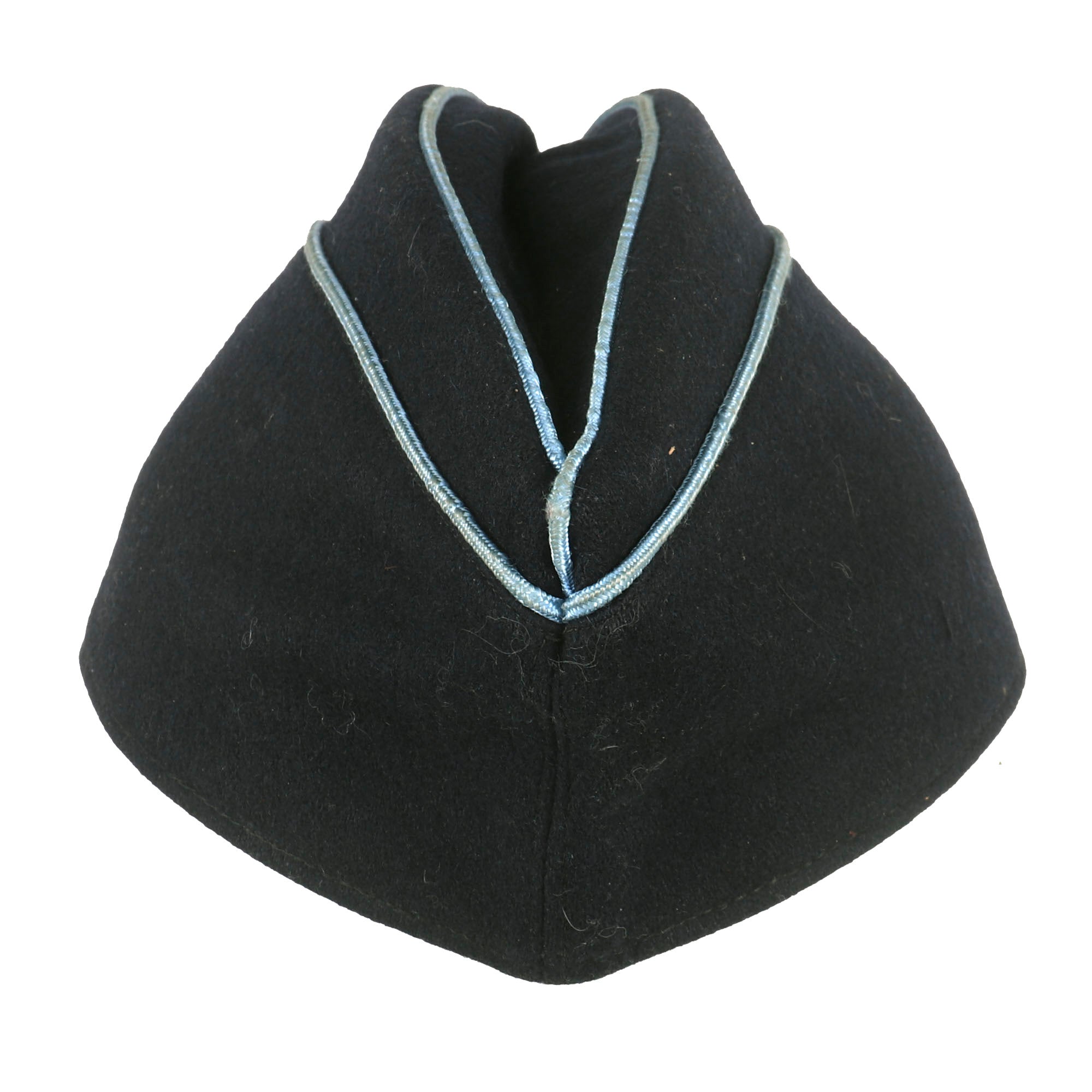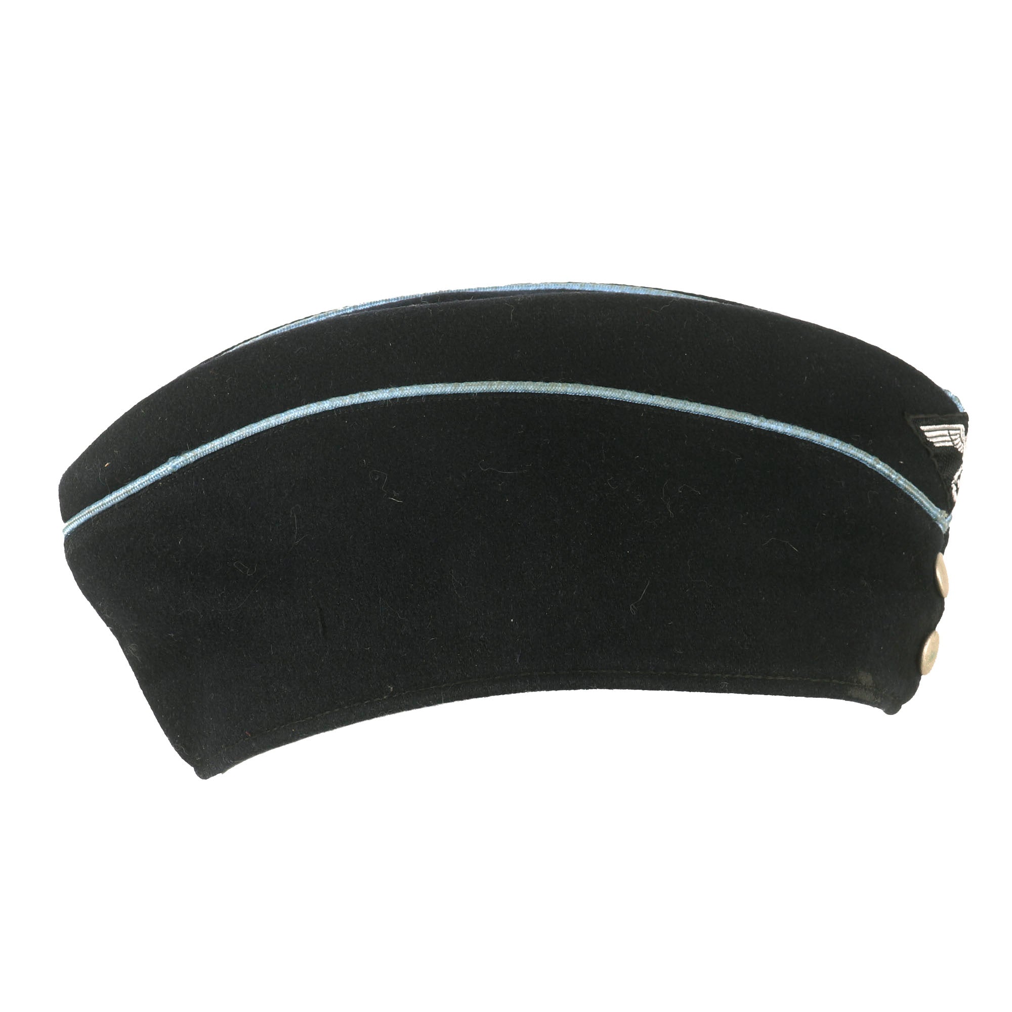 Original Item: Only One Available. The DAF (Deutsche Arbeitsfront or German Labor Front) was a National Socialist trade union that supplanted independent unions once the NSDAPs had come to power in Germany. This fantastic example of a Second Pattern DAF Leaders overseas cap that is constructed of fine dark navy blue wool. This cap is offered in very good condition with light wear. The front center of the cap features the machine embroidered BeVo style national eagle on black background and two aluminum buttons on the front. The top of the cap and the faux flaps on the side piped with blue. There is no size marking but it is approximately Size 7.