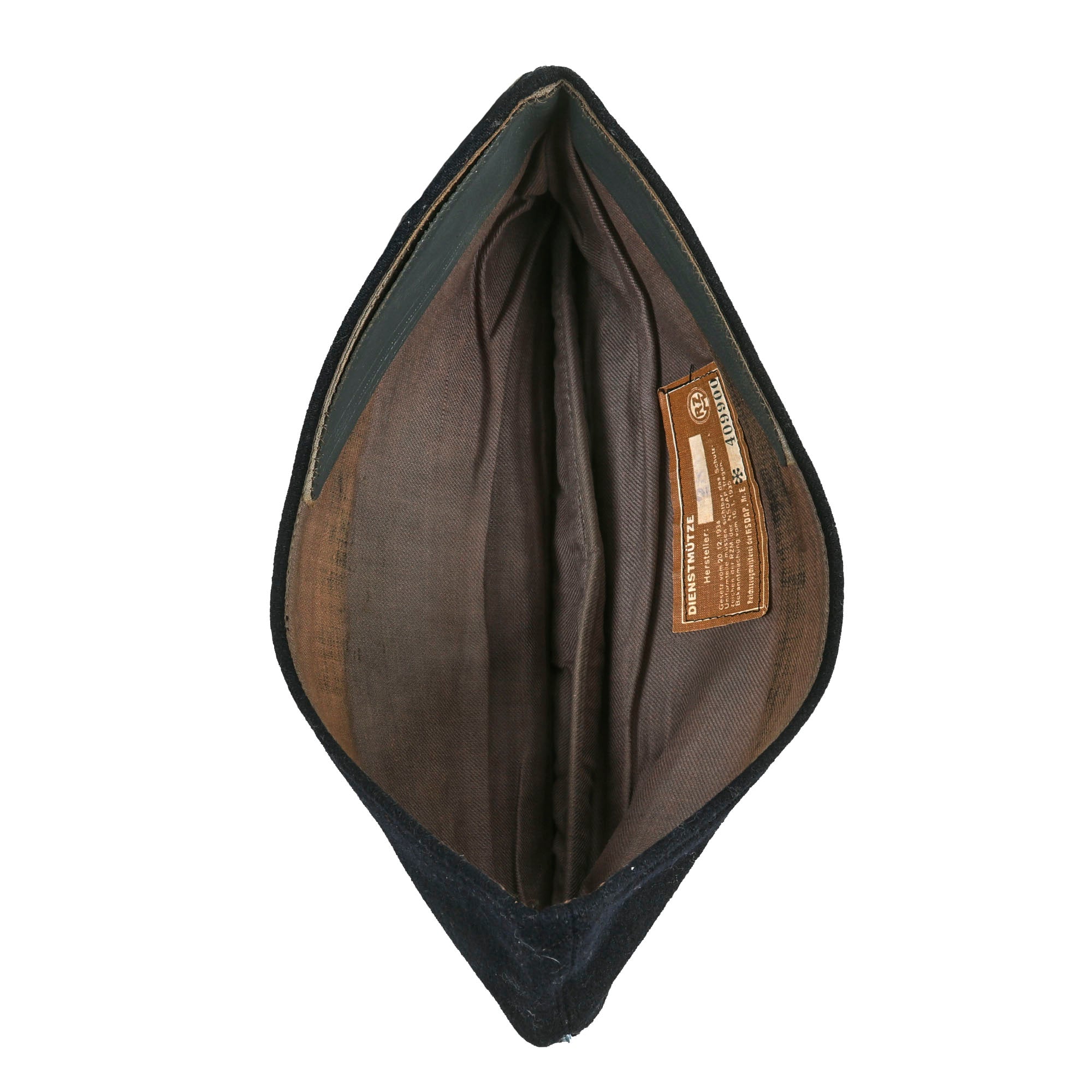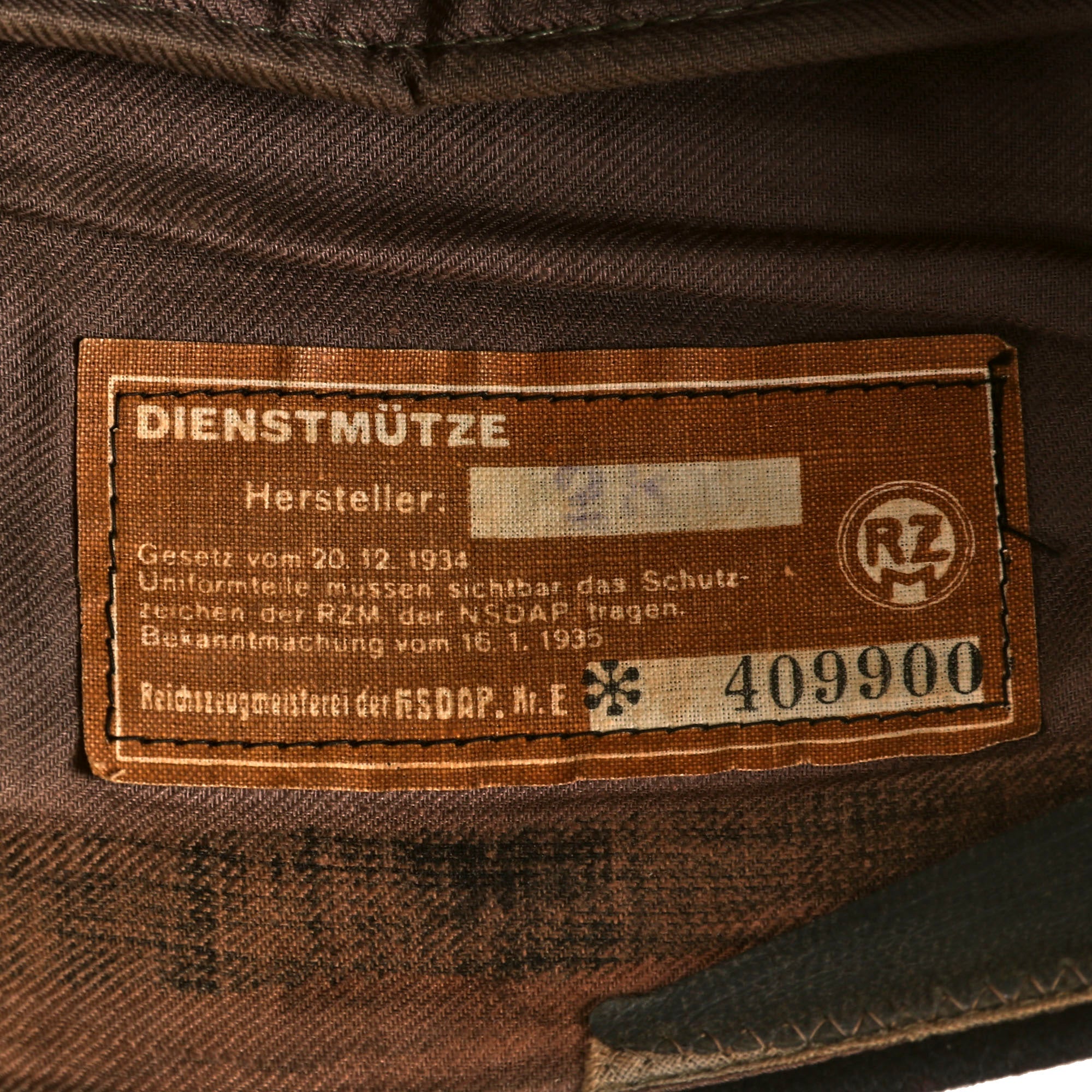 The interior lining of the cap is a black rayon and cotton blend, and it features a wonderful original RZM Tag identifying the cap as a DIENSTMÜTZE (service cap). It is marked with lot number Nr. 409900, and gives the Hersteller (manufacturer) as 28. The contract date appears to be 16.1.1935. The small sweatband at the front of the interior is losing some of its stitching. The sweatband also has an embossed maker’s label.
