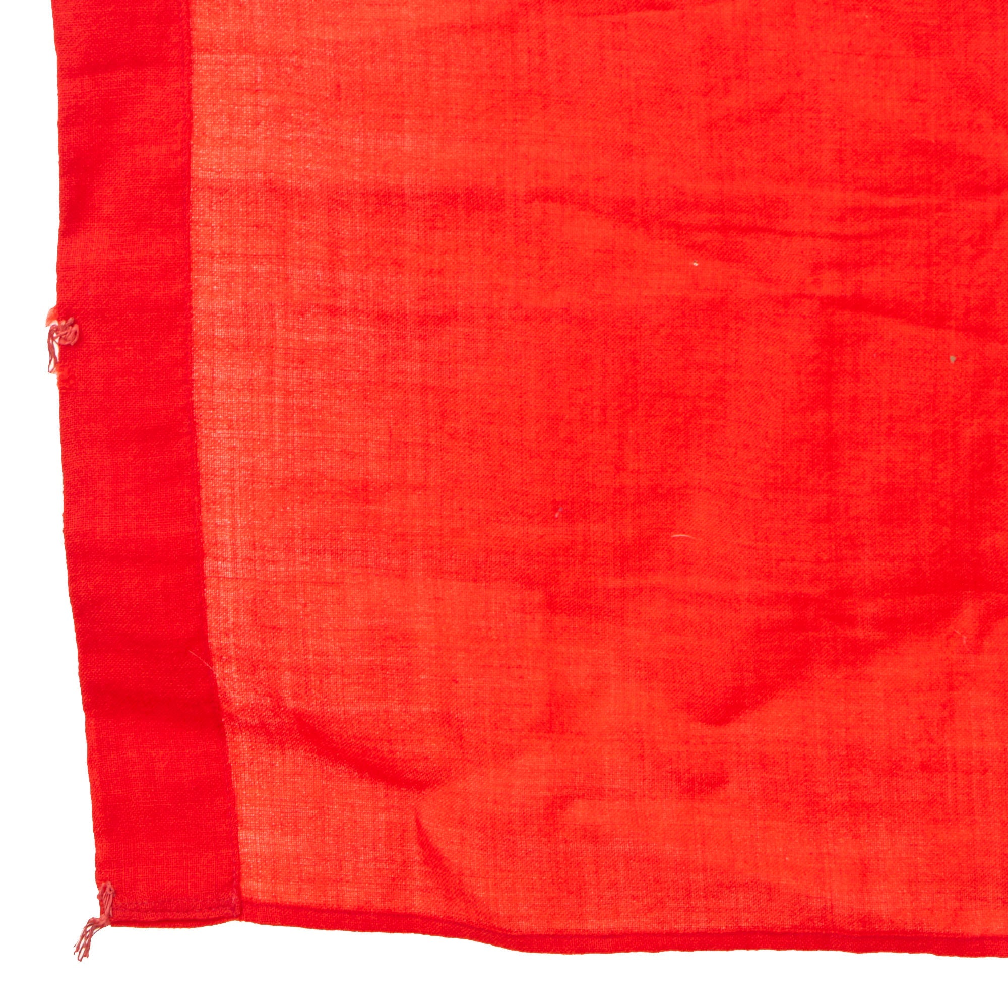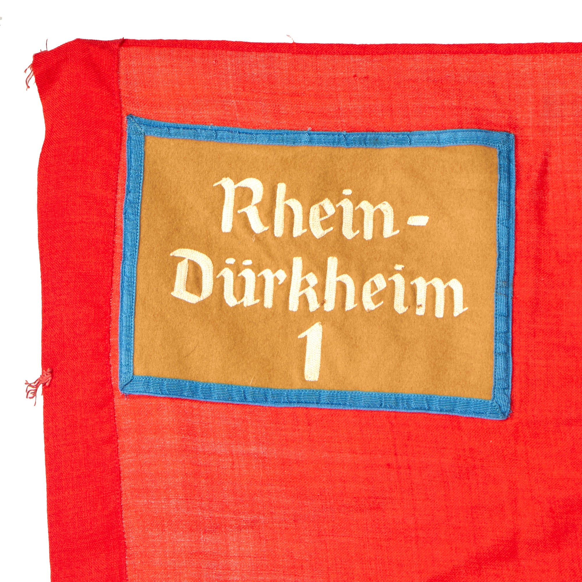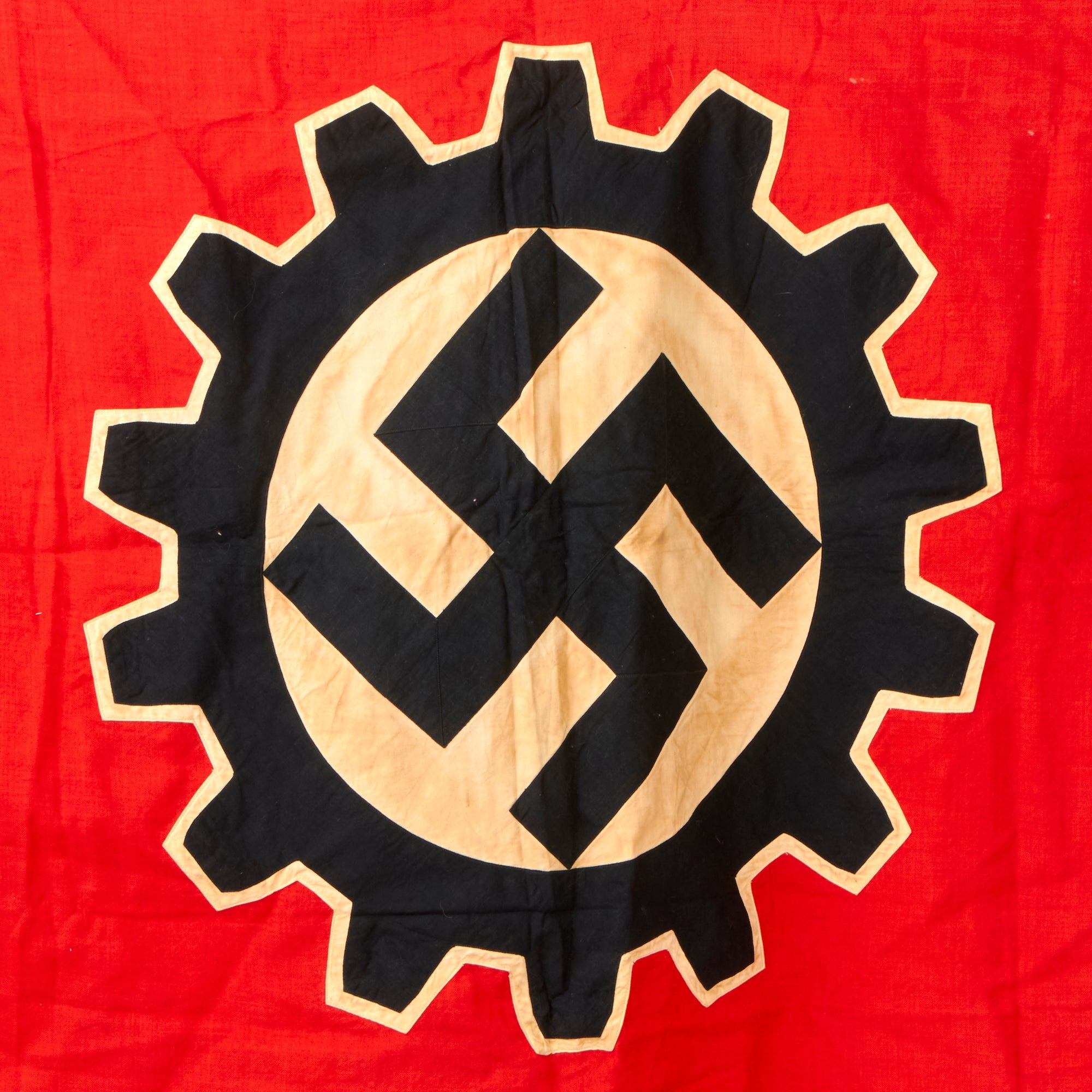 Original Item: Only One Available. The DAF (Deutsche Arbeitsfront or German Labor Front) was a National Socialist trade union that supplanted independent unions once the NSDAPs had come to power in Germany. This 46" x 54" Standard Flag was most likely originally displayed on a pole inside DAF offices. It appears to be made of woven red wool, with cotton white and black multi-piece DAF emblems on each side. Unlike many we see, there is no fringe on the edges. It originally had 7 metal hanger rings installed on the header used to secure it to a pole, however all are now missing, with only some stitching remaining where they were originally attached.