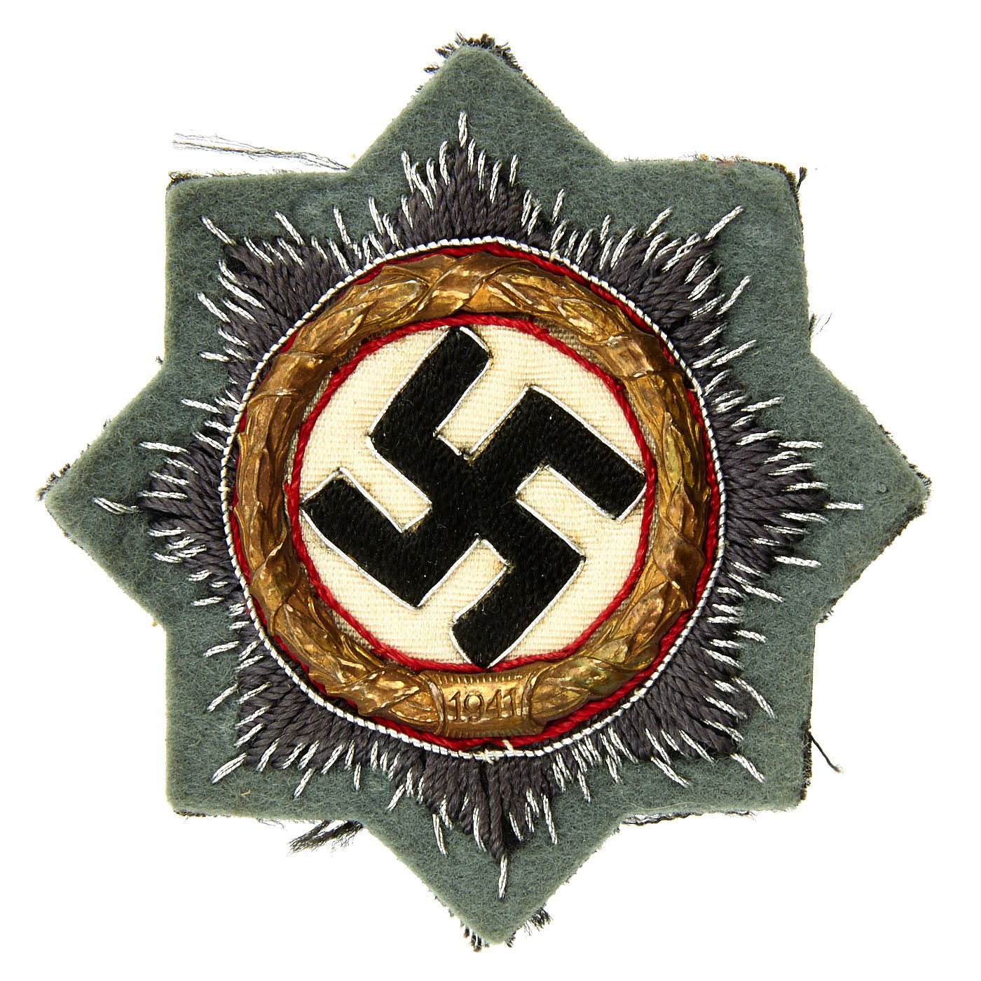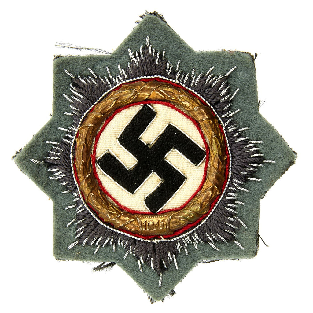 Original Items: Only One Available. This is a very nice example of a German WWII "German Cross" in Gold award, issued as a cloth embroidered badge for use on the uniform. The award was introduced on September 28th 1941, a few months after the start of operation Barbarossa, the invasion of the Soviet Union. The German forces were achieving significant progress in the Eastern front. The assault on Moscow (Operation Typhoon) started two days after the German Cross on Gold award was instated. Plenty of soldiers would have the opportunity to prove themselves in the face of adverse conditions in years to come.