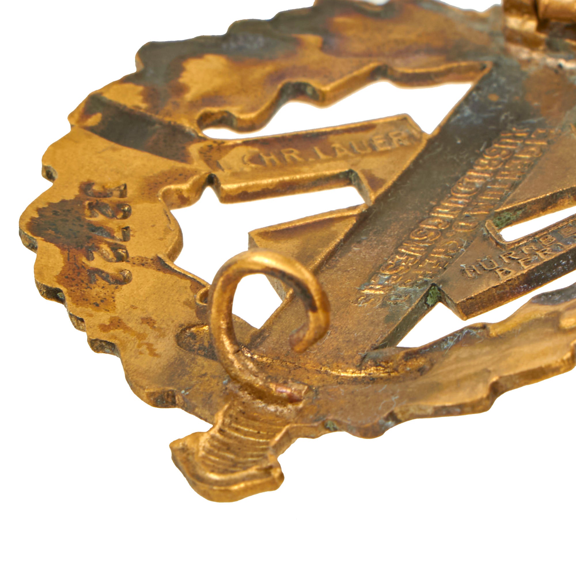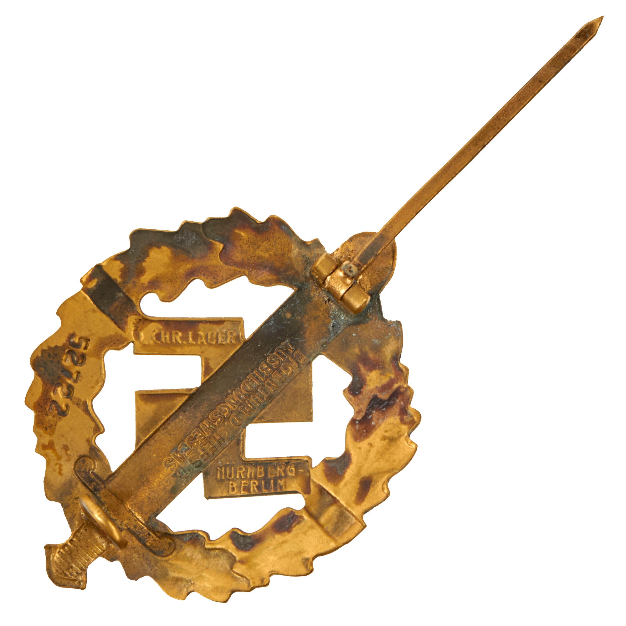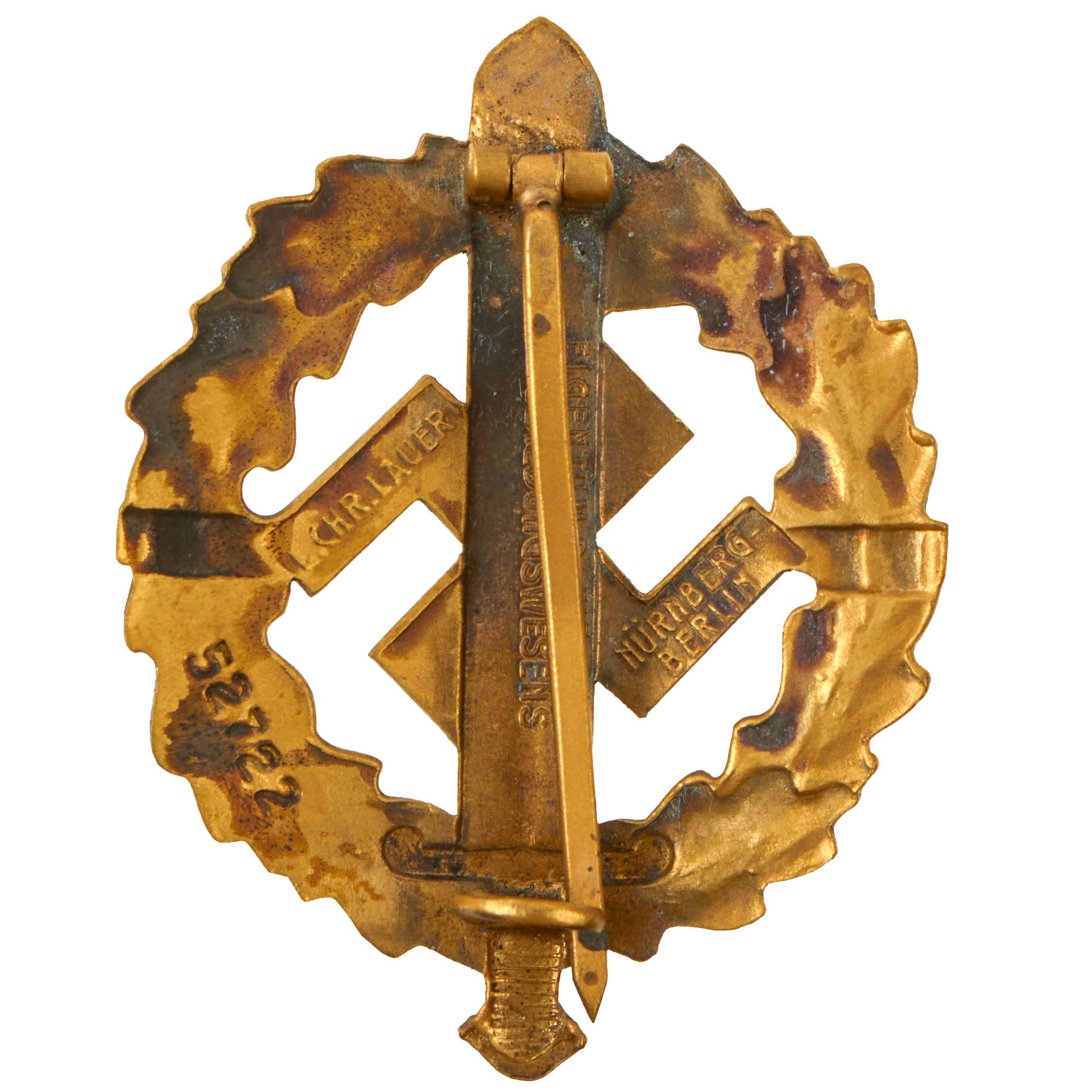 Original Item: Only One Available. This is a very good condition SA Sports Badge in Gold Grade, the highest grade awarded. It looks to be manufactured from stamped brass, which was then covered with a gold wash, which may be brass powder paint. It is maker marked on the back by L. CHR. Lauer / NÜRNBERG - BERLIN on the arms of the swas, and the lower left rear is marked with issue number 52722.