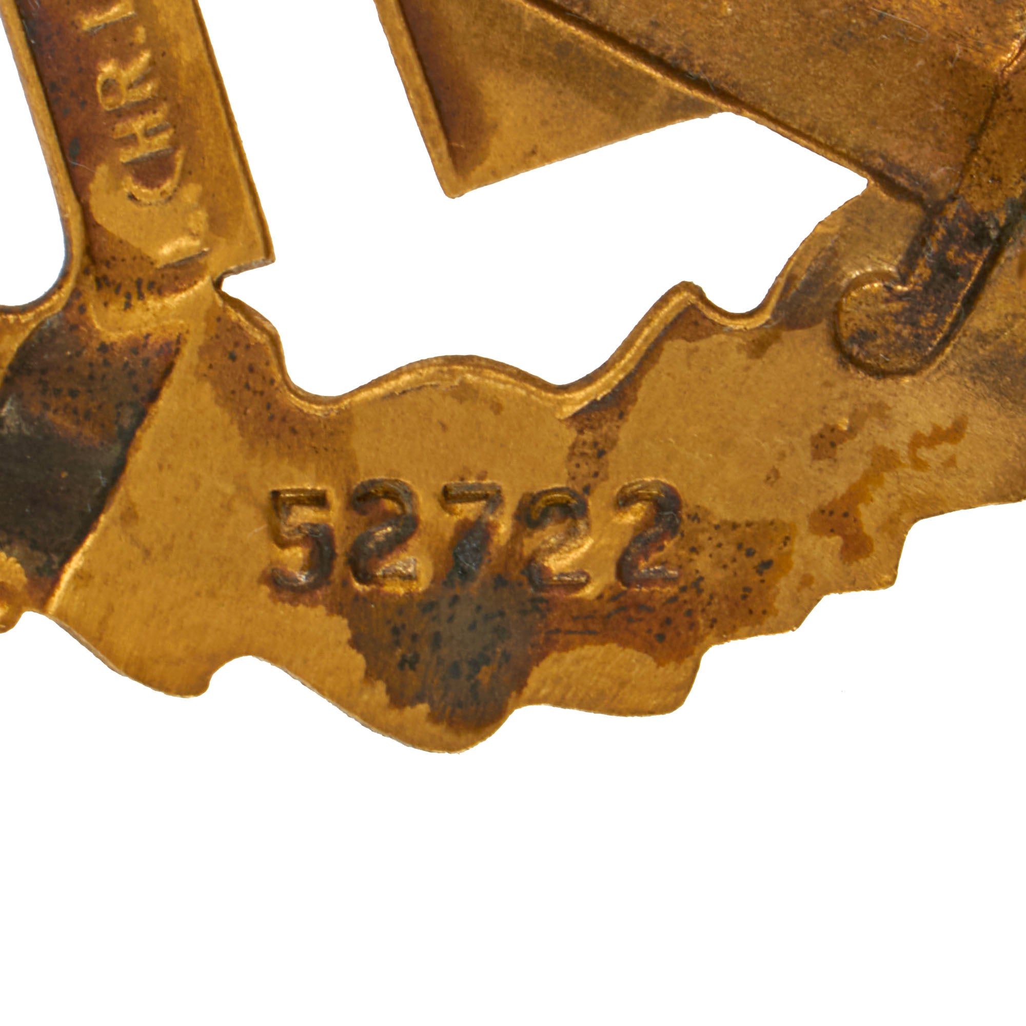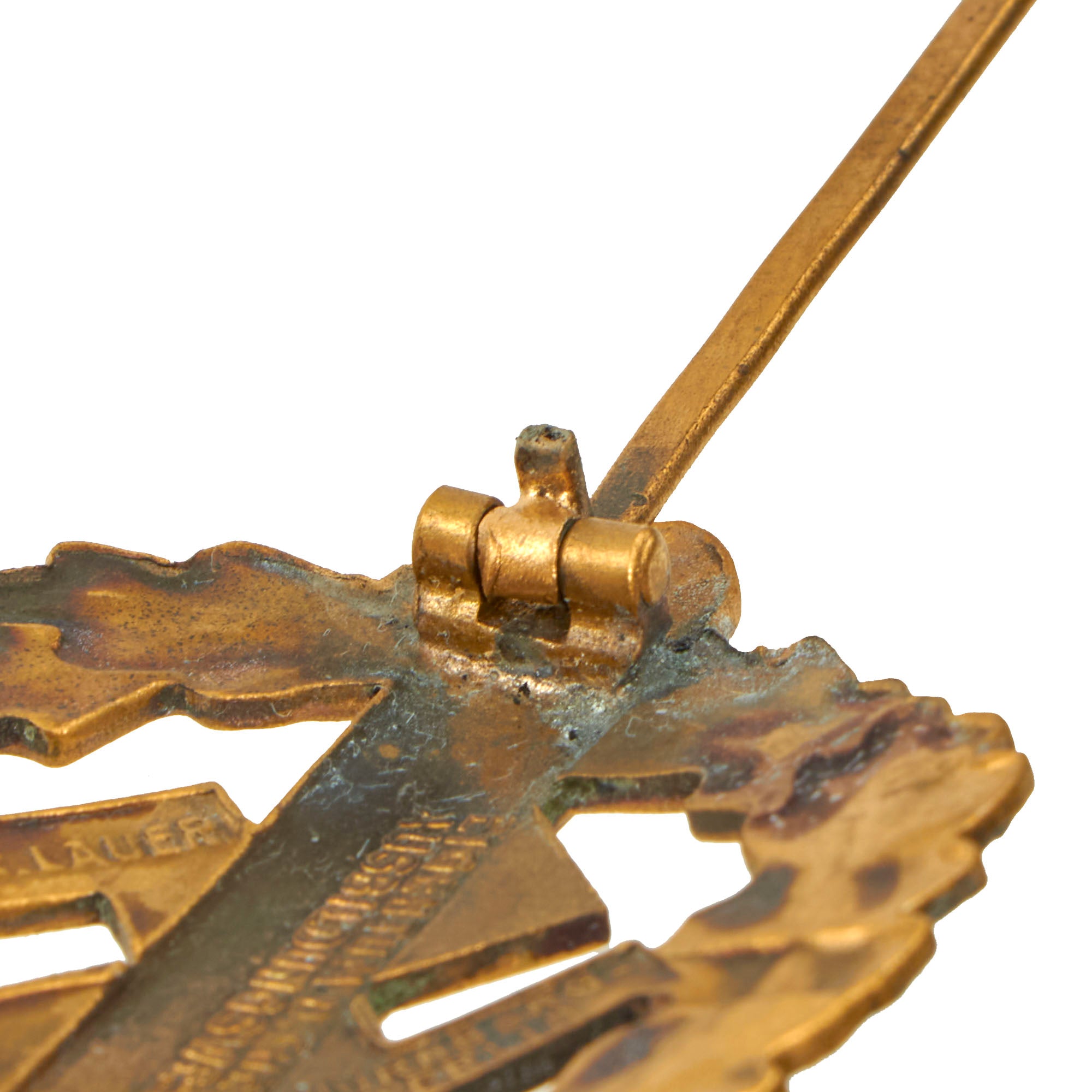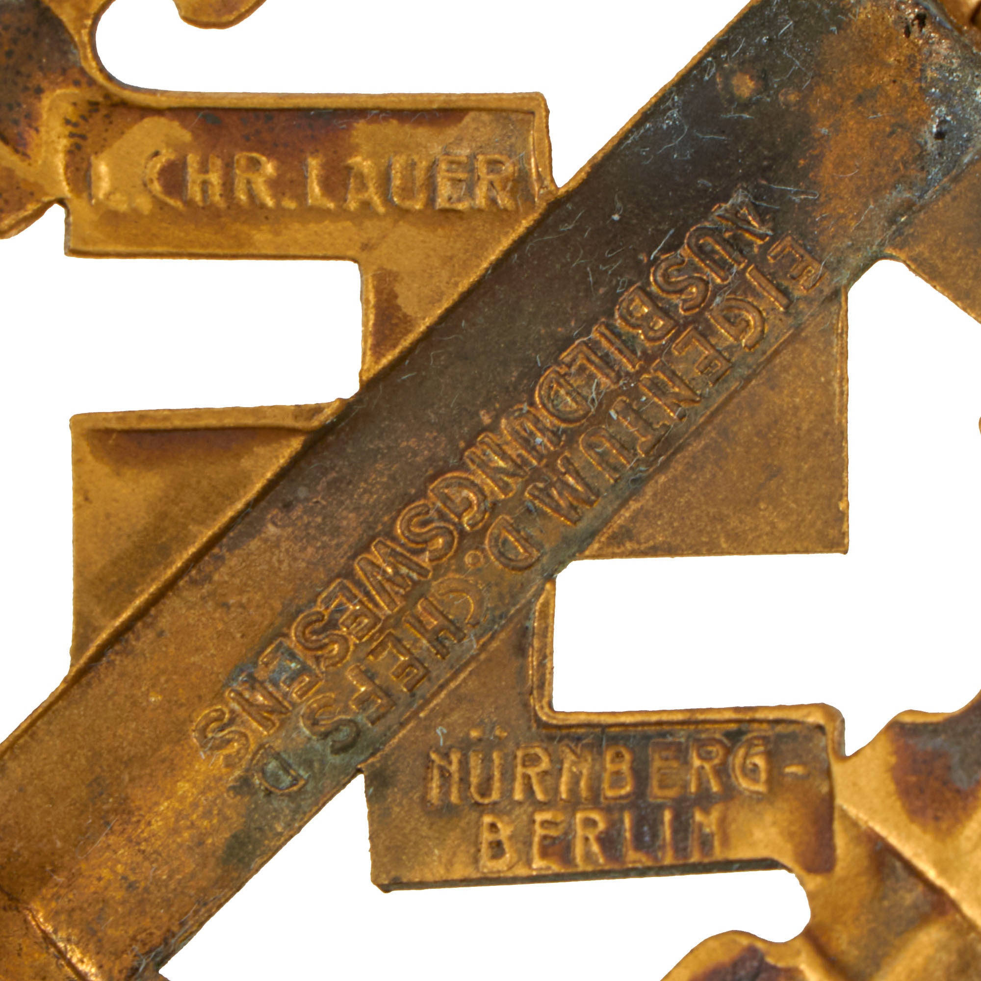 Original Item: Only One Available. This is a very good condition SA Sports Badge in Gold Grade, the highest grade awarded. It looks to be manufactured from stamped brass, which was then covered with a gold wash, which may be brass powder paint. It is maker marked on the back by L. CHR. Lauer / NÜRNBERG - BERLIN on the arms of the swas, and the lower left rear is marked with issue number 52722.