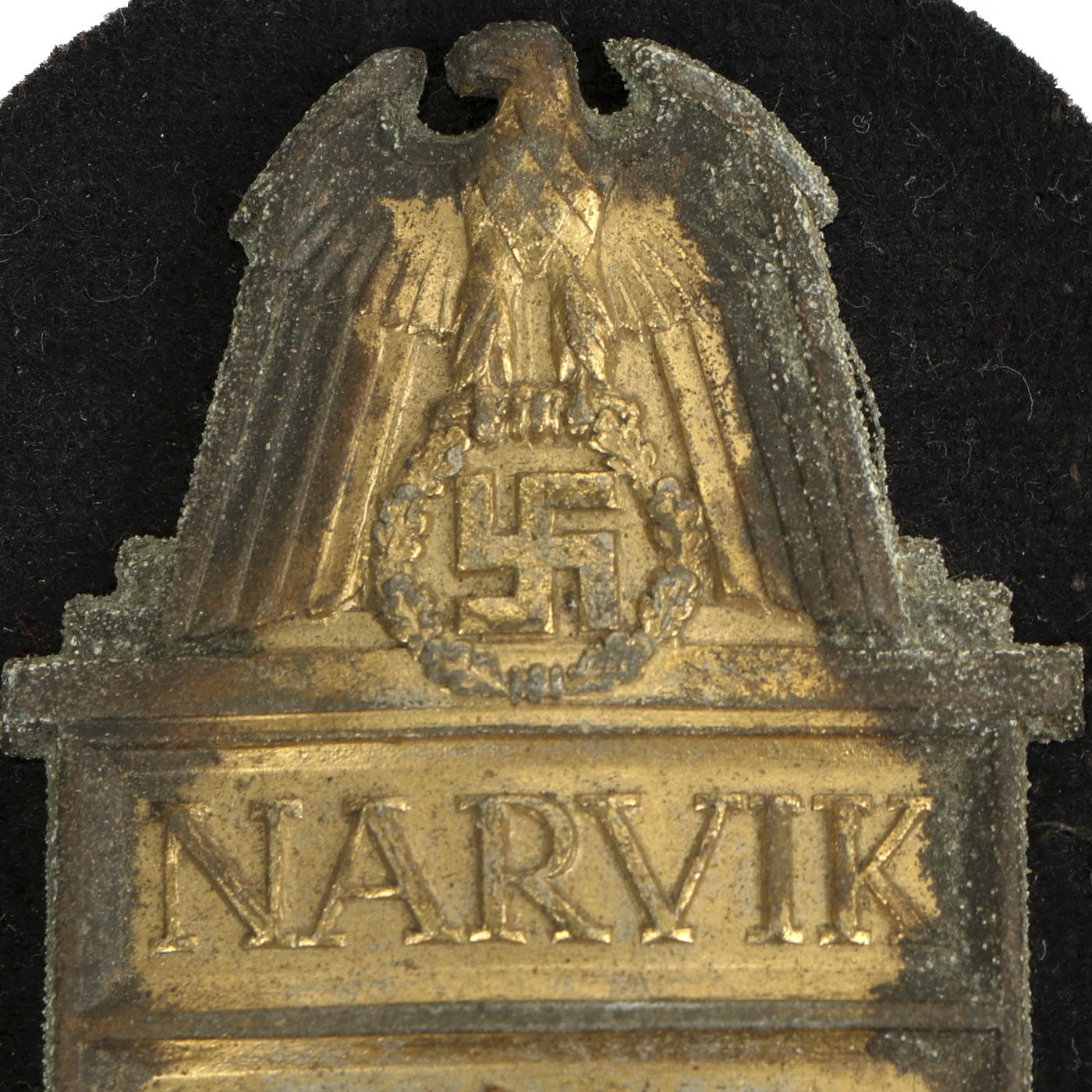Original Item: Only One Available. The Narvik Shield (German: Narvikschild) was a World War II German military decoration awarded to all German forces that took part in the battles of Narvik between 9 April and 8 June 1940. It was instituted on 19 August 1940 by AH. The Oberkommando der Wehrmacht (OKW or Armed Forces High Command) published the order the same day. A total of 8,577 military personnel received the award. It was bestowed by General Eduard Dietl, the commander of Army Group Narvik.