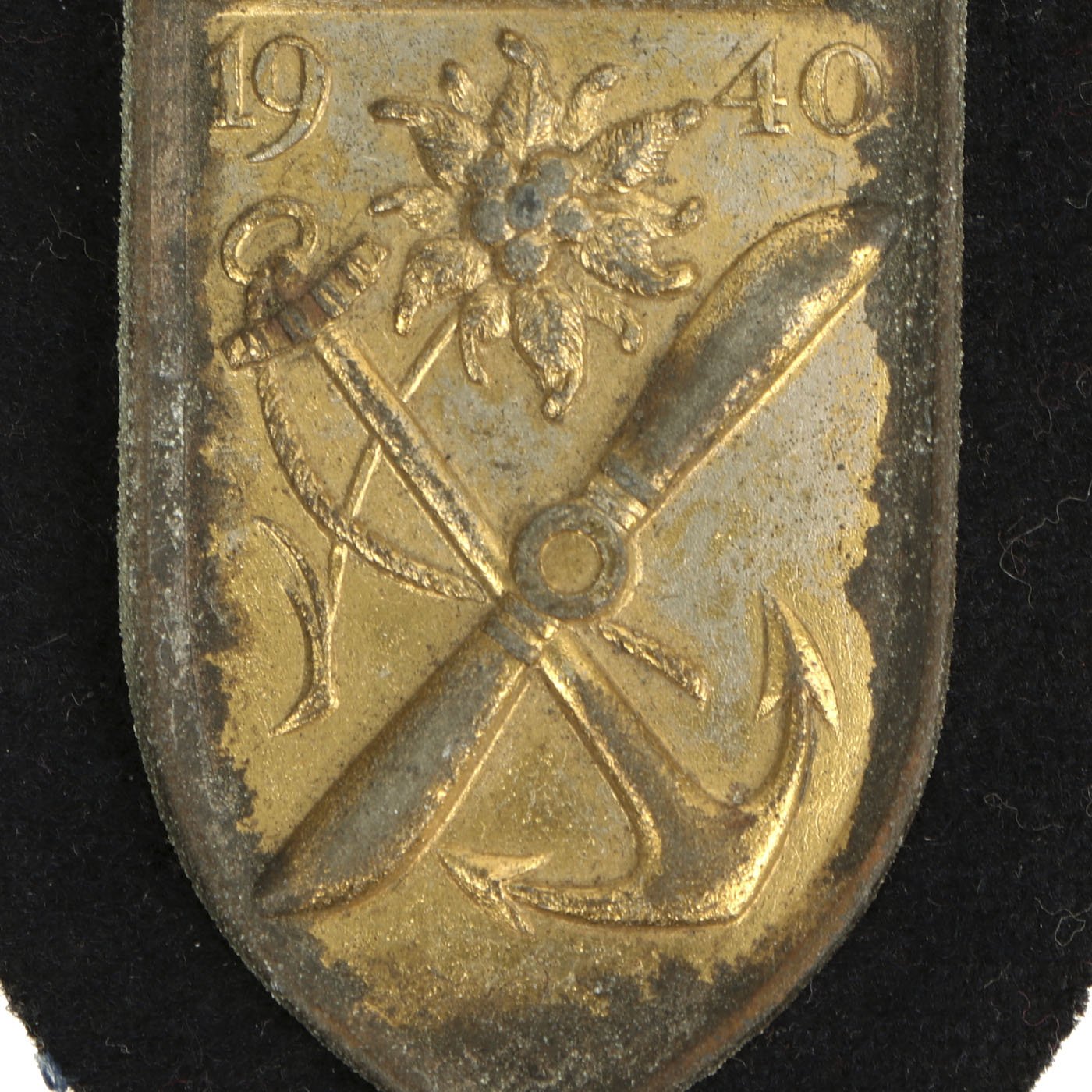 Designed by Professor Dr Richard Klein of Munich, the narrow shield features a pointed bottom and, at its apex, an eagle with down-swept wings clutching a laurel wreath that surrounds a swas. Below this in capital letters is written NARVIK. The body of the shield features an edelweiss (representing the Heer mountain troops), an anchor (representing the Kriegsmarine), and propeller (for the Luftwaffe). The anchor and propeller are crossed, with the edelweiss placed at the top of the X. The numbers 19 and 40 appear at the top corners of the main body of the shield.