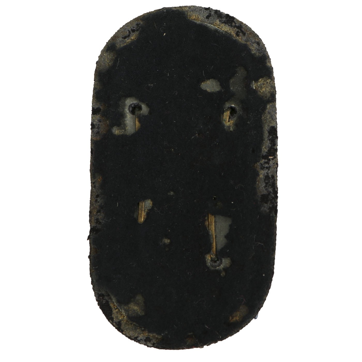 This example is the Gold Washed Zinc version, which is the rare version awarded to Navy Kriegsmarine soldiers. (The Heer and Luftwaffe version was silver in color.) It still has the original backing plate attached, as well as the original black felt fabric it was issued with, which would be installed behind the badge. Unfortunately the felt covering on the backing plate does have moth damage, as shown.